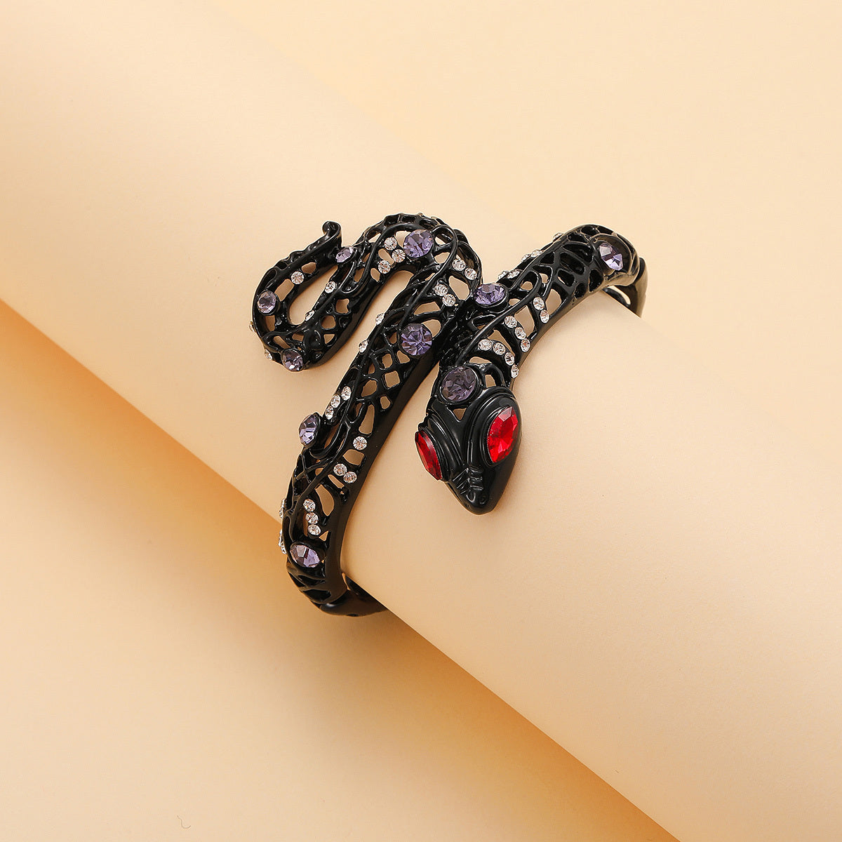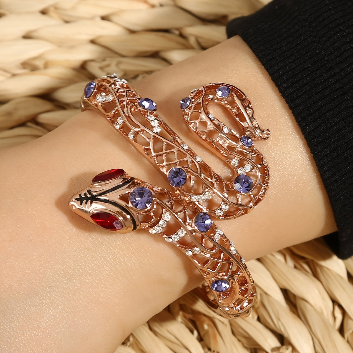 Unique and eye-catching snake bangle bracelet adorned with colorful rhinestones, perfect for daily wear and adding a touch of personality to your outfit.