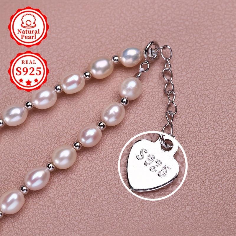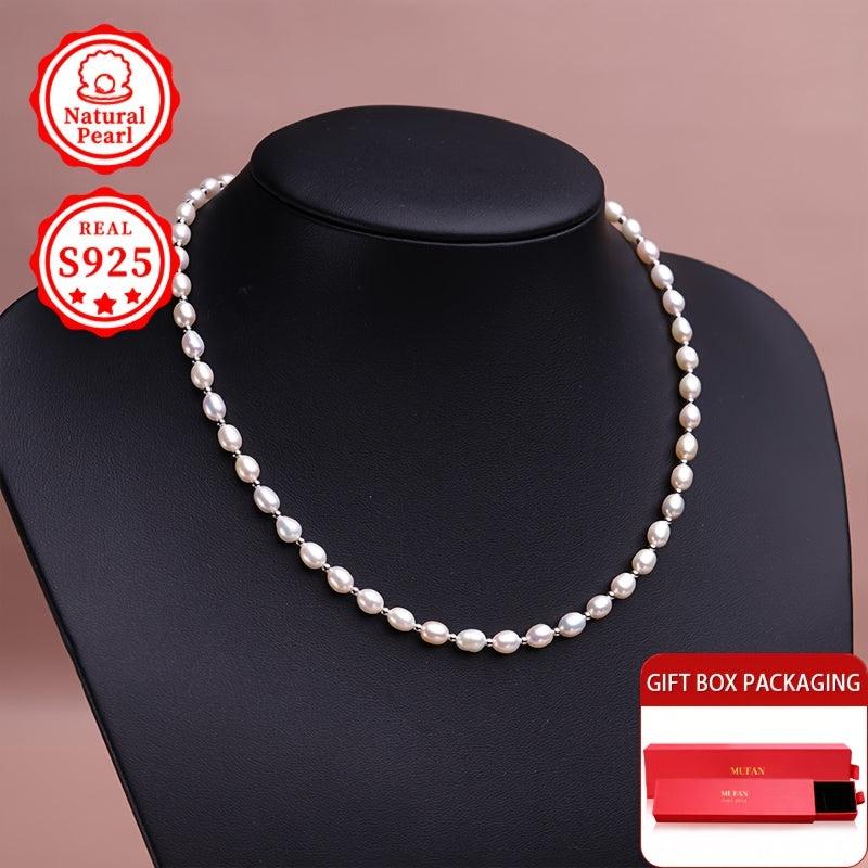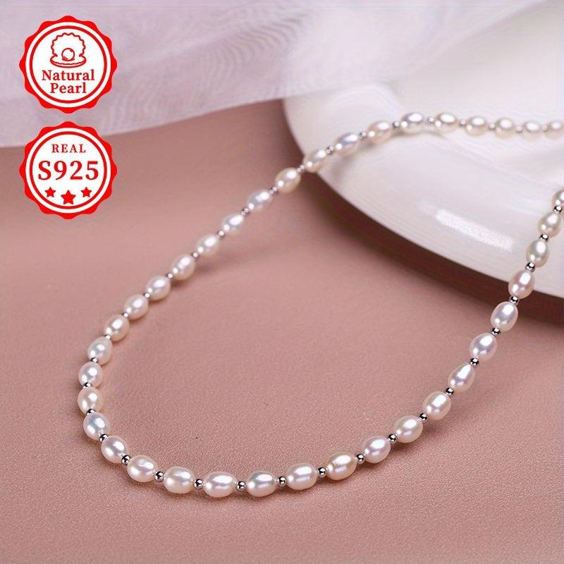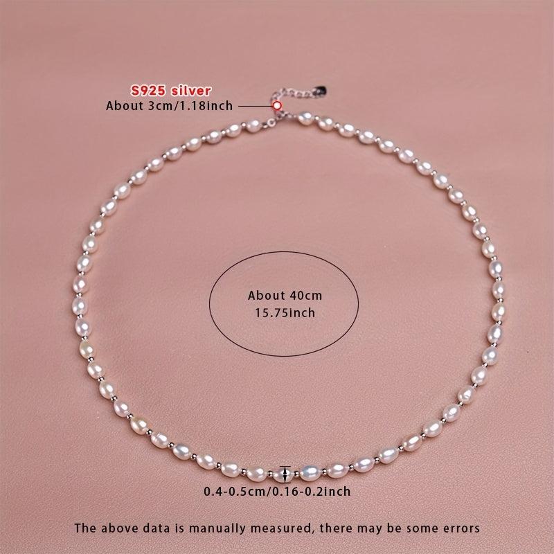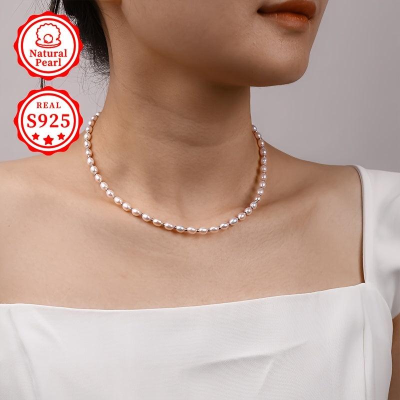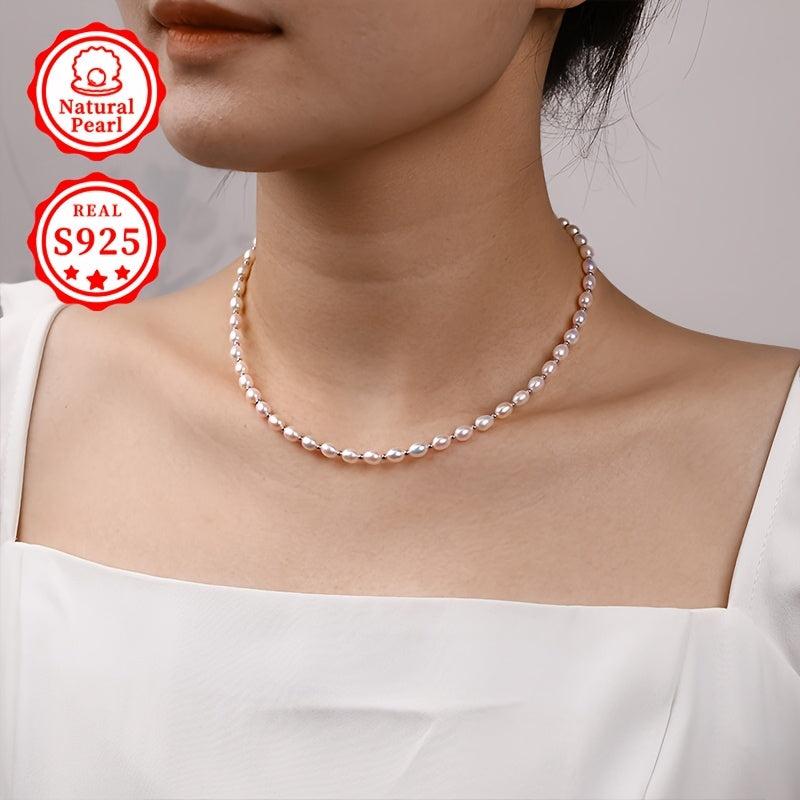 A stylish collar chain showcasing natural 4.5mm rice-shaped freshwater pearls on a S925 silver chain.