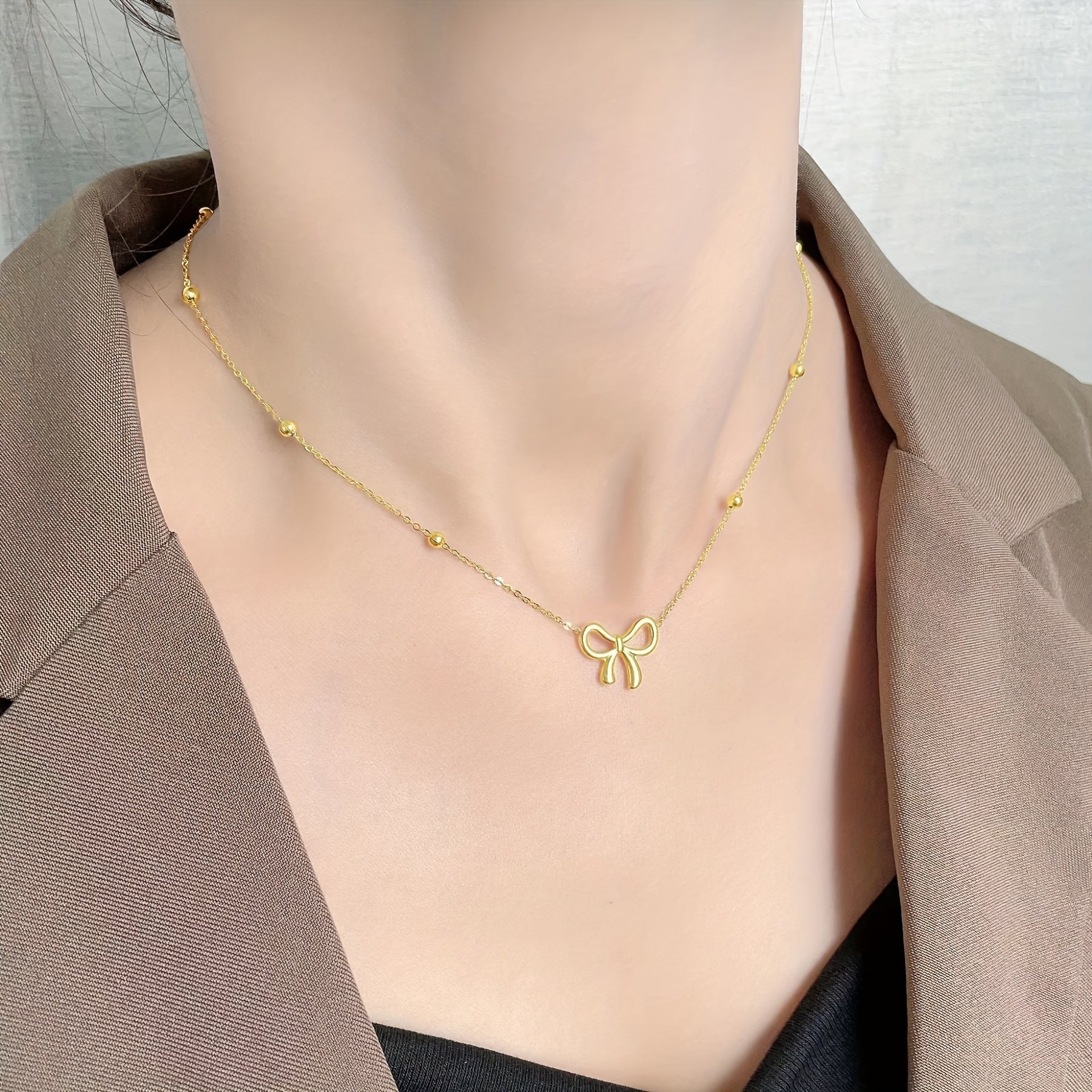 Elegant and versatile necklace featuring a polished bow on a delicate beaded chain. Perfect accessory for casual looks.
