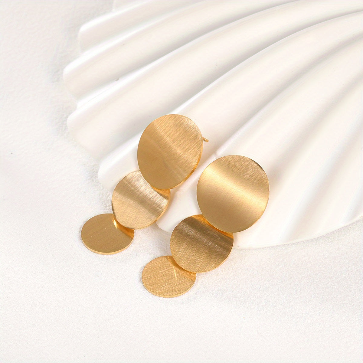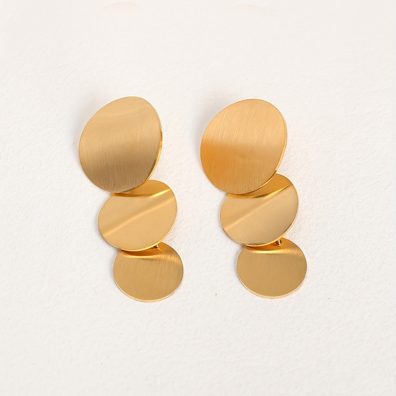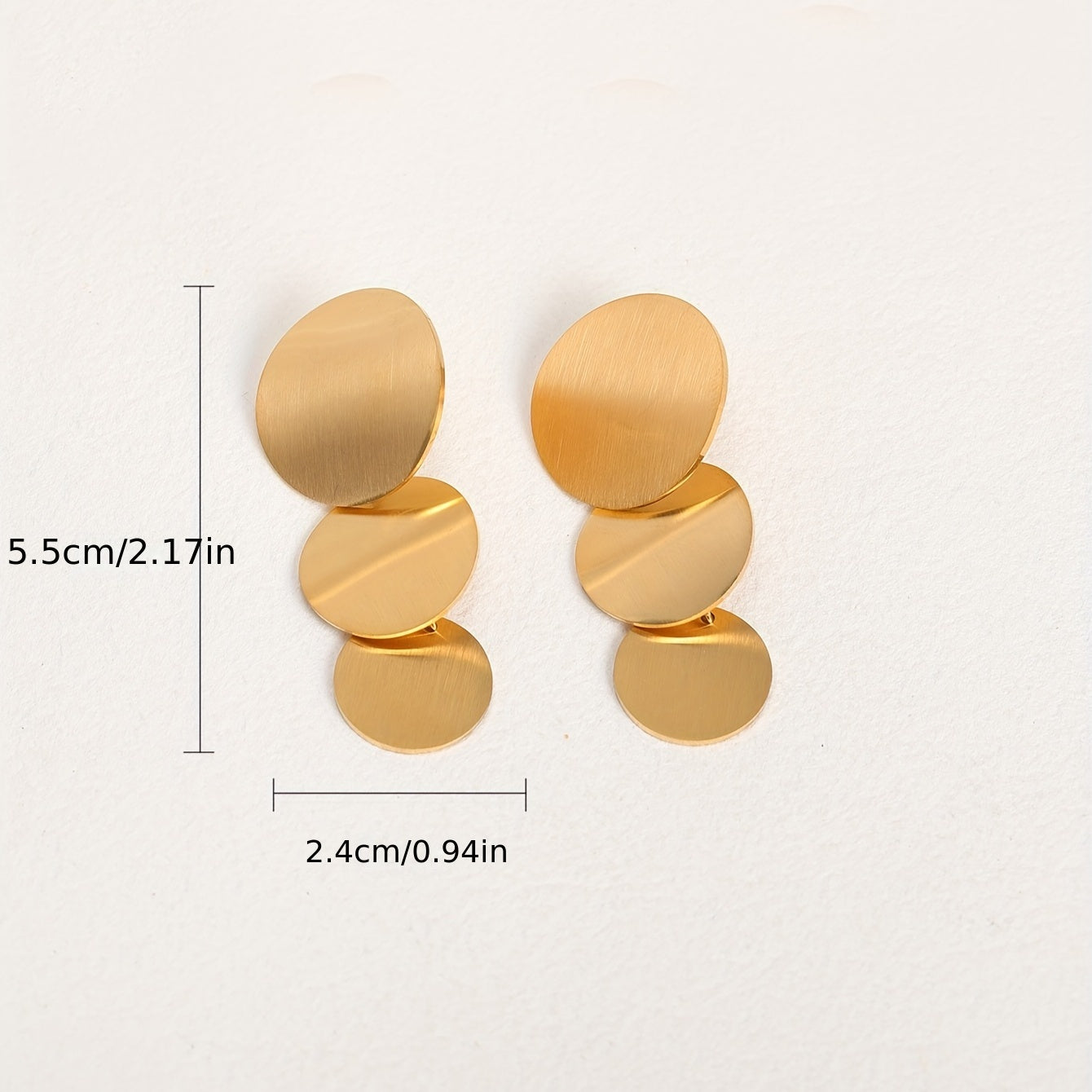 These minimalist style dangle earrings feature a golden silvery round sheet design, perfect for adding a touch of elegance to any outfit. Made of stainless steel with 18K gold plating, these earrings are a great gift for any female in your life.