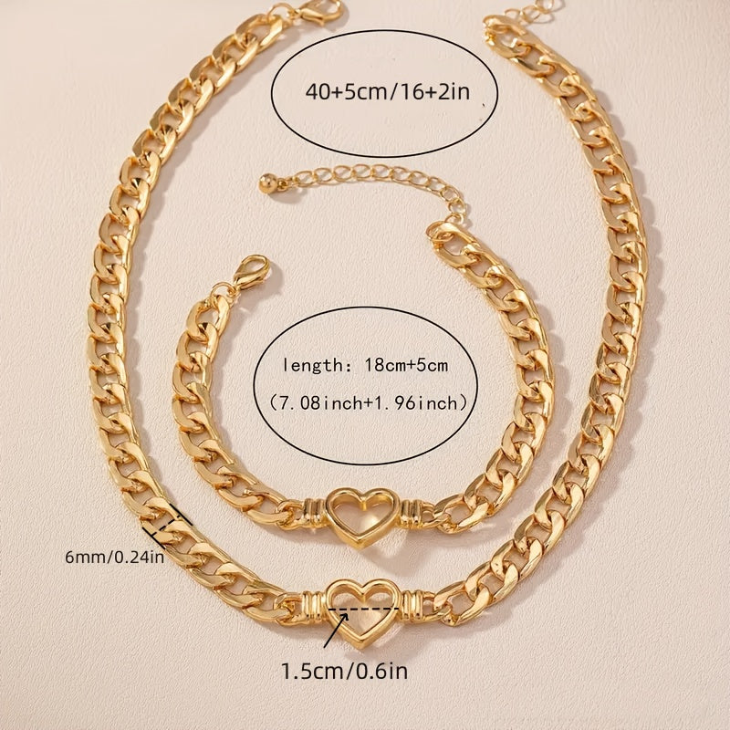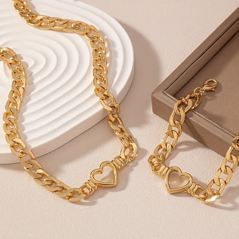 Elegant and stylish stainless steel heart pendant set featuring golden tone bracelet and necklace with sparkling stones, perfect for mother's parties and everyday wear.