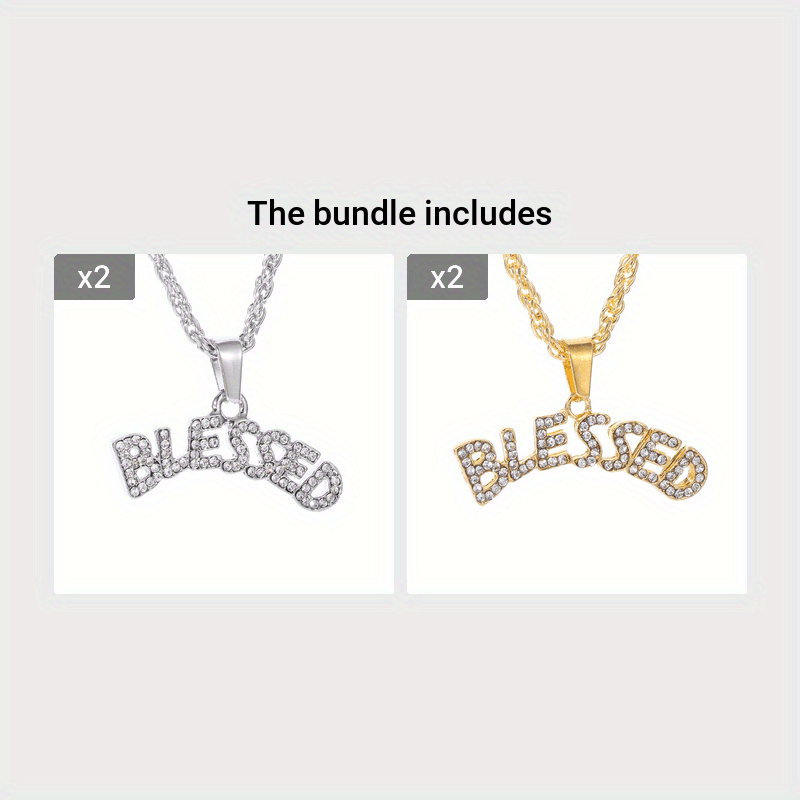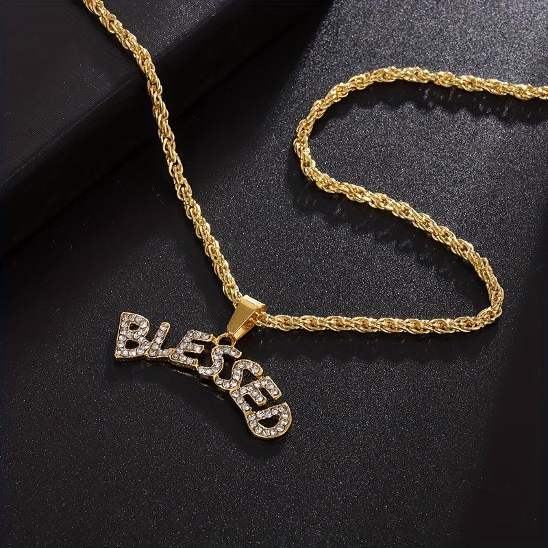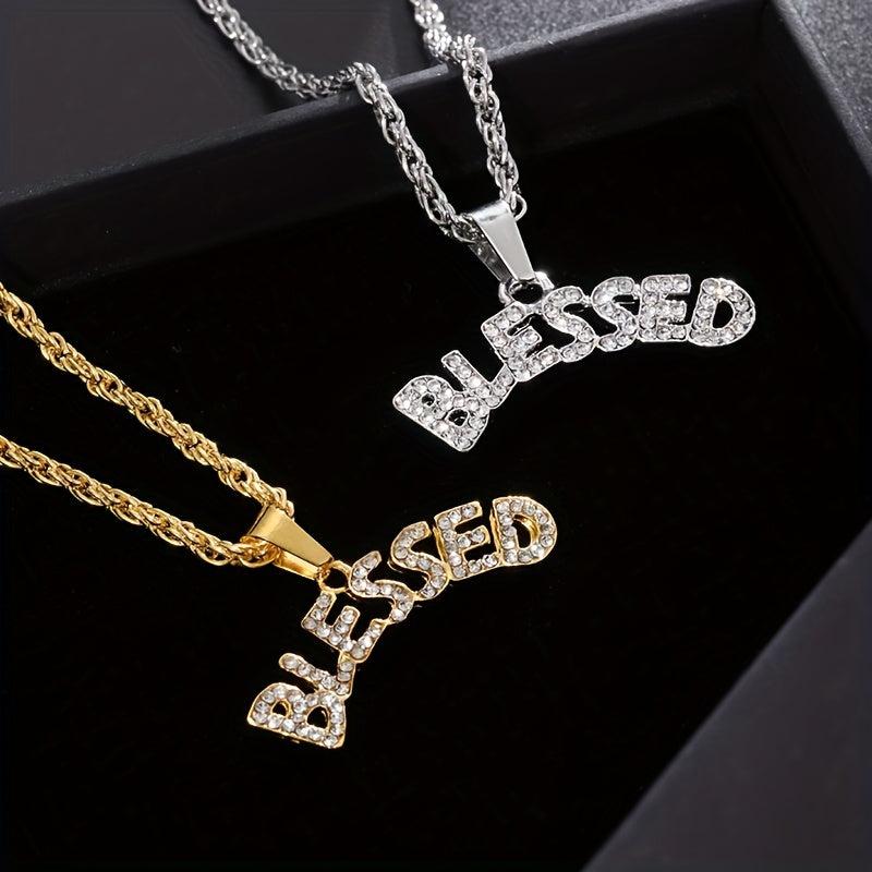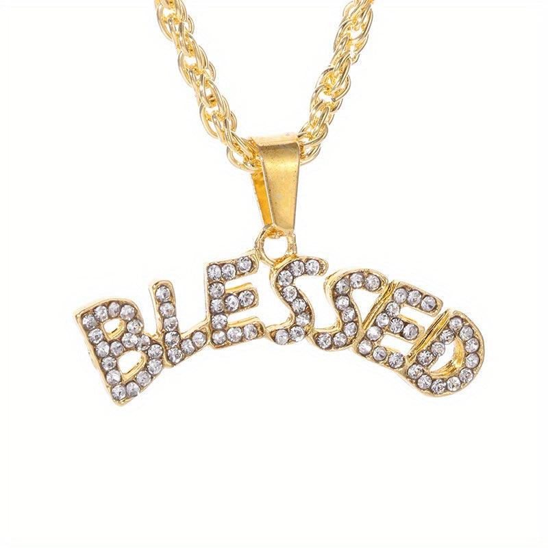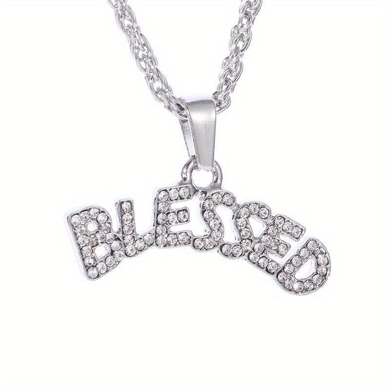 This hip hop pendant necklace features the Blessed letter design with inlaid zirconia stones, perfect for men and women who love punk rock style jewelry.