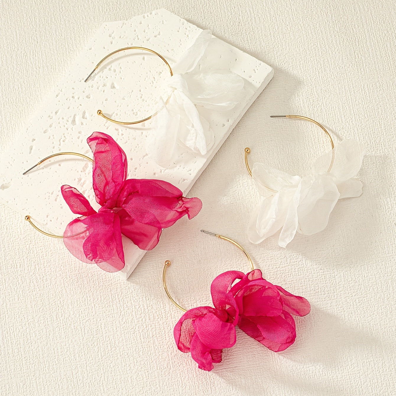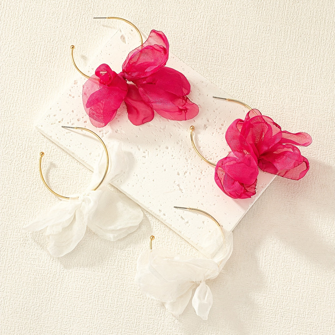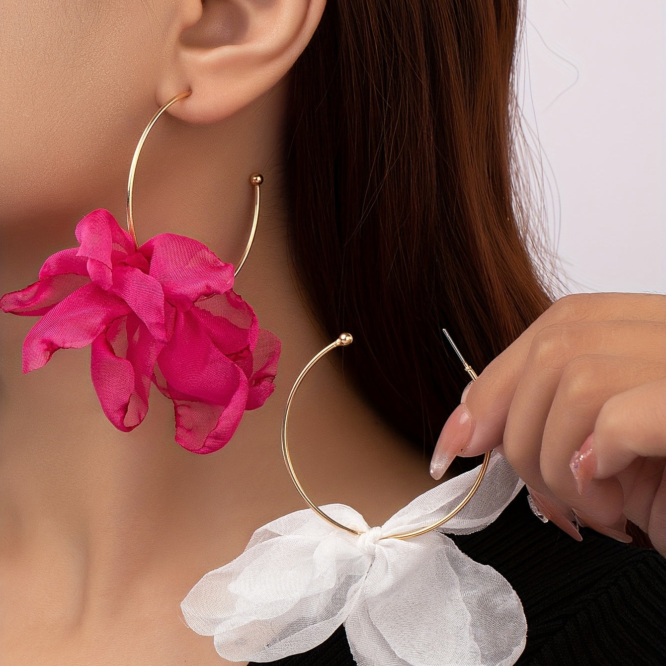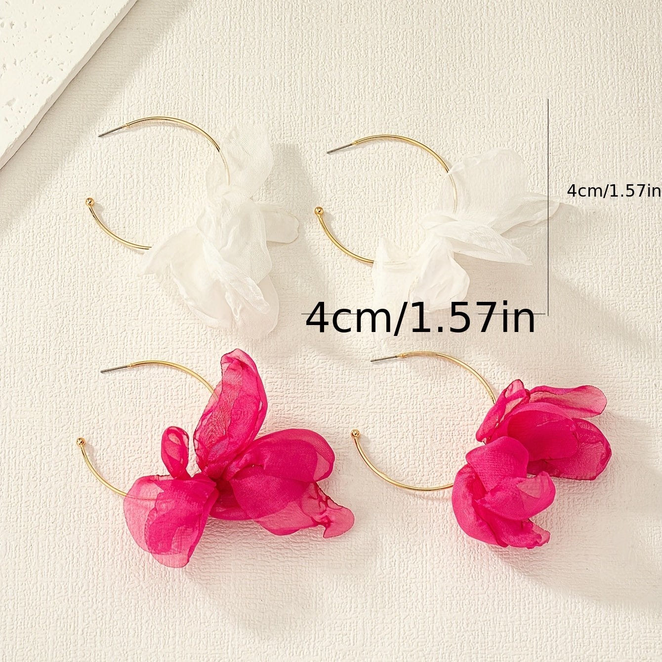 Add a bohemian touch to your look with these fabric flower petal hoop earrings set. Perfect for vocation or special occasions.