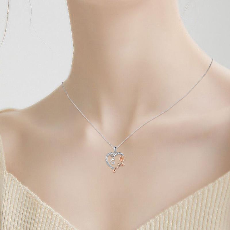 This personalised initial necklace features a roseflower heart design made of sterling silver. A perfect gift for women and girls.