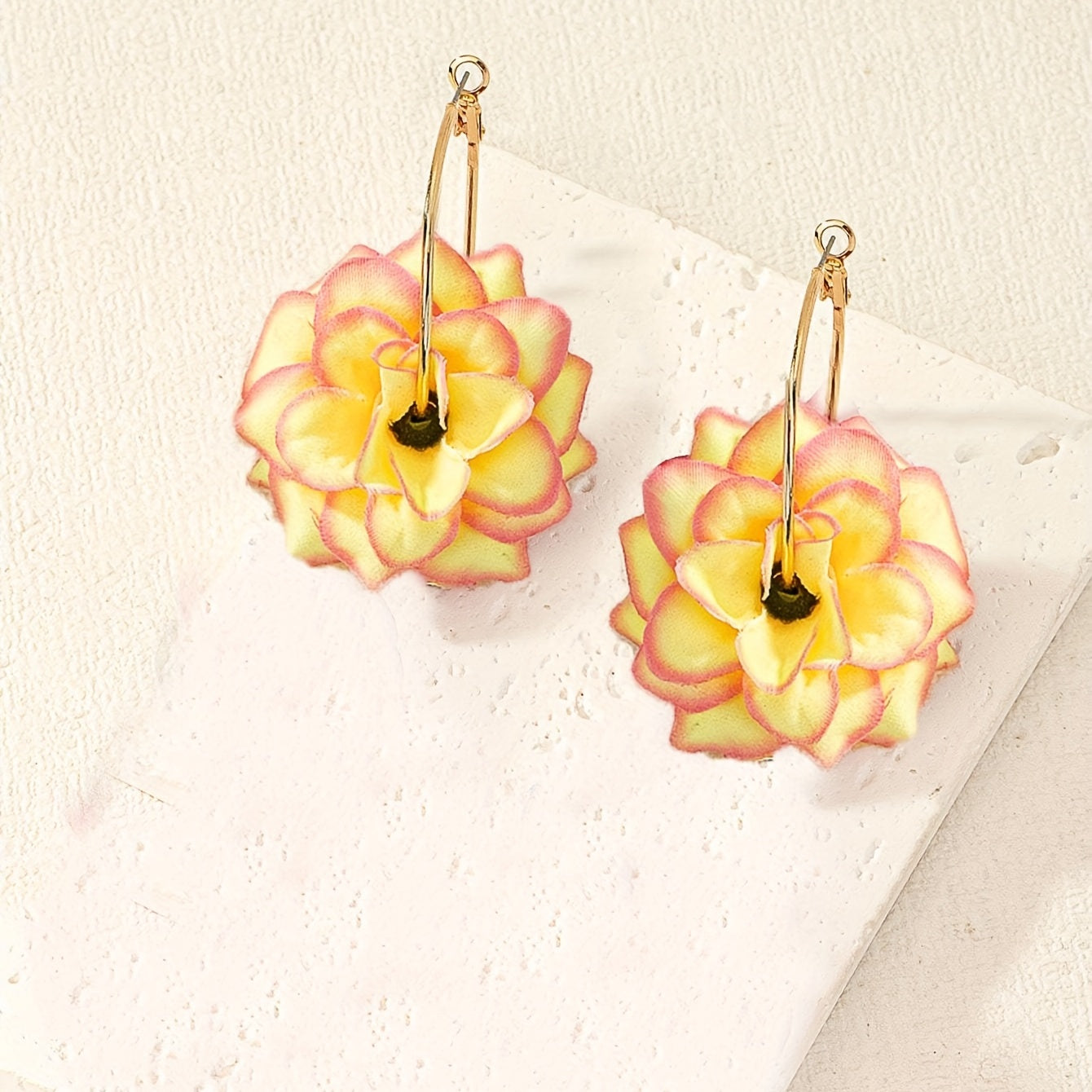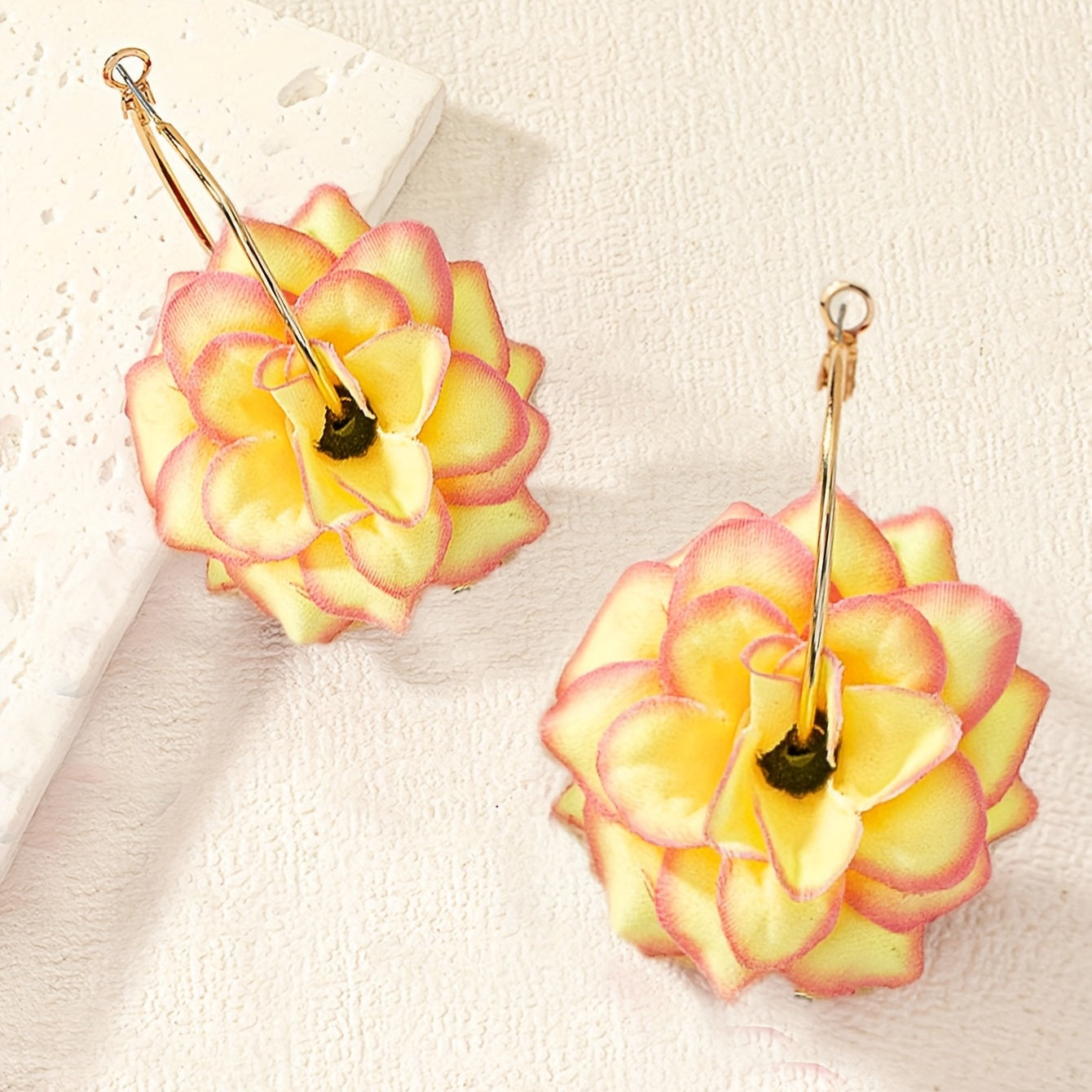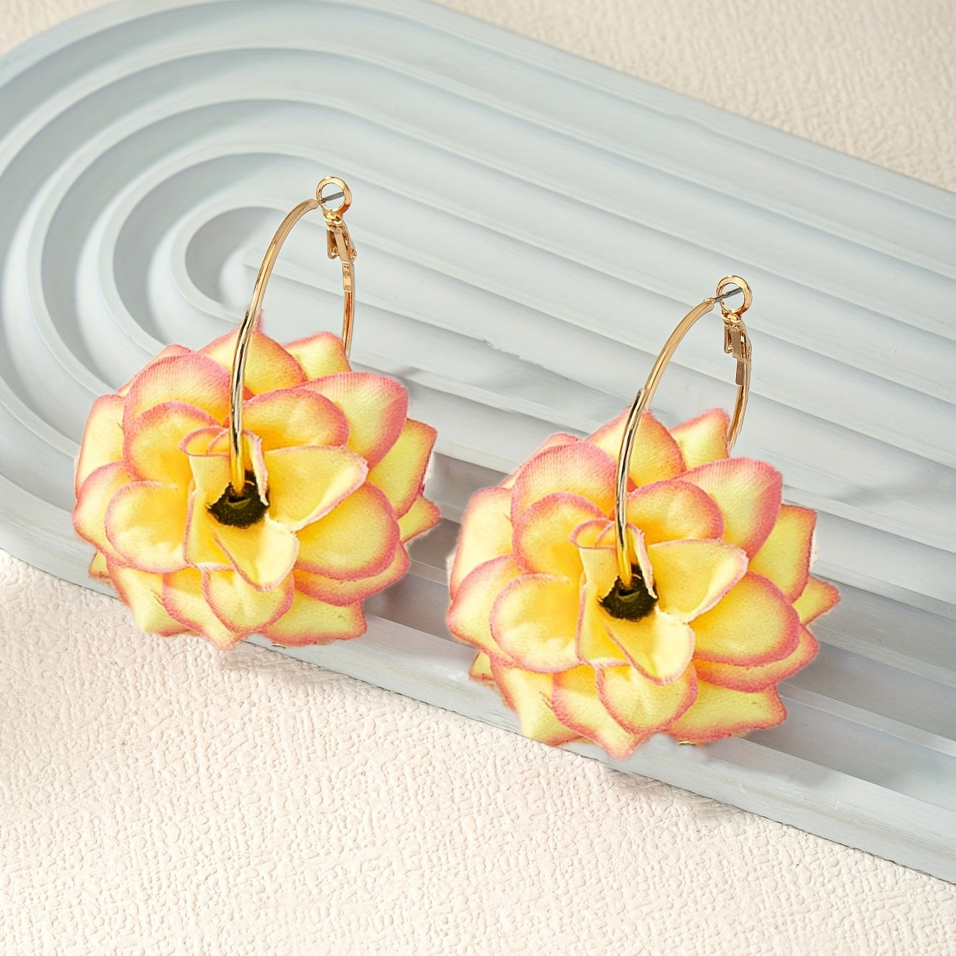Add a pop of color and bohemian flair to your look with these red and yellow exaggerated fabric flower hoop earrings. These earrings are perfect for adding a touch of sexy style to any outfit.