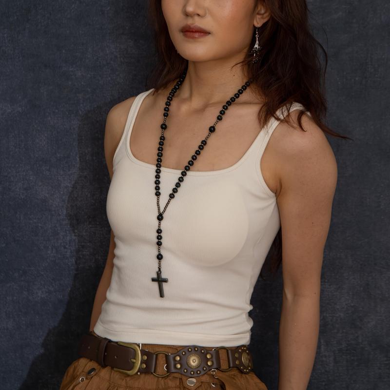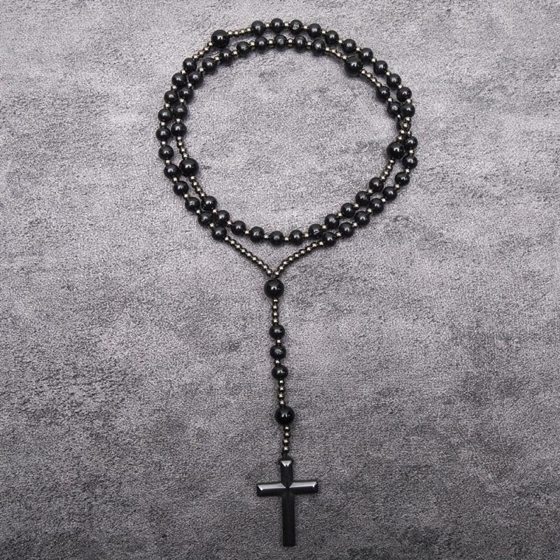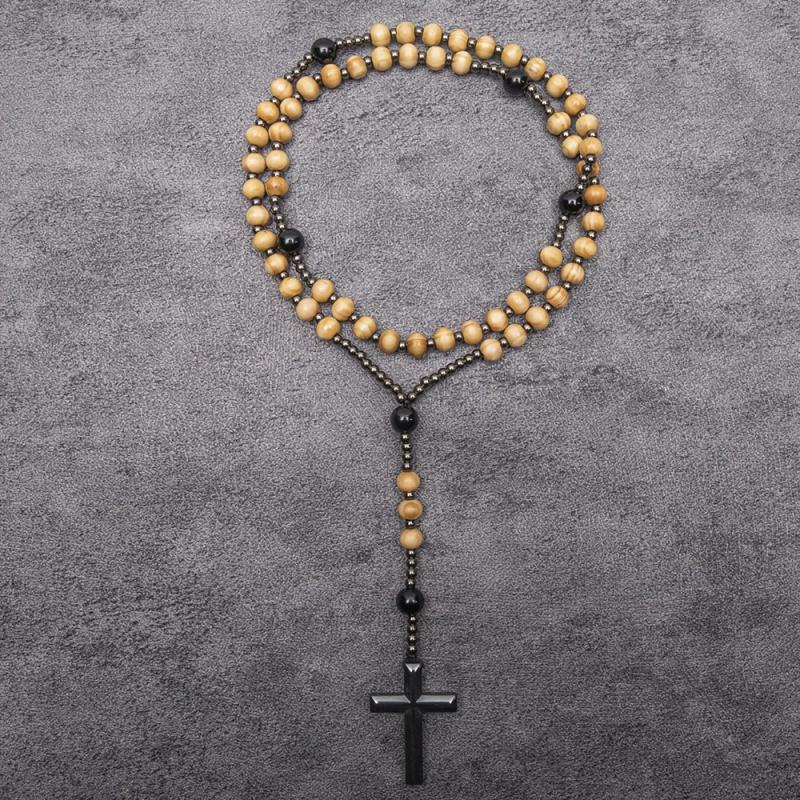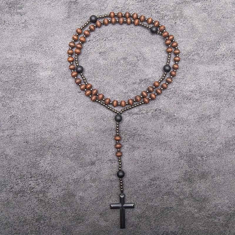 This religious necklace features a cross pendant with beads made of regenerated wood and stone. Perfect for daily wear and as a spiritual gift.