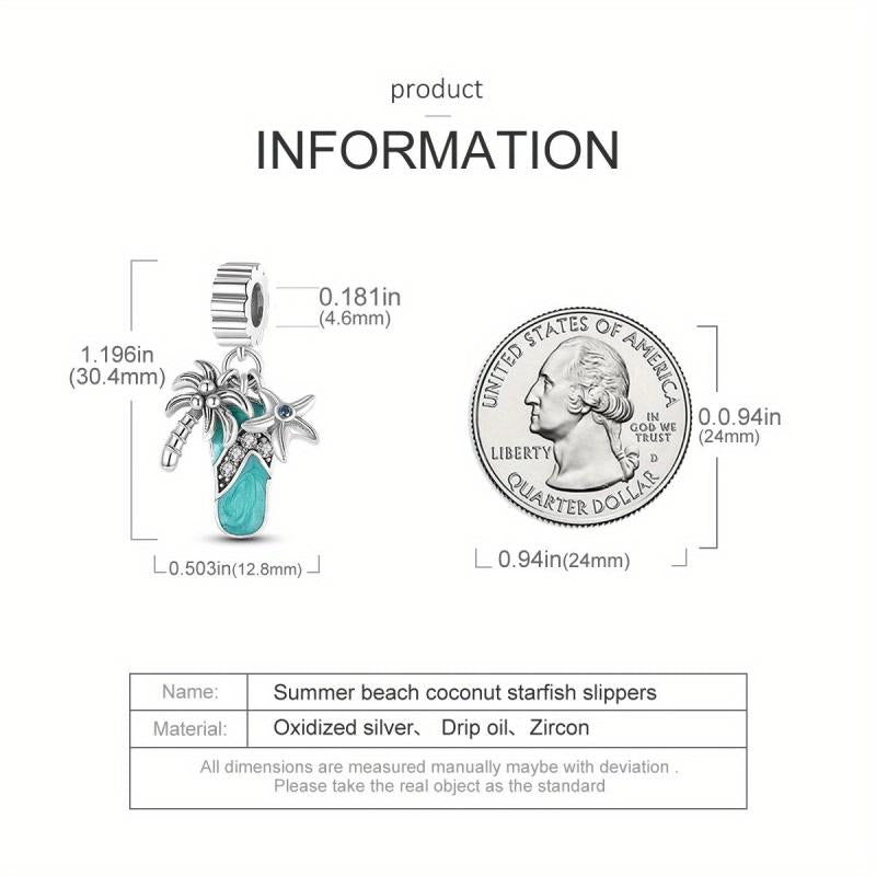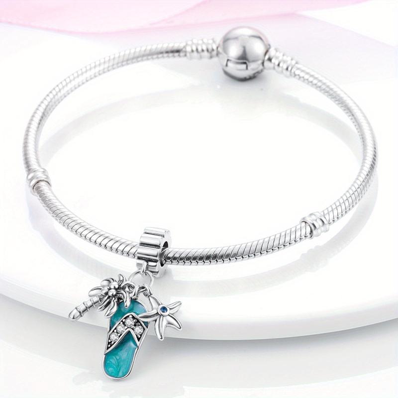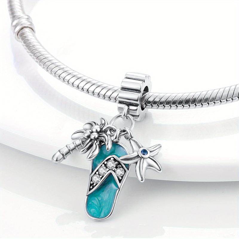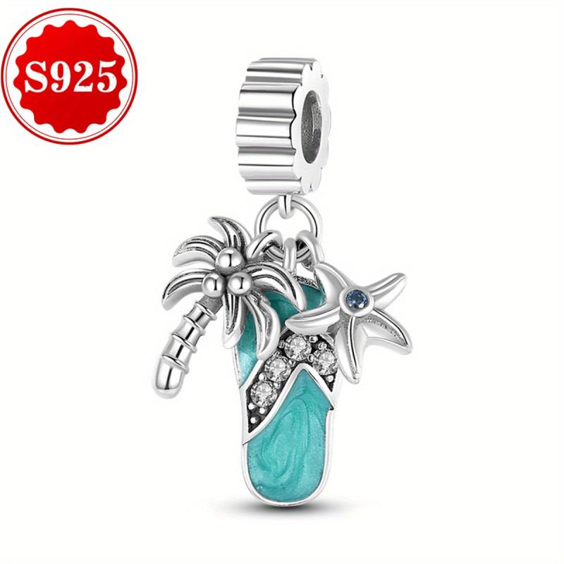 Add a touch of summer to your jewelry with this S925 sterling silver charm featuring a beach scene with coconut trees, starfish, and slippers. Perfect for DIY bracelet and necklace making.