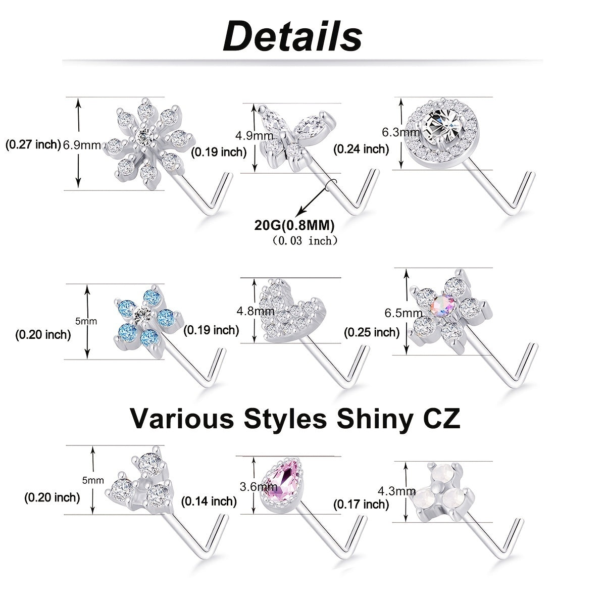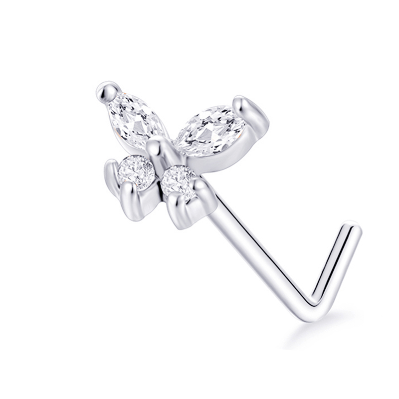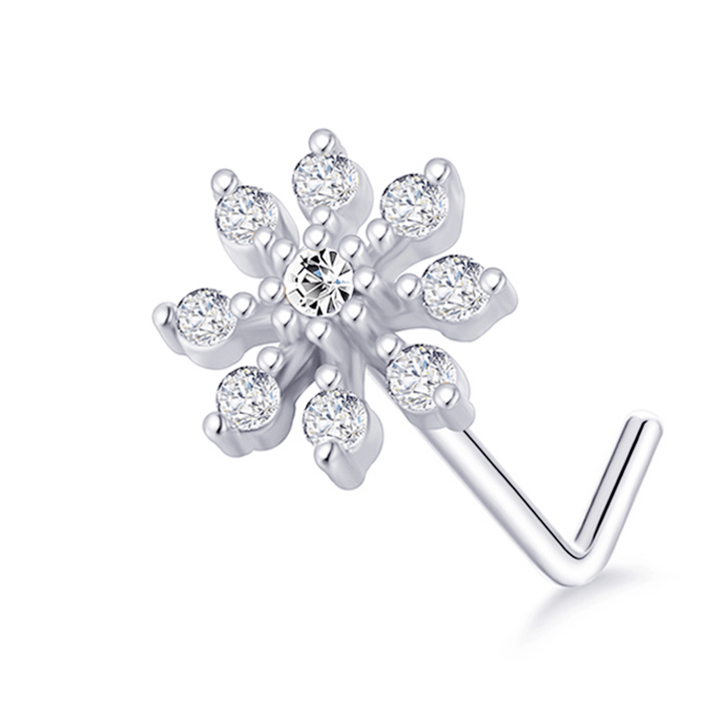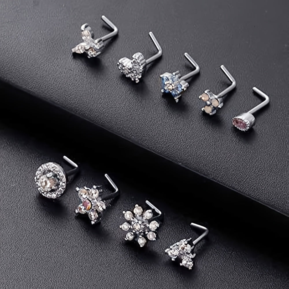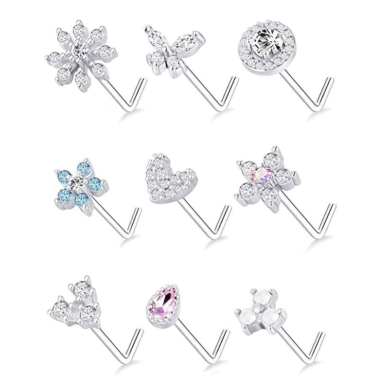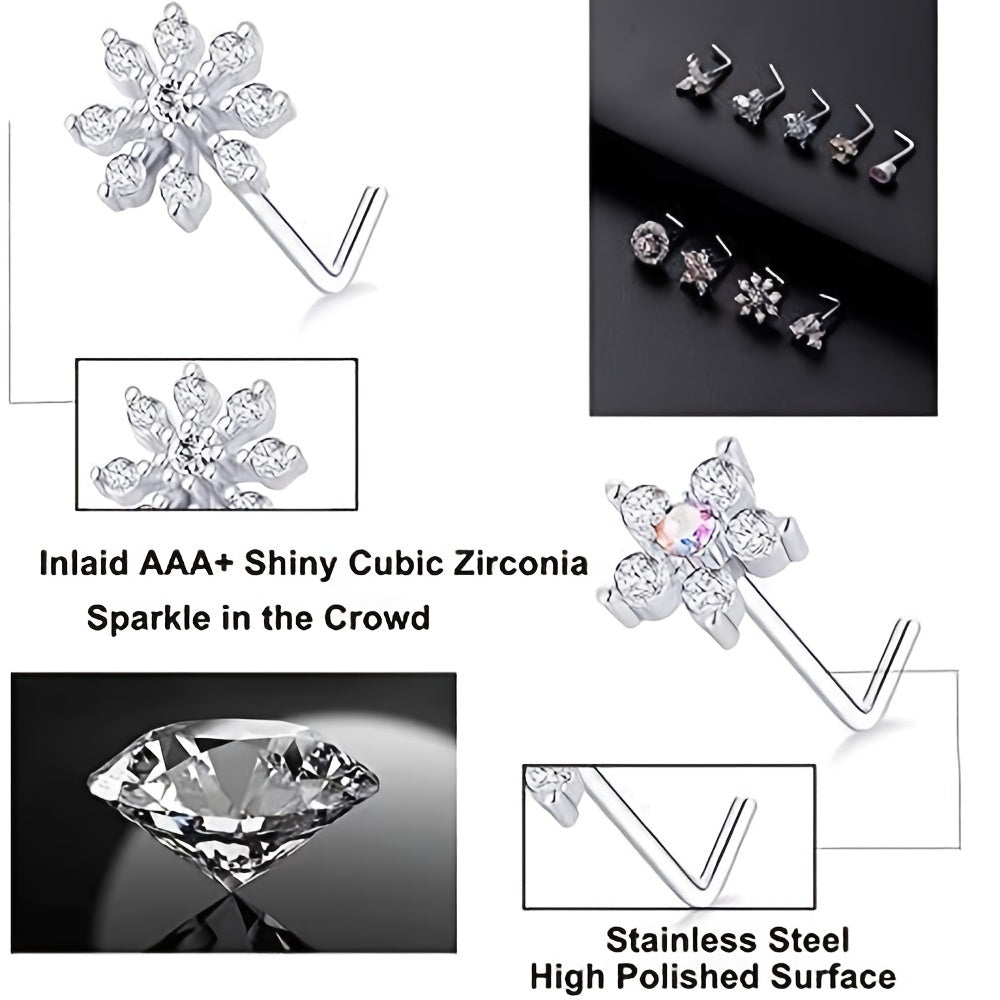 Enhance your nose piercing with this set of L shape nose ring studs featuring flower, snowflake, and butterfly shapes. Made of stainless steel for durability and style.
