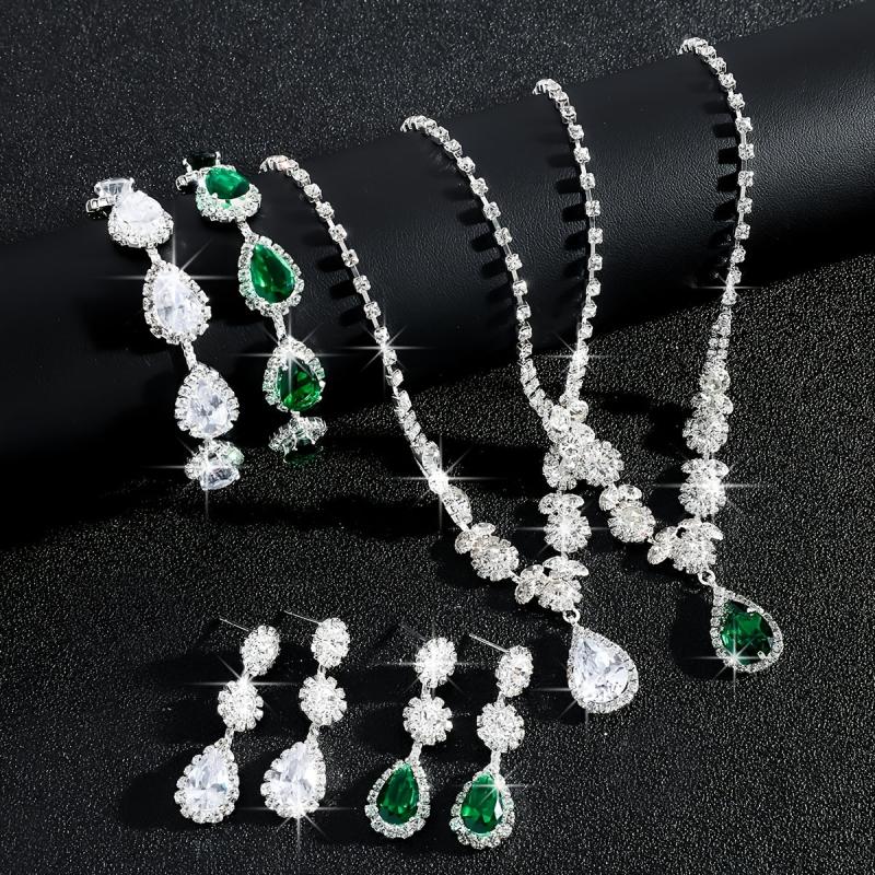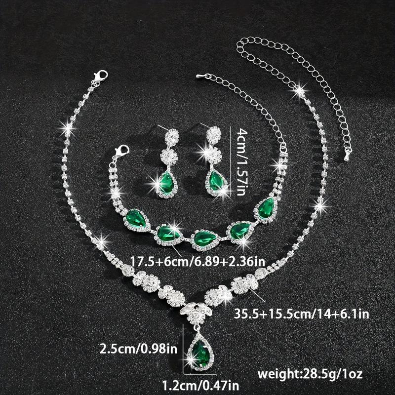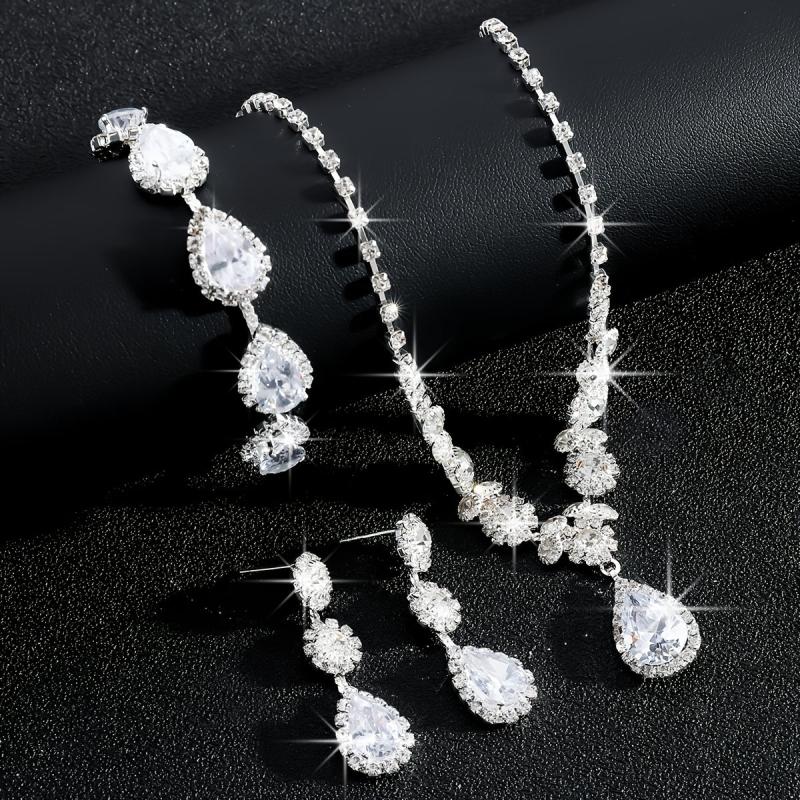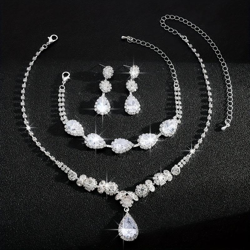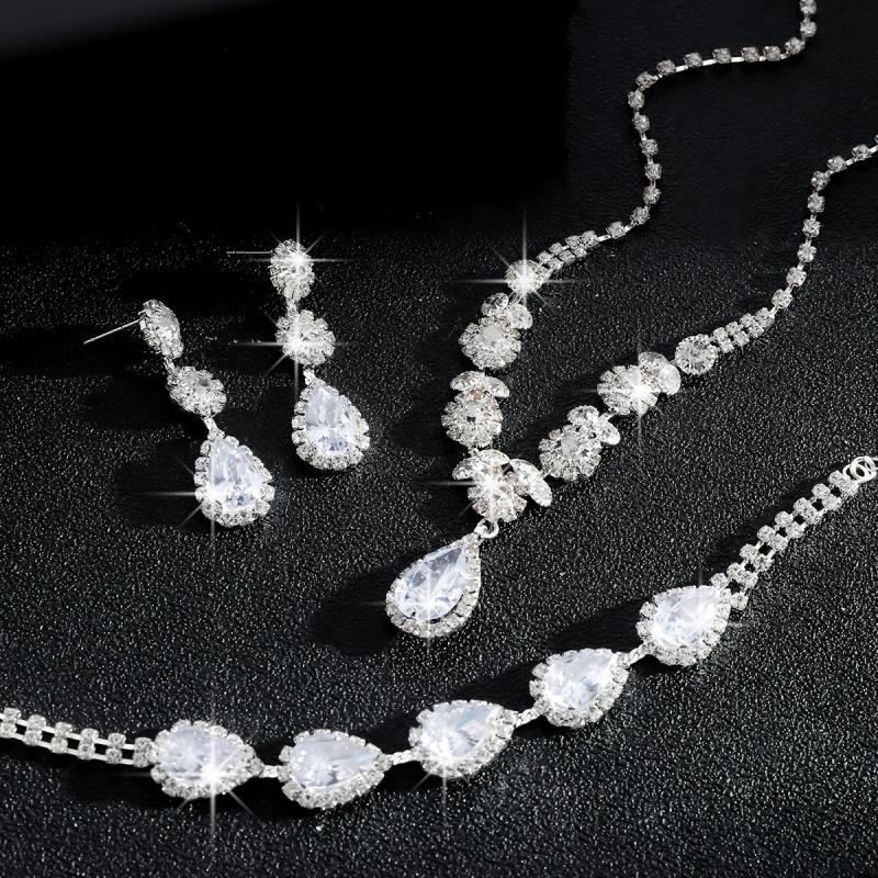 Elevate your bridal look with this exquisite jewelry set featuring heavy synthetic zirconia stones in a teardrop design. The set includes a necklace, bracelet, and earrings that add a touch of glamour to your wedding ensemble.