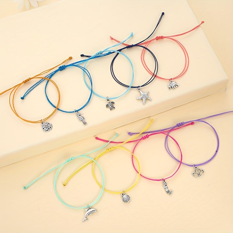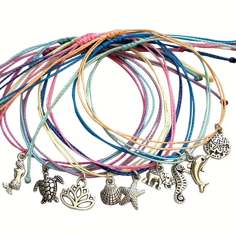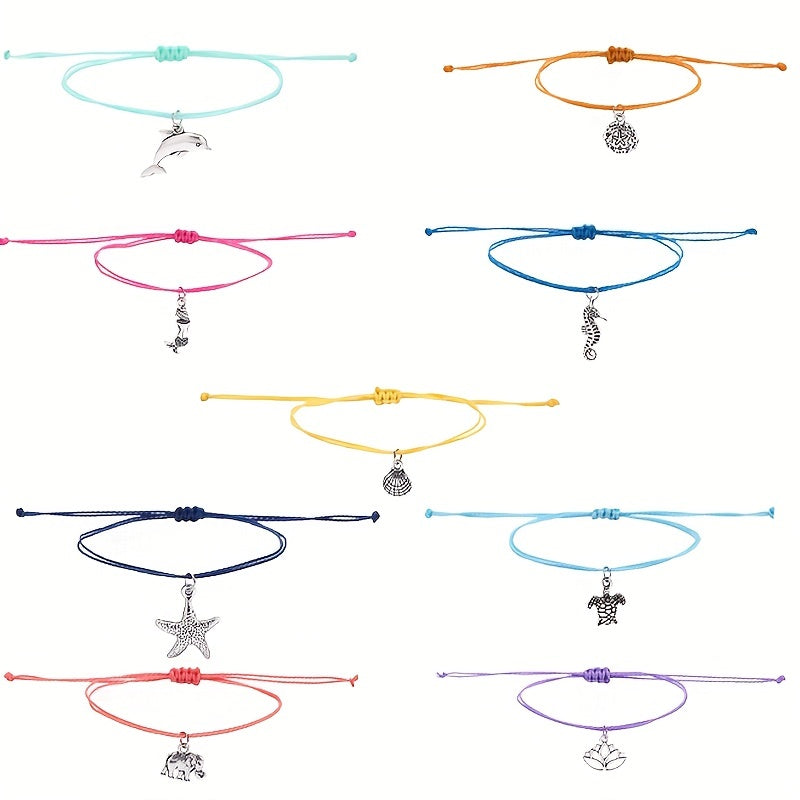 This hot and trendy anklet features various shapes like turtle, starfish, lotus flower, dolphin, elephant, etc. Made of thin wax thread, it is waterproof and perfect for summer beach days.