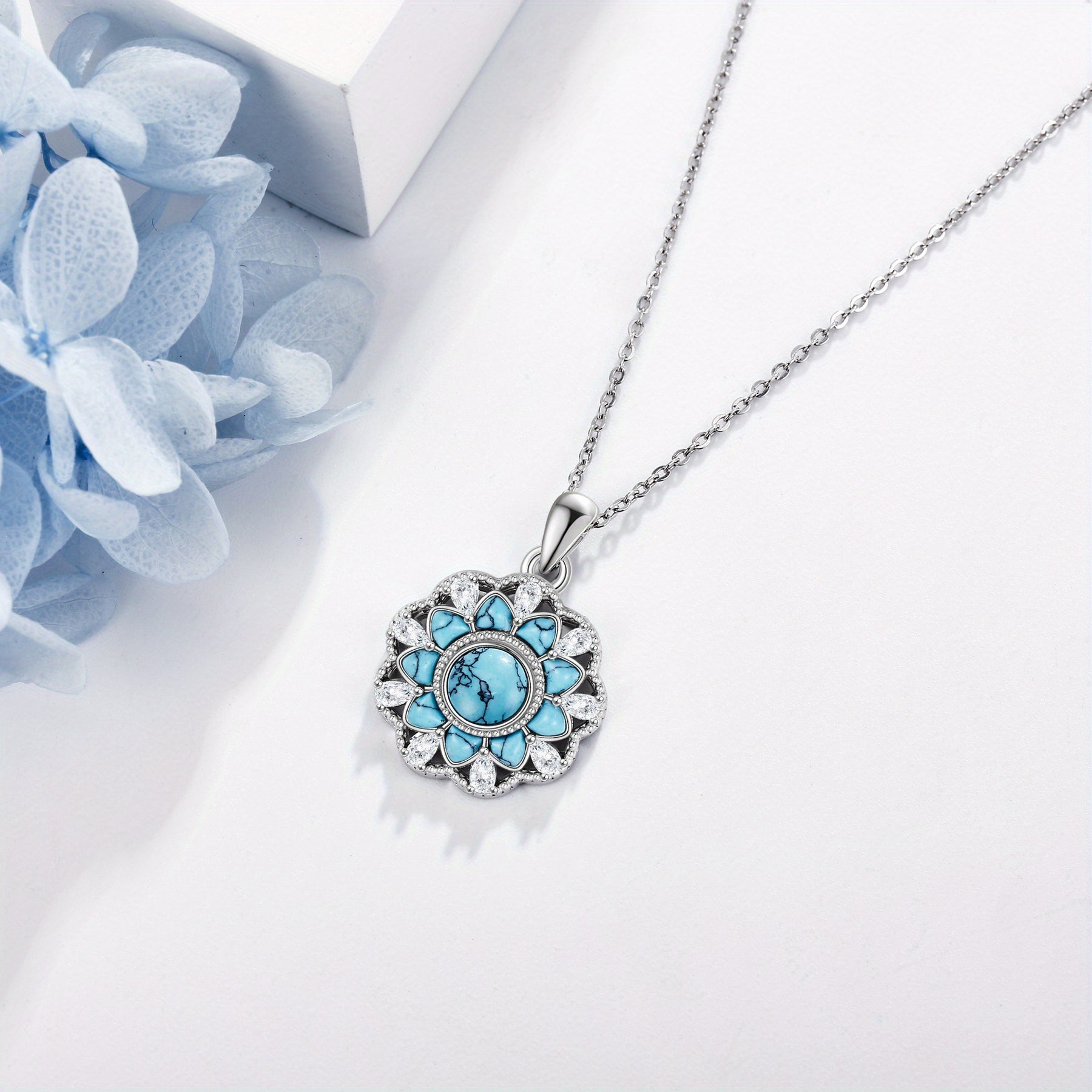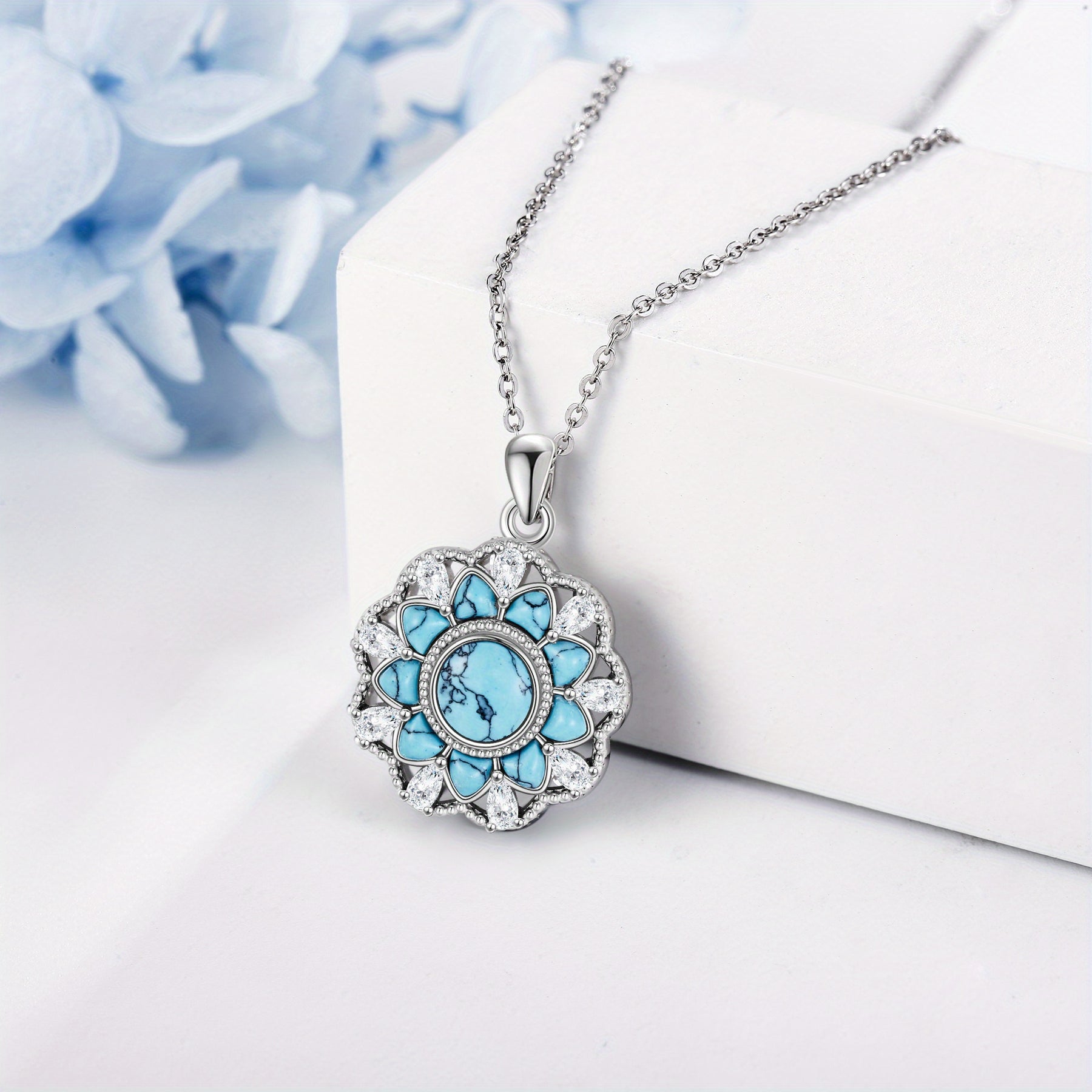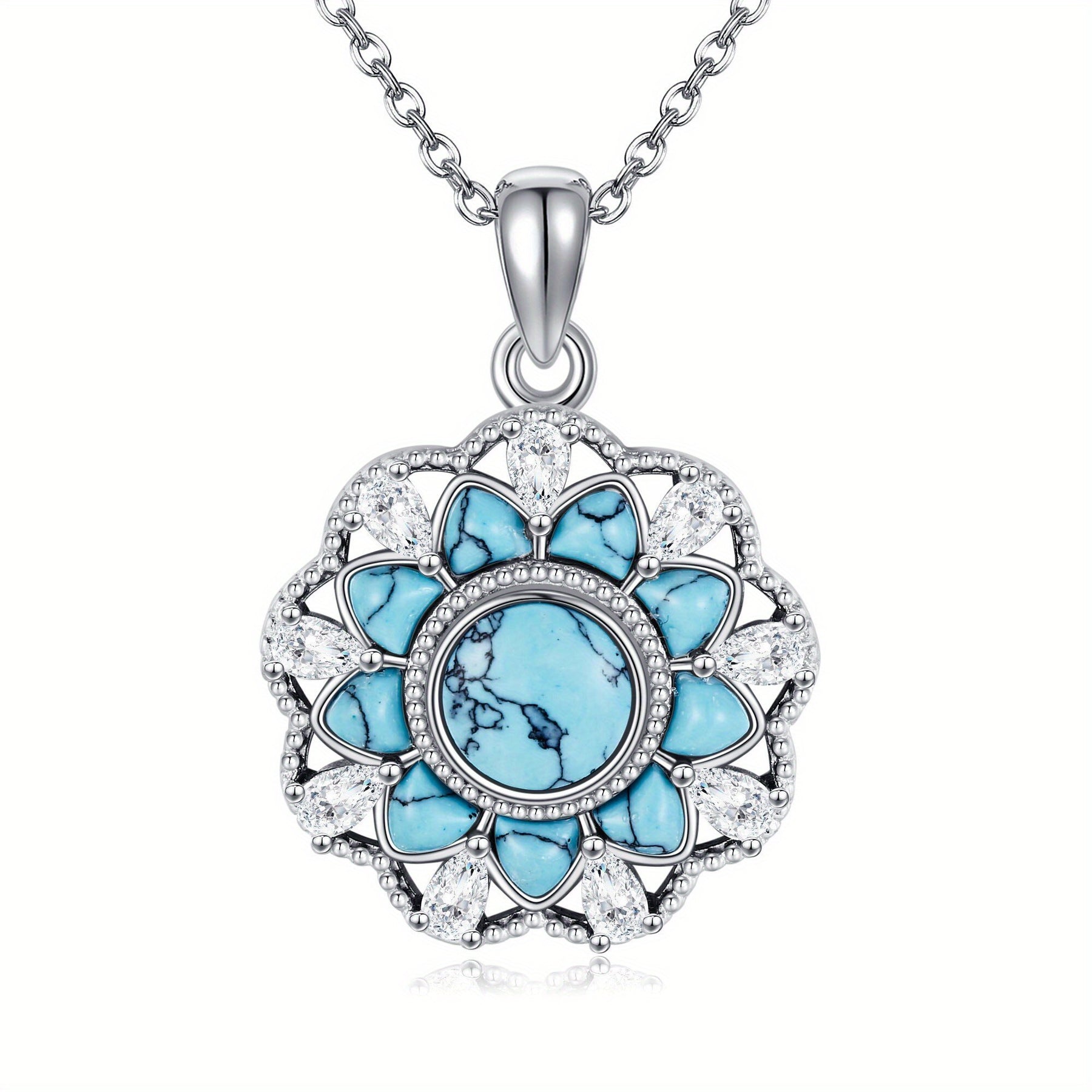 Fügen Sie mit dieser atemberaubenden türkisfarbenen Halskette einen Hauch von Eleganz hinzu. Das komplizierte Blumendesign und das 925 Sterlingsilber machen es zu einem perfekten Accessoire für Frauen und Mädchen.