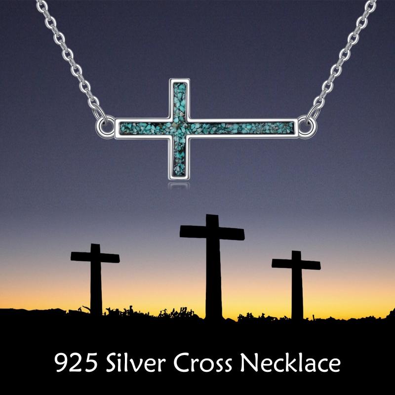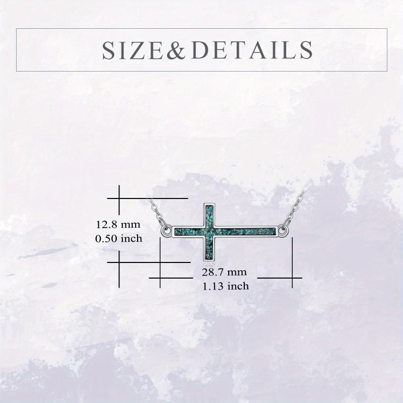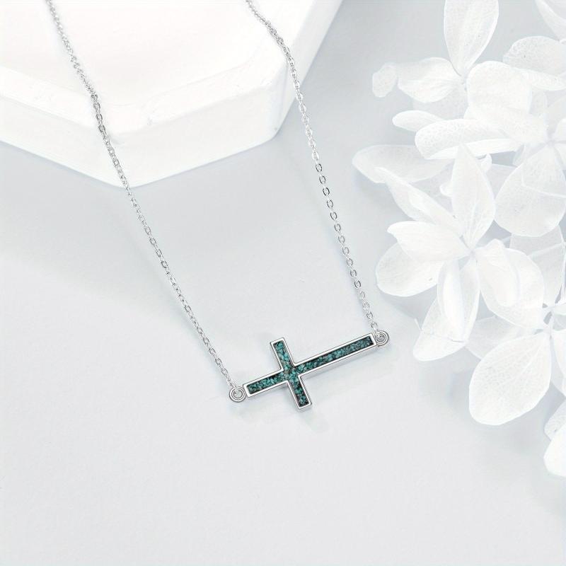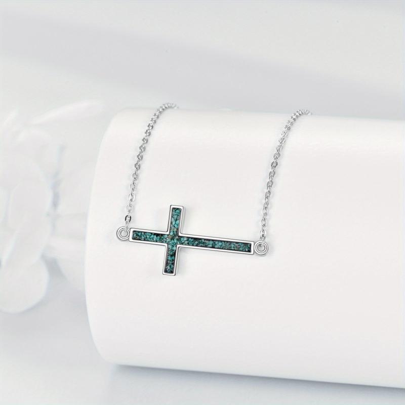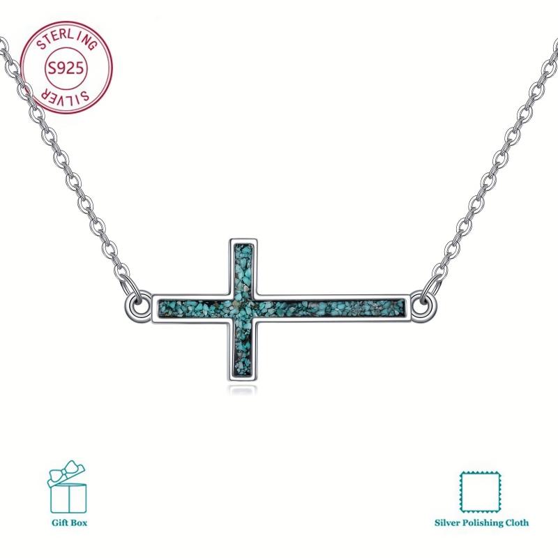 This stylish necklace features a sideways cross pendant adorned with a turquoise stone. Made of high-quality sterling silver, it is suitable for both women and men.