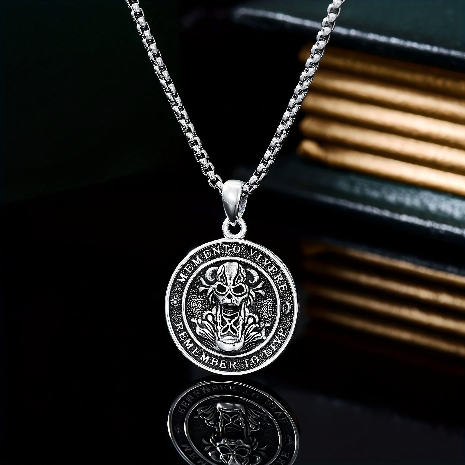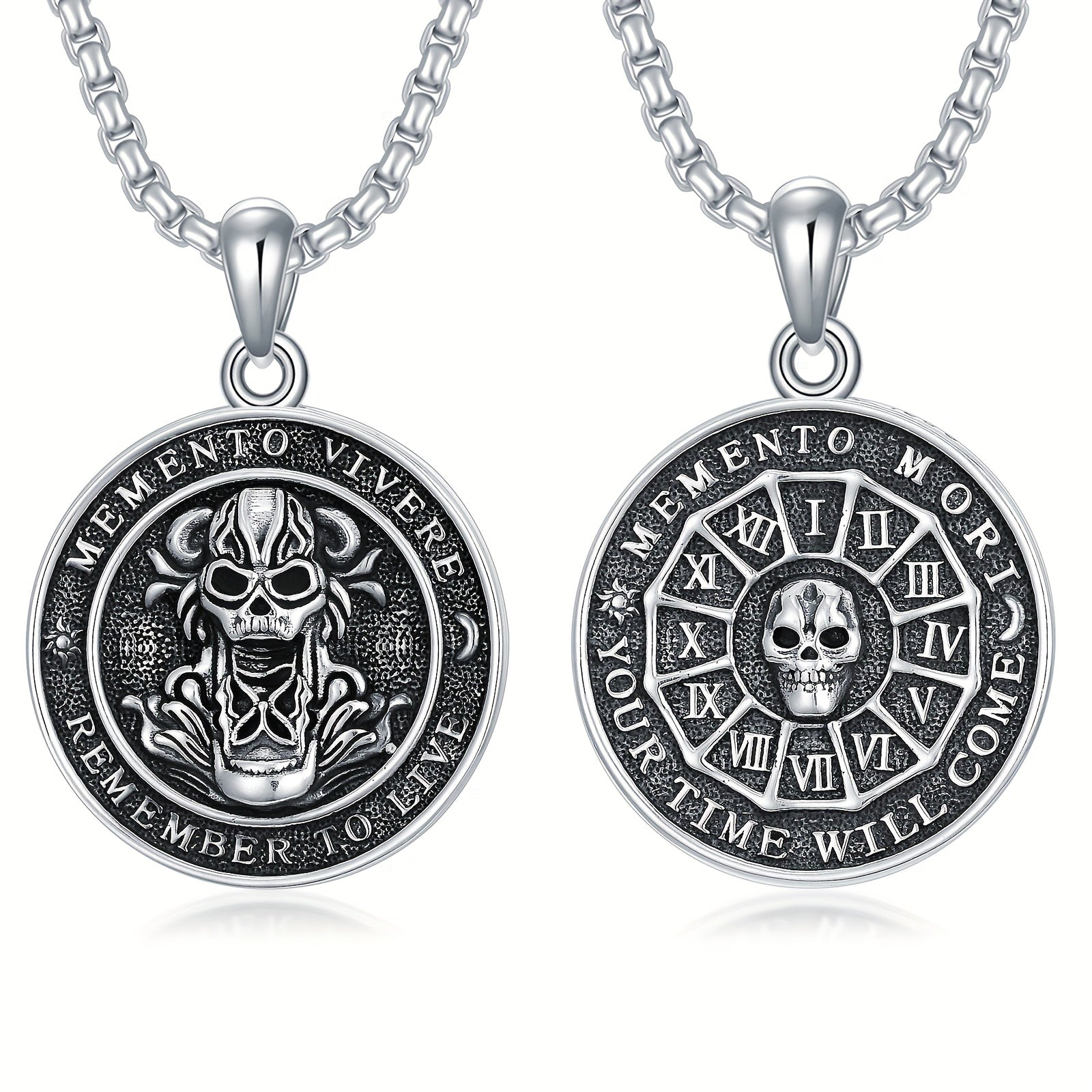 This striking Memento Mori necklace is crafted from 925 sterling silver and features a gothic skull design. Perfect gift for men and women.
