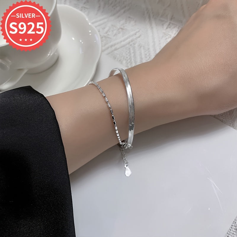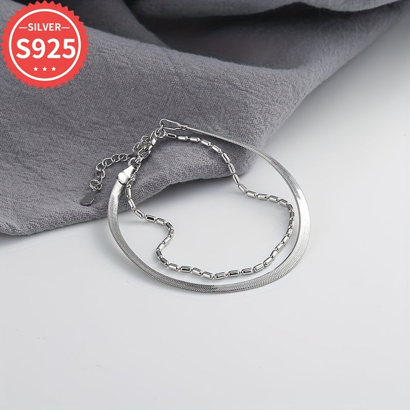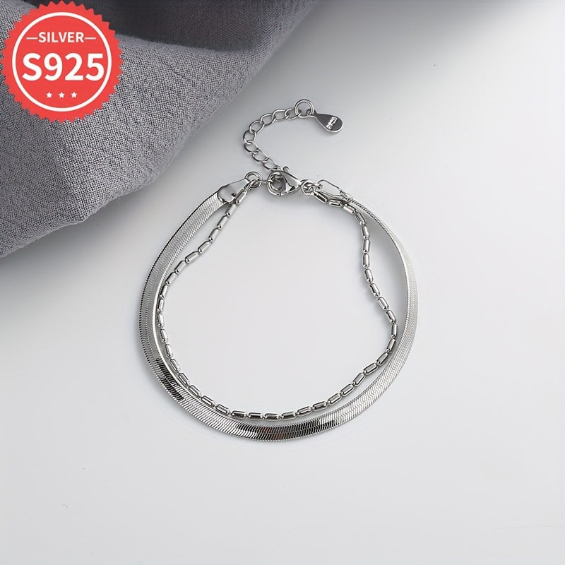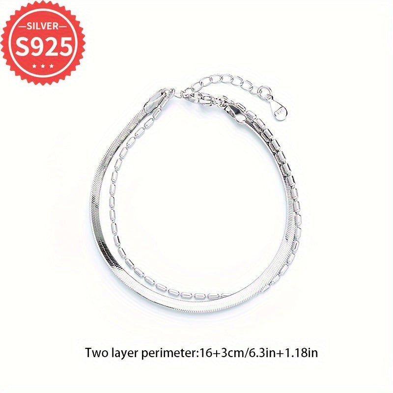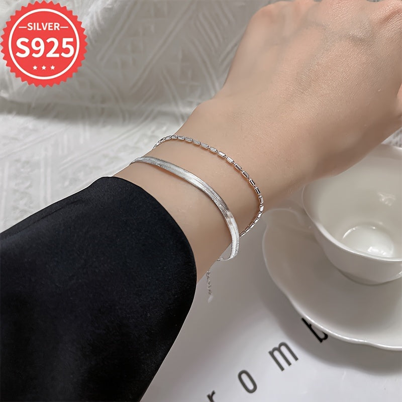 This 925 sterling silver snake chain bracelet features a flat double layer design with olive bead accents. Hypoallergenic and suitable for daily and party wear.