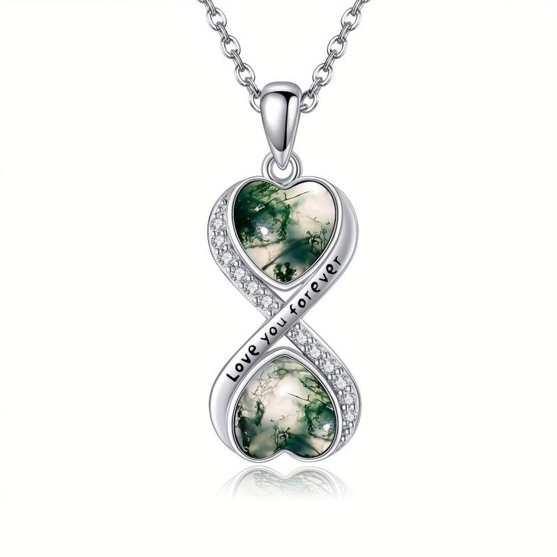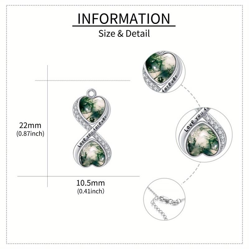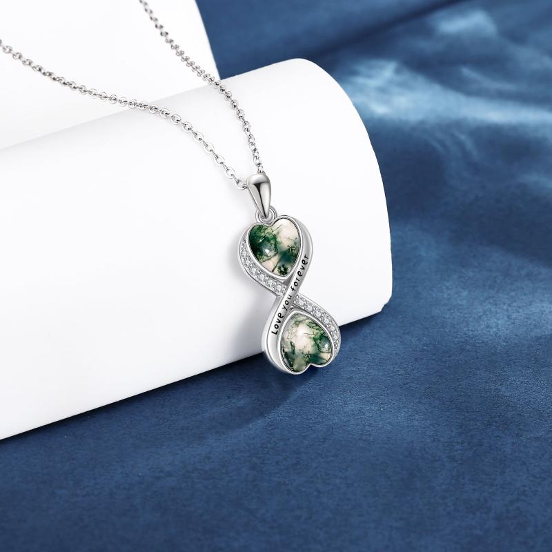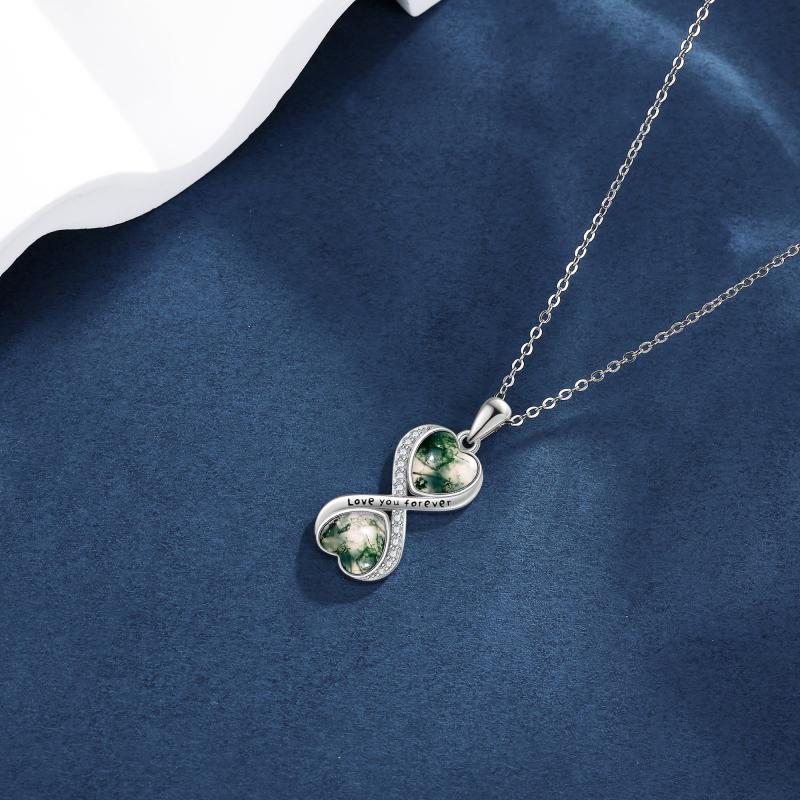 Diese atemberaubende Halskette für das Moos -Achat -Infinity wird aus 925 Sterlingsilber hergestellt. Es ist ein wunderschönes Stück Infinity -Schmuck für Frauen, das die einzigartige Schönheit von Moos -Achat -Edelstein zeigt.