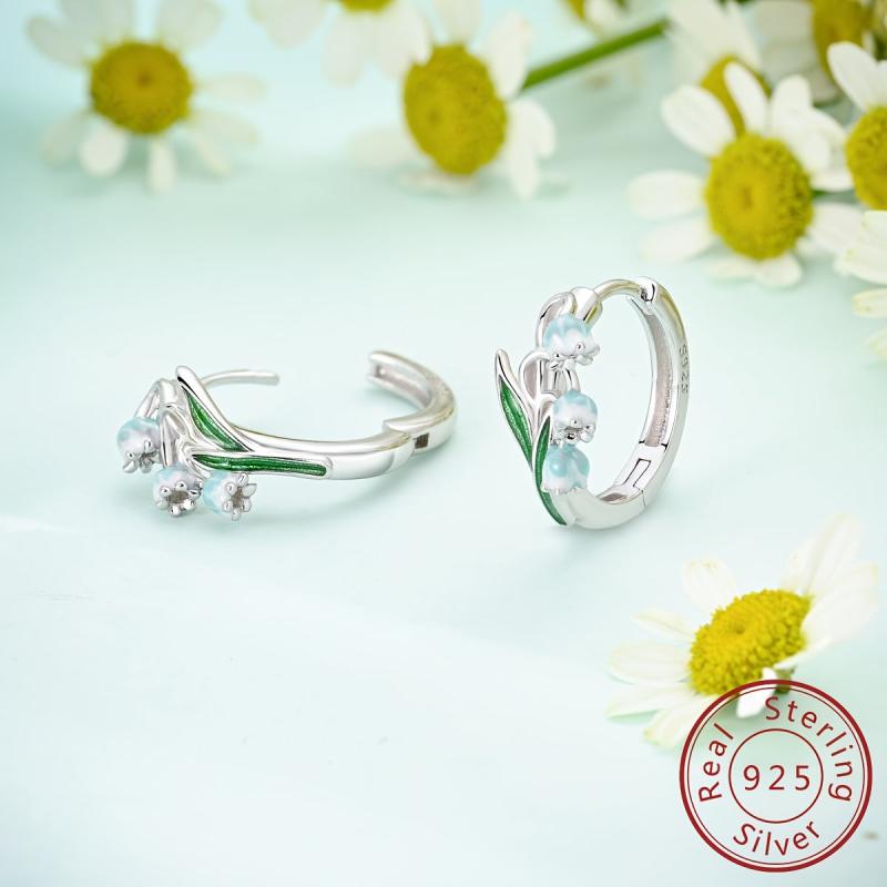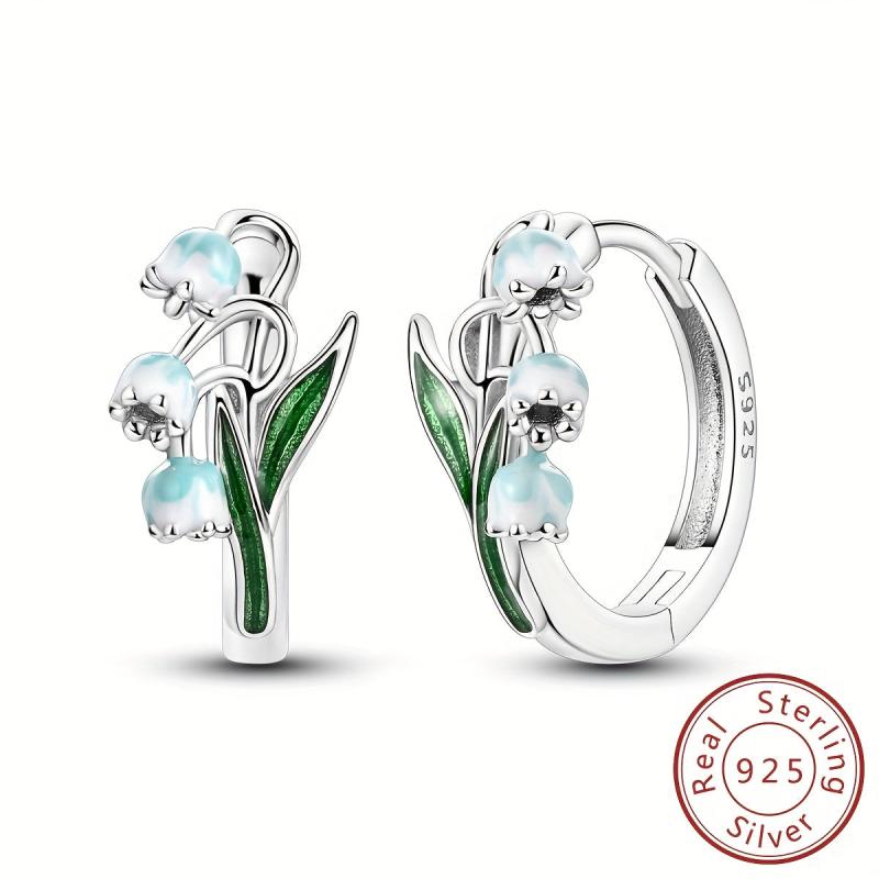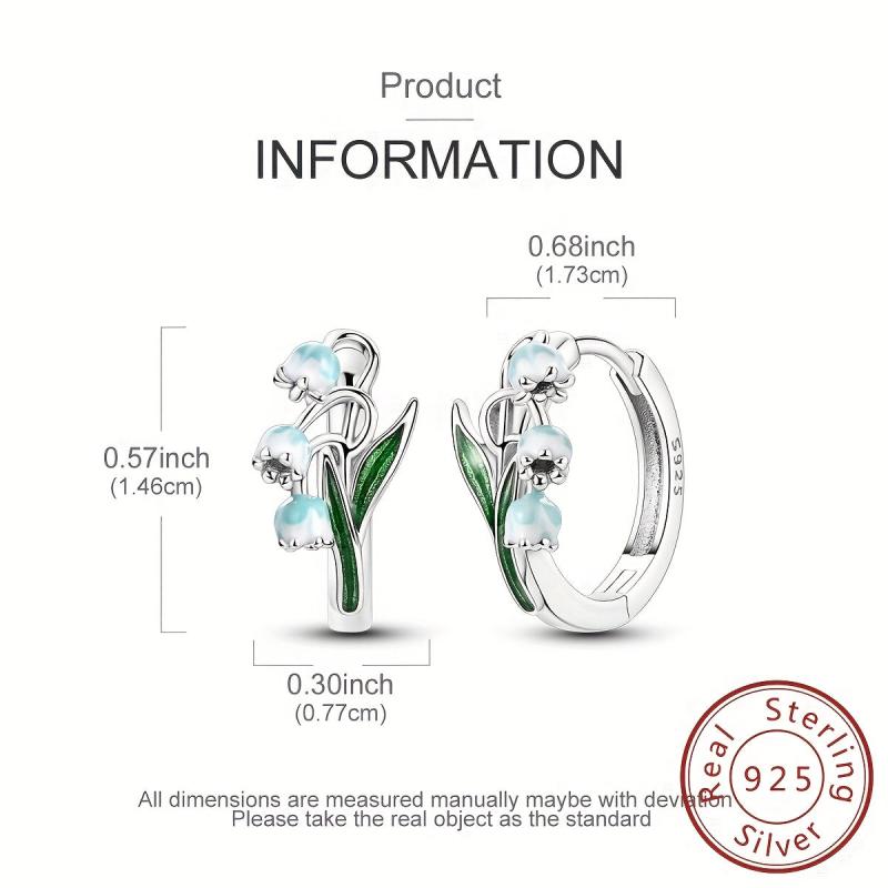 Fügen Sie einen Hauch von Frühling mit diesen schönen Hoop -Ohrringen mit einer zarten Lilie der Talblumen in Sterlingsilber hinzu.