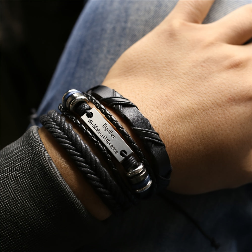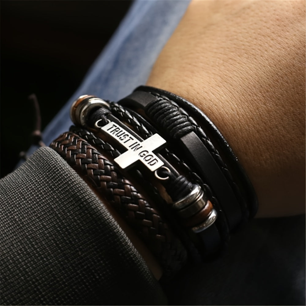 This stylish set of bracelets is designed for men, featuring braided leather, wooden beads, and unique pendants. A fashionable accessory to complement your casual or formal outfits.