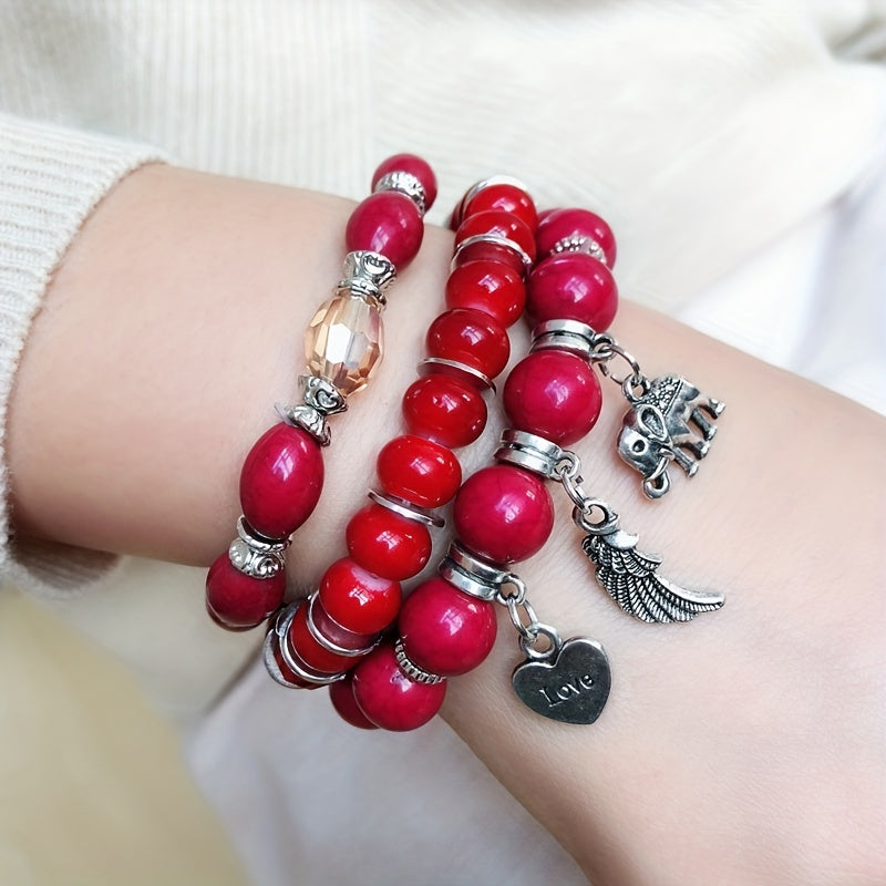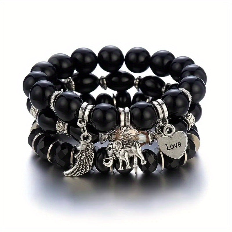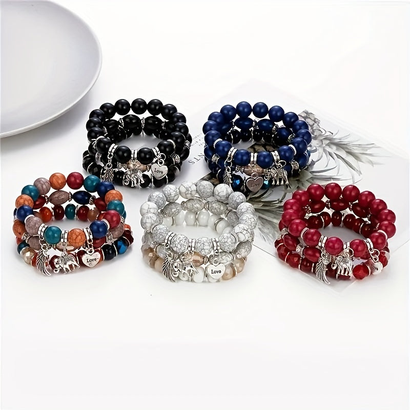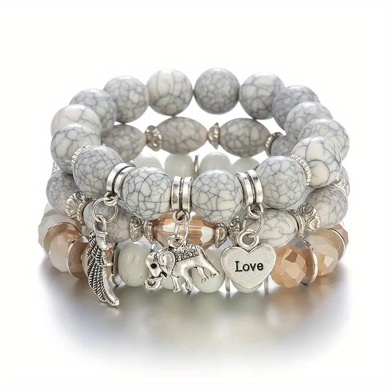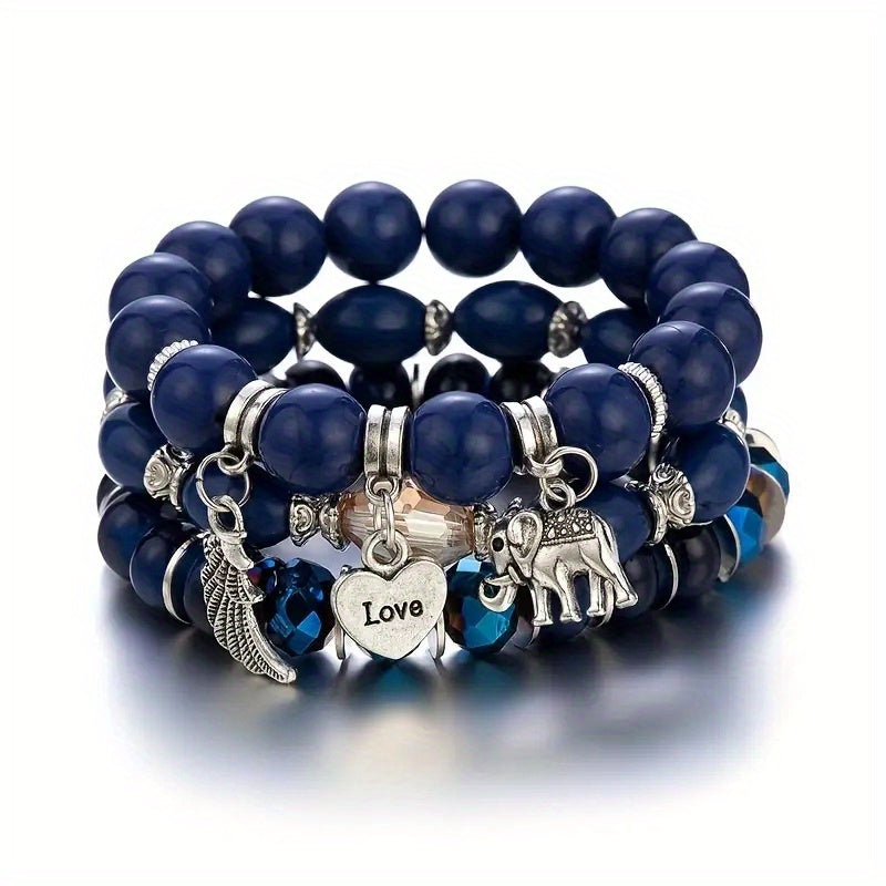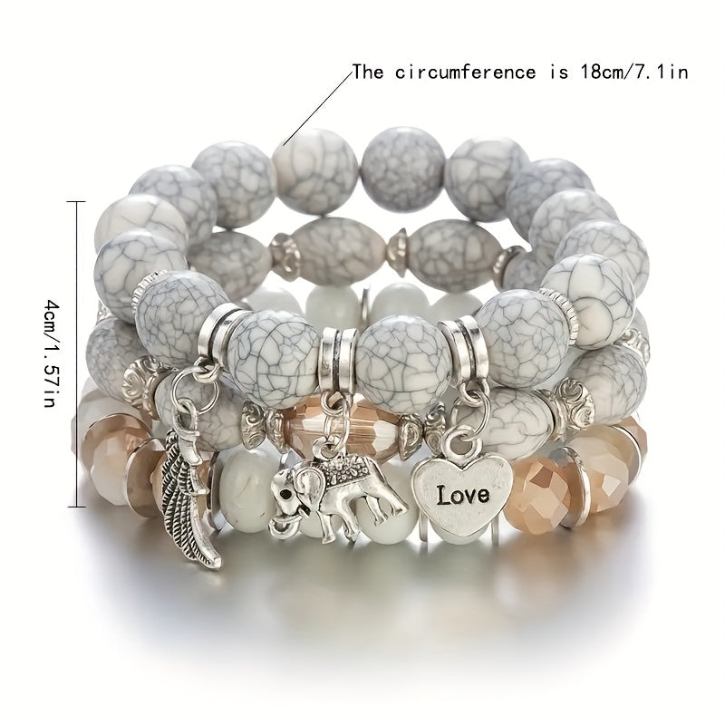 This set includes three stylish bracelets featuring Bohemian, pearl, elephant, wings, and love patterns.