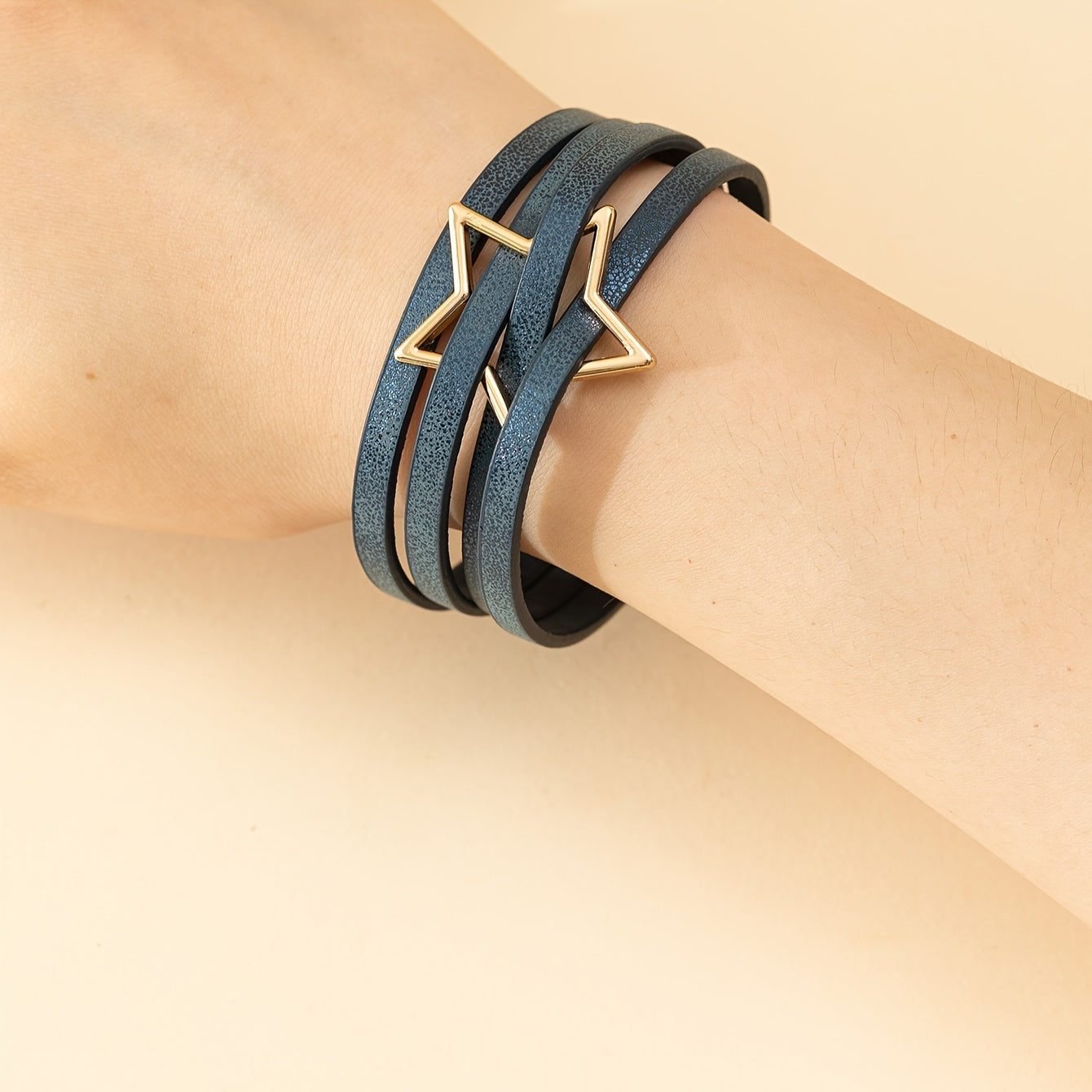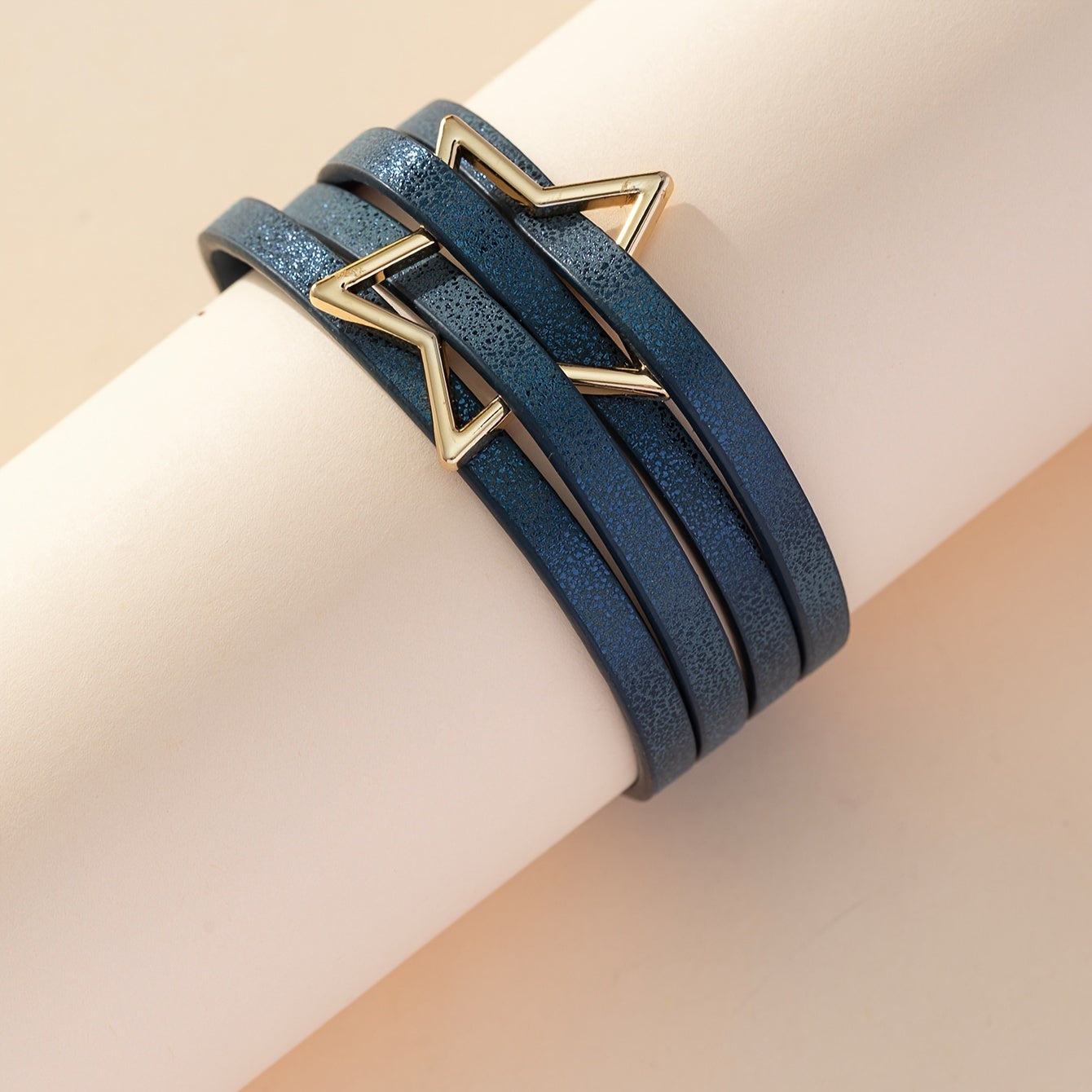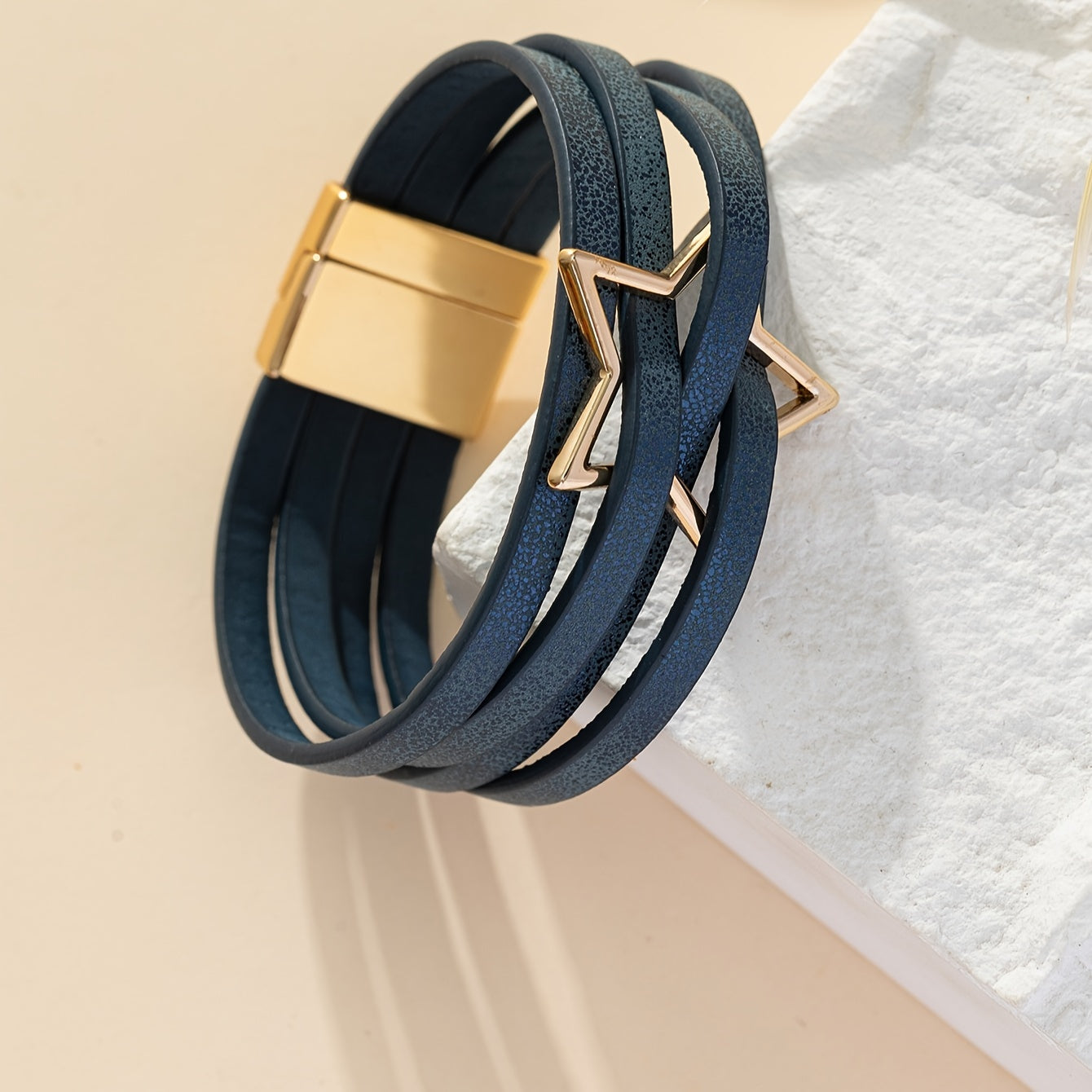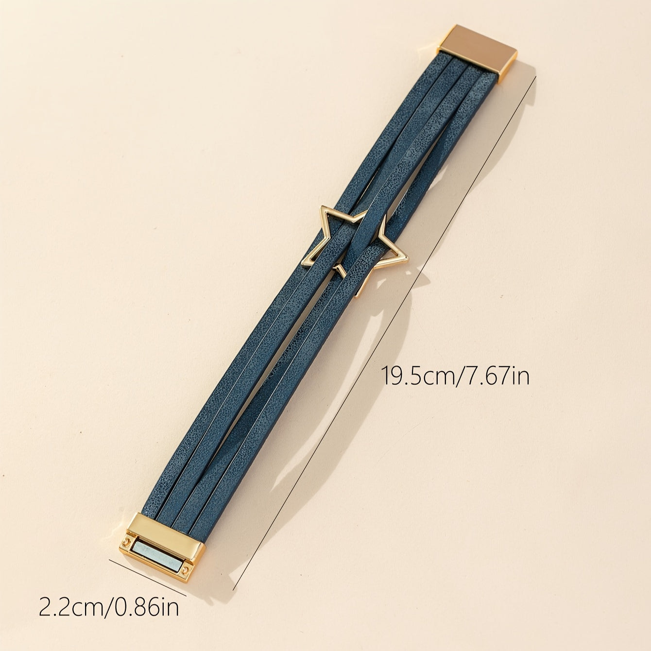 This bohemian leather wrist bracelet features a five-pointed star design with a magnetic buckle closure. It is a stylish accessory for boys.