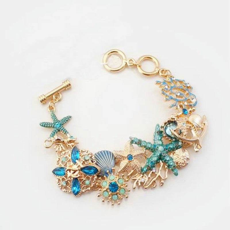 This boho bracelet features ocean elements like starfish, coral, and shells with copper inlaid diamonds.