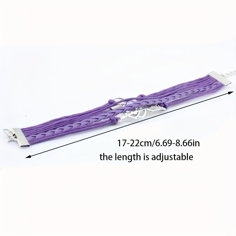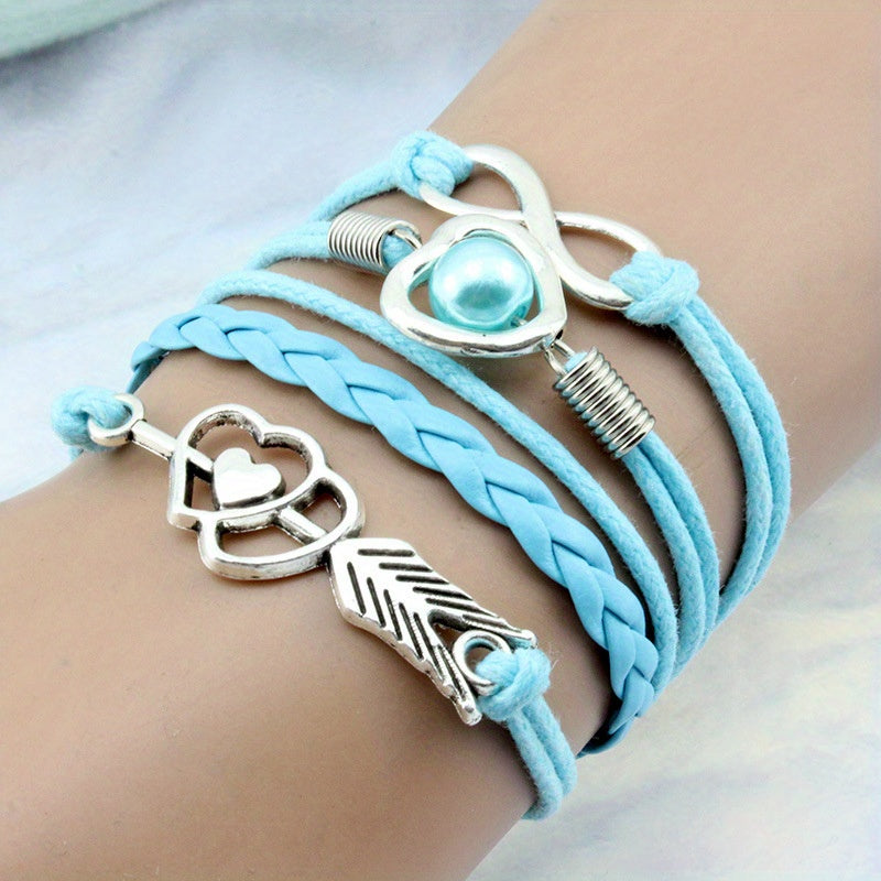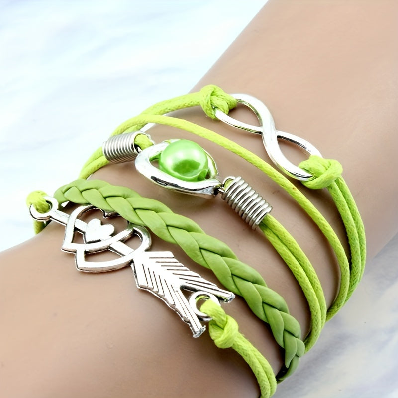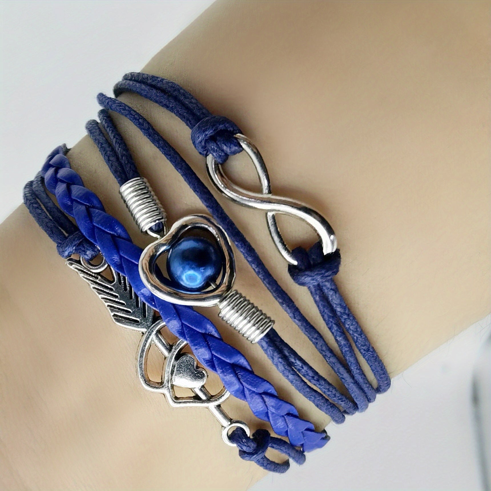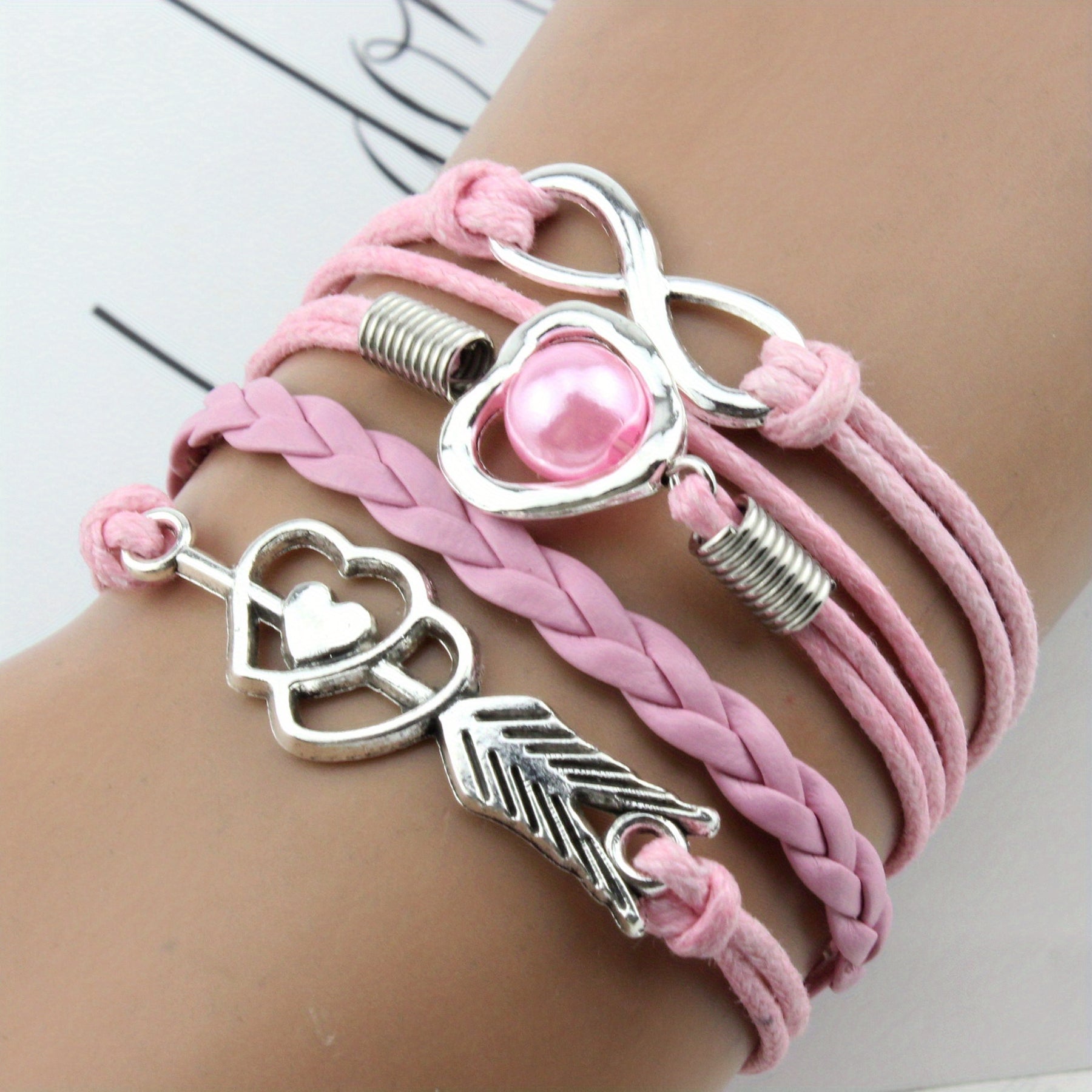 This multilayer bracelet features a stylish design with an infinity symbol, cupid's arrow, and pearl accents.