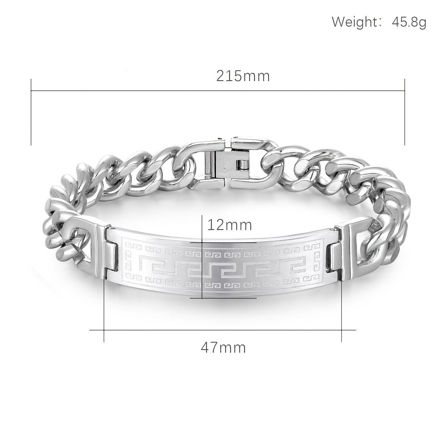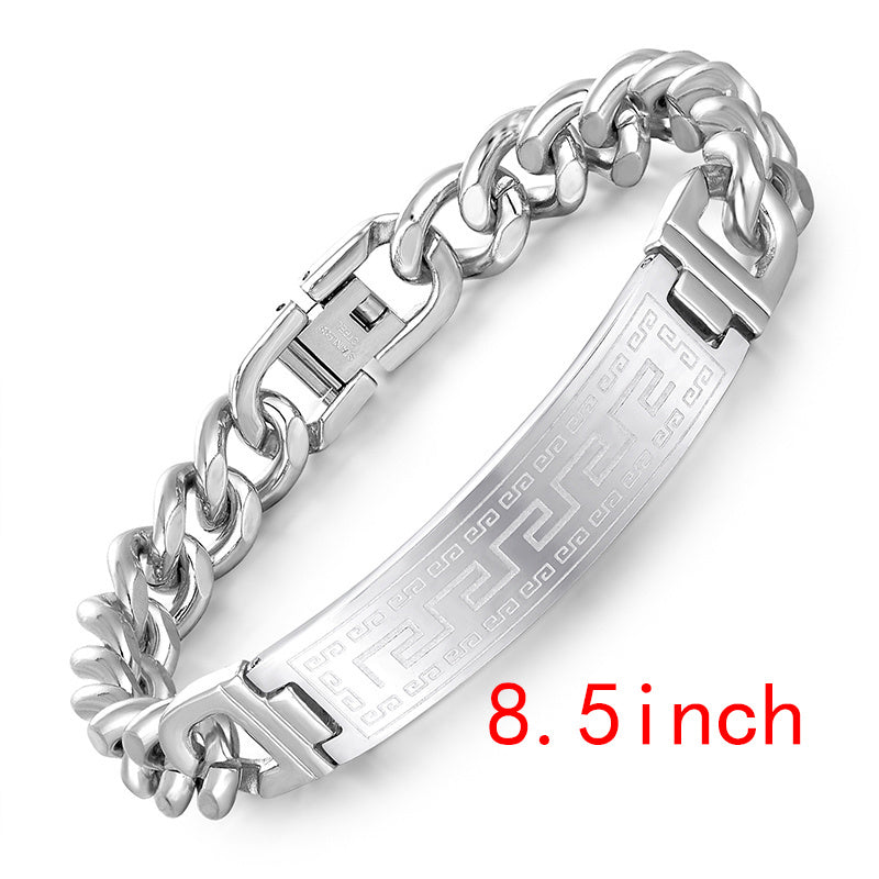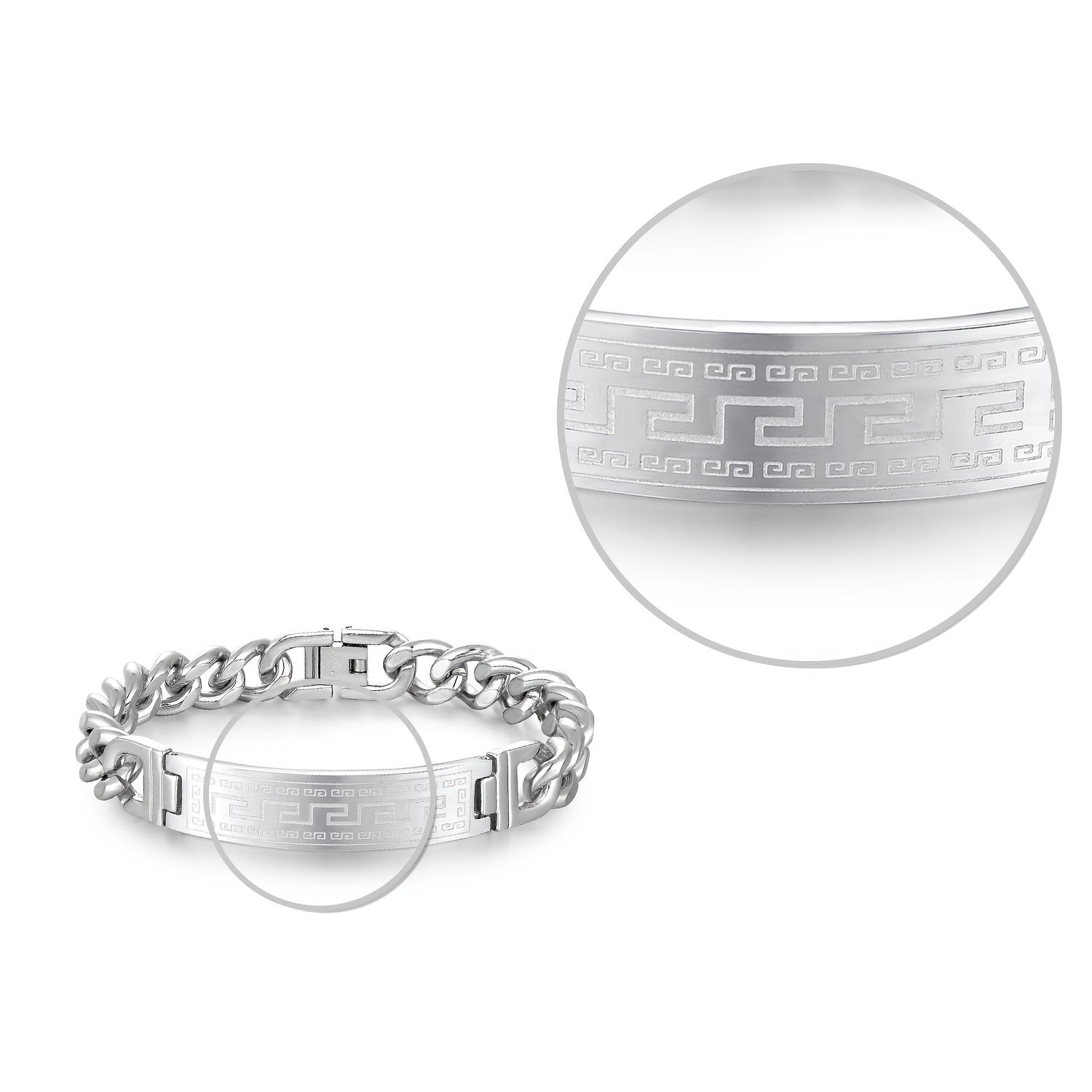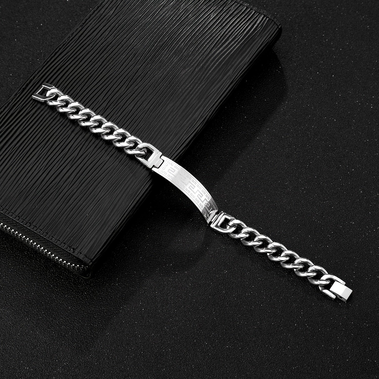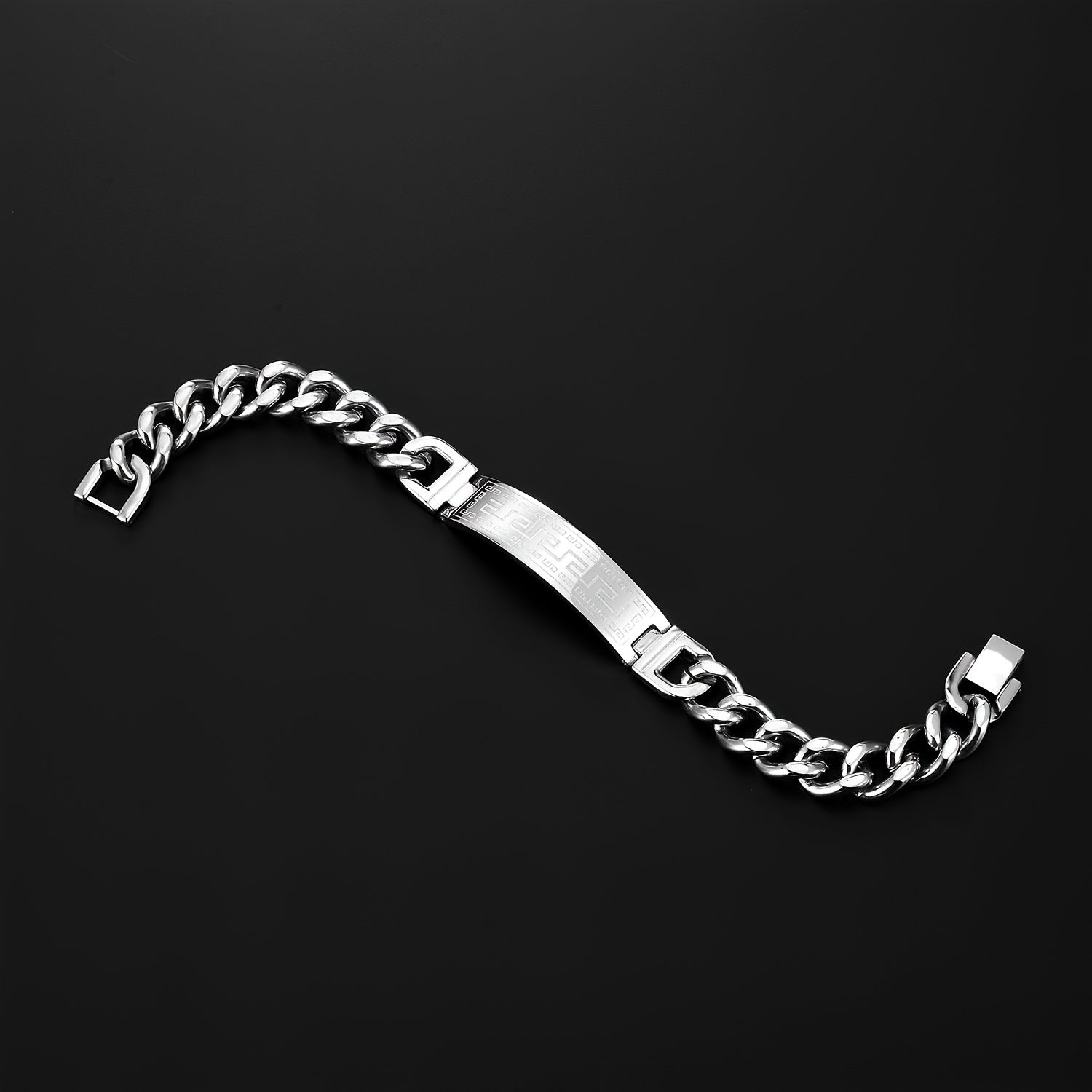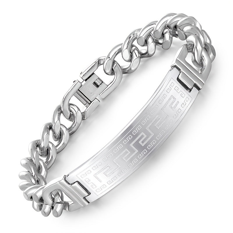 This stylish bracelet features a long city pattern design, curved for a sleek look. Made with durable stainless steel, it's perfect for everyday wear or special occasions.