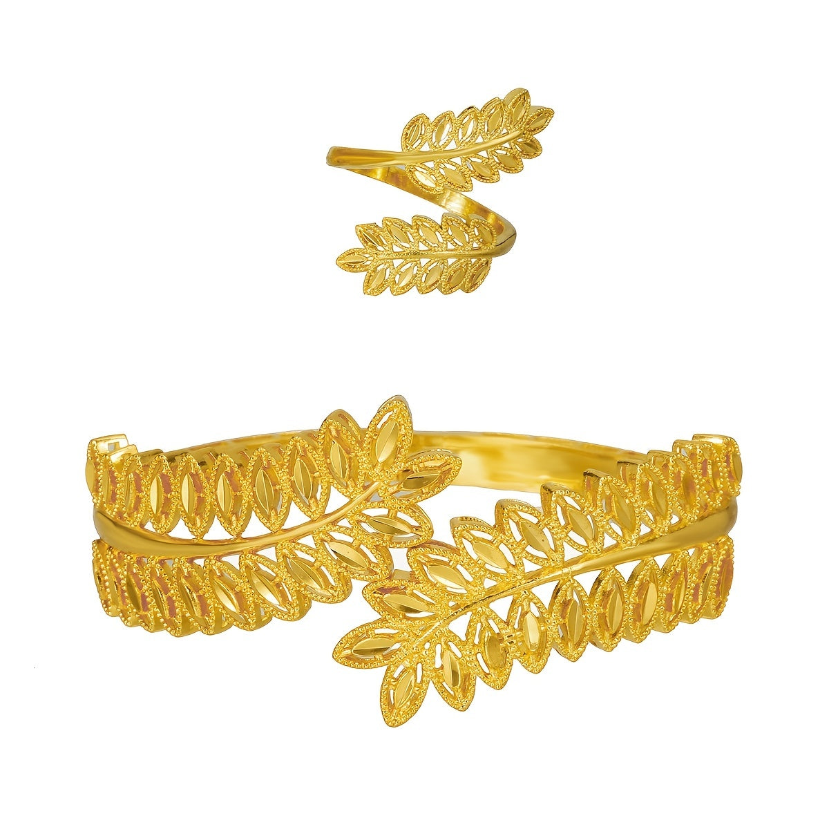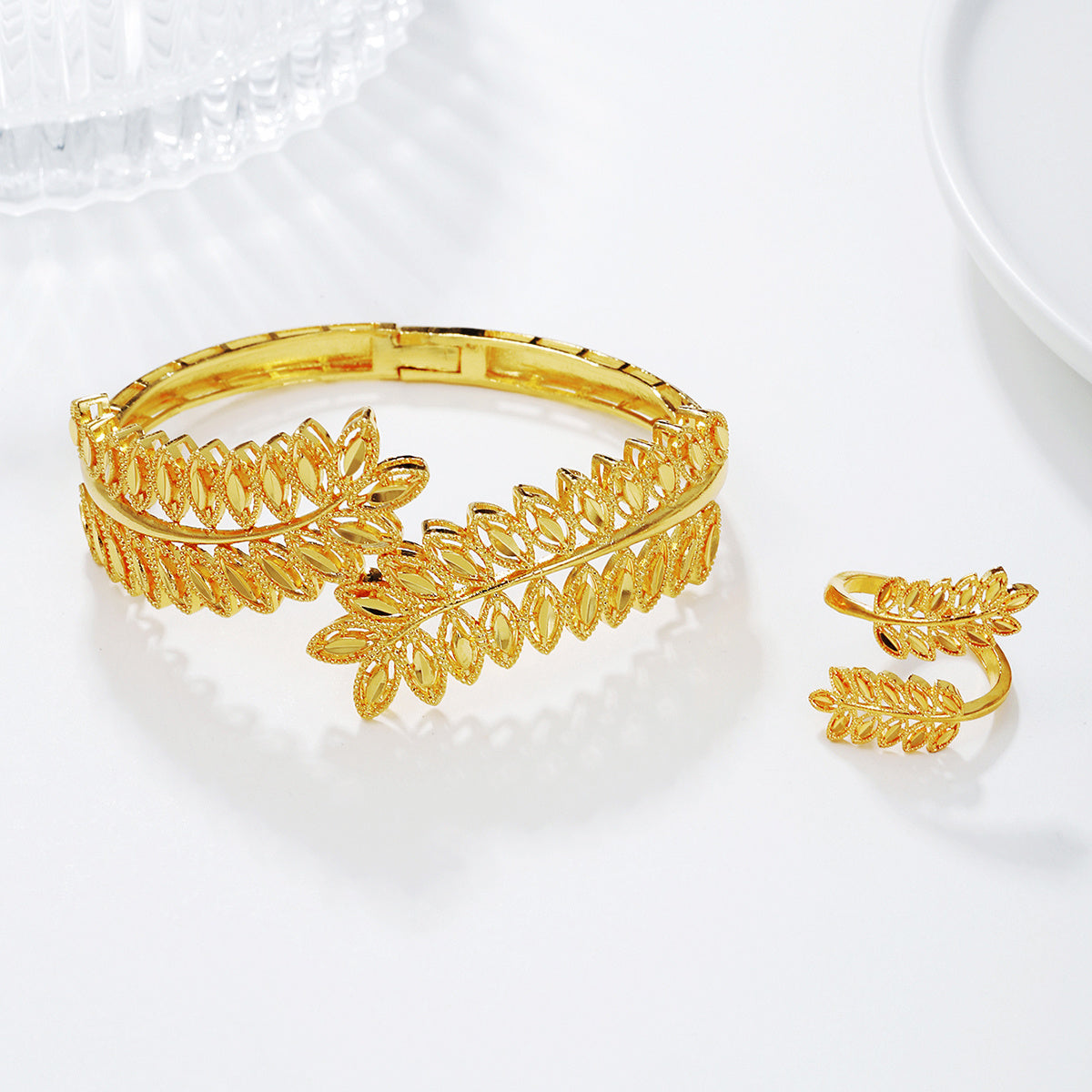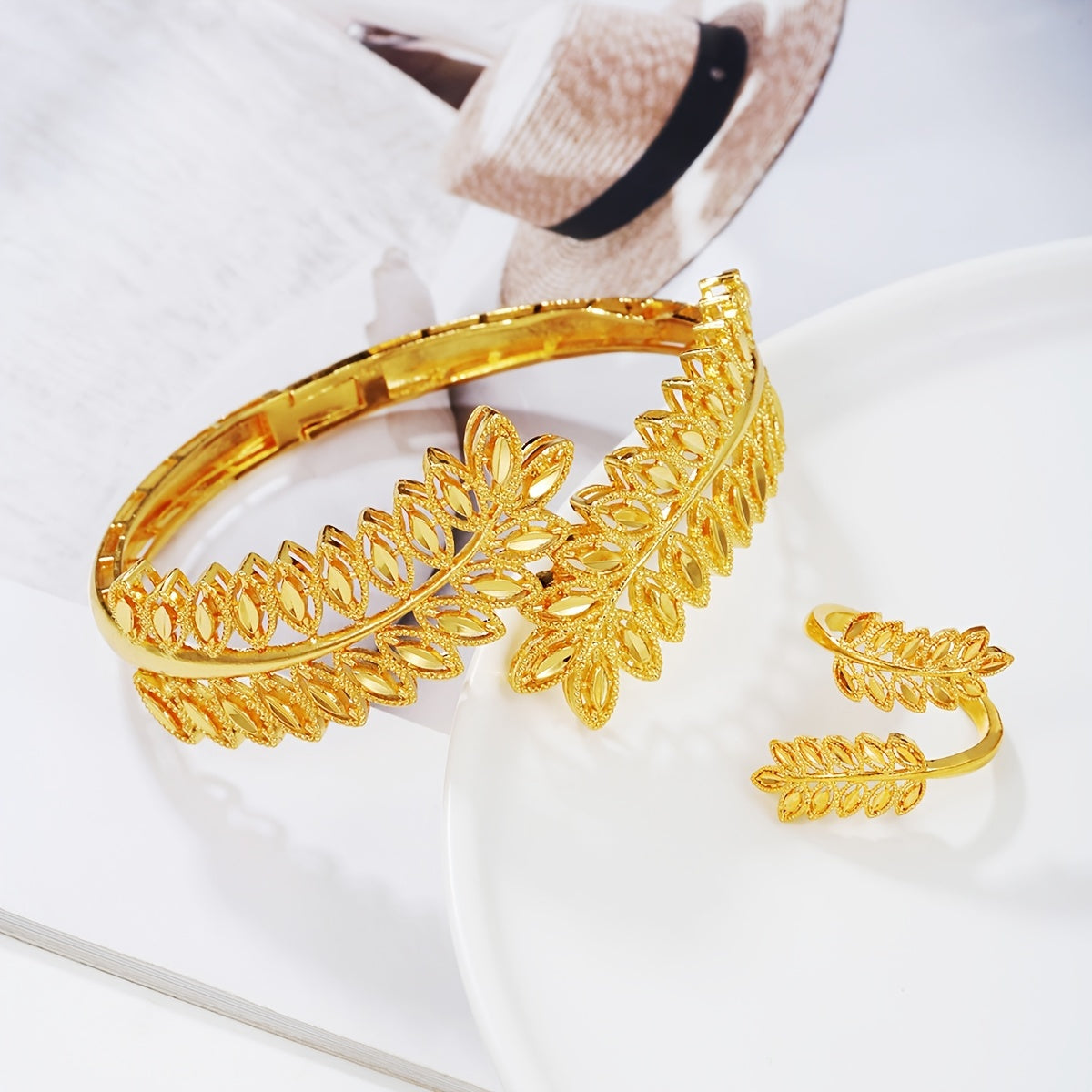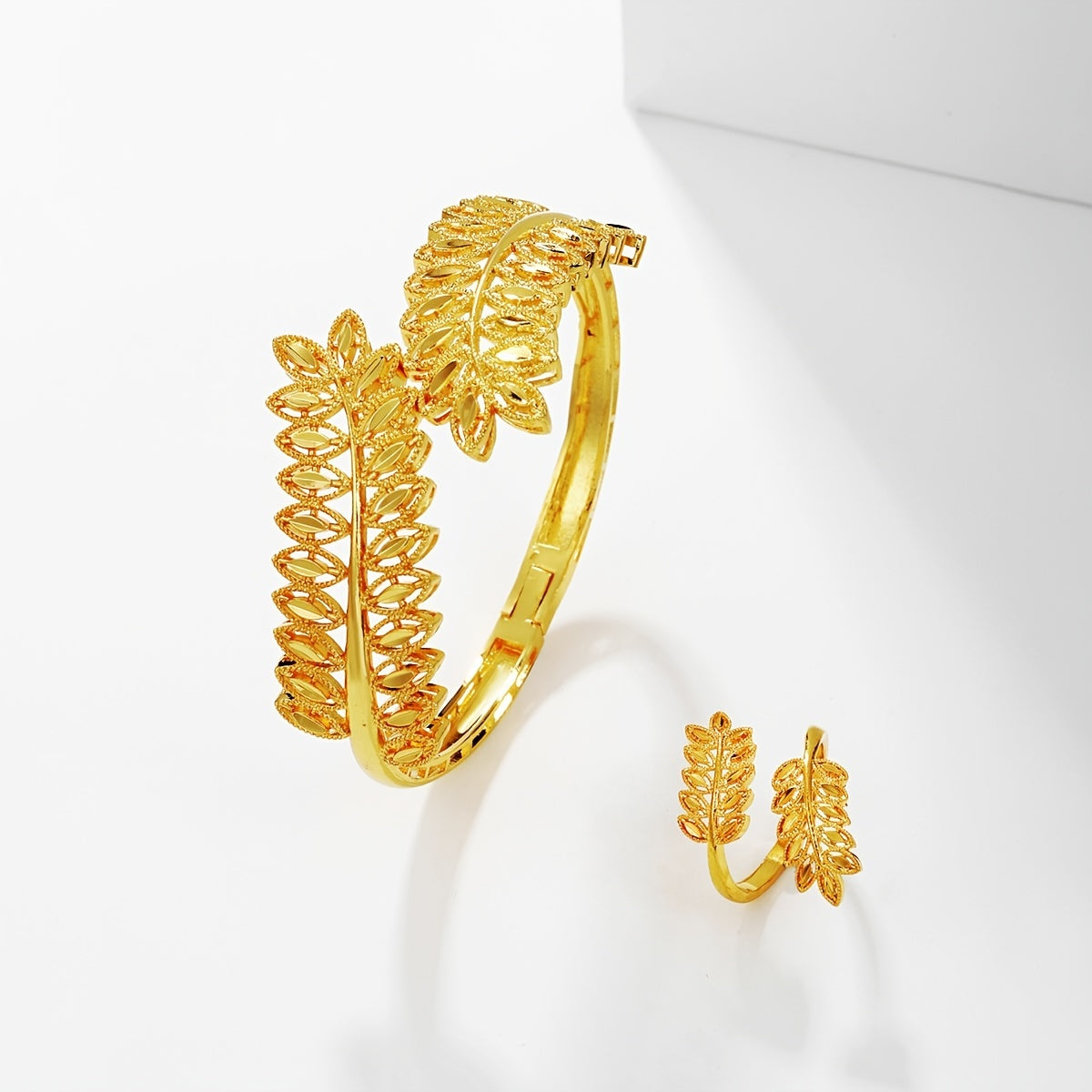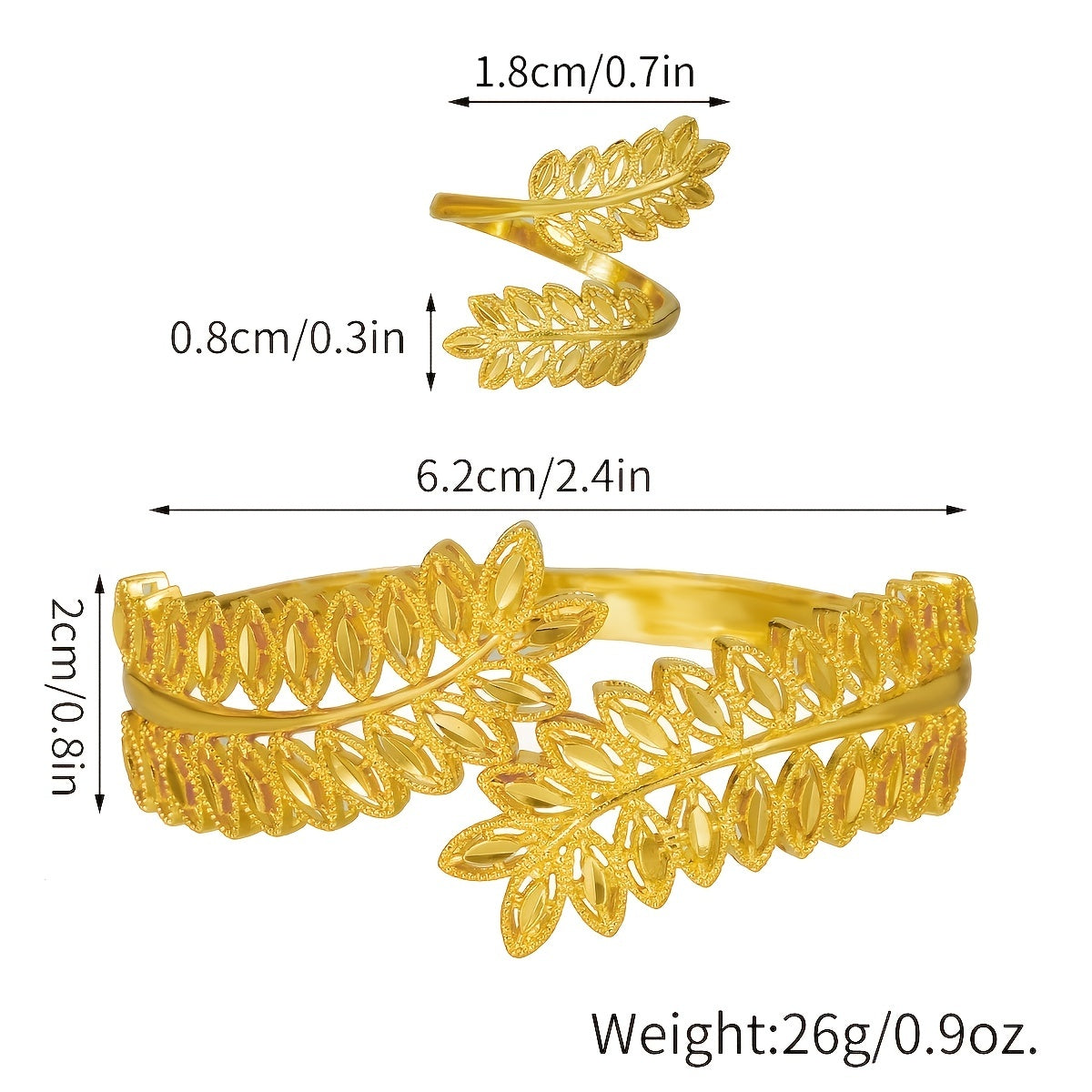 Gorgeous leaf design open cuff bangle bracelet and ring set, perfect for women and girls. The set adds a touch of elegance to any outfit.