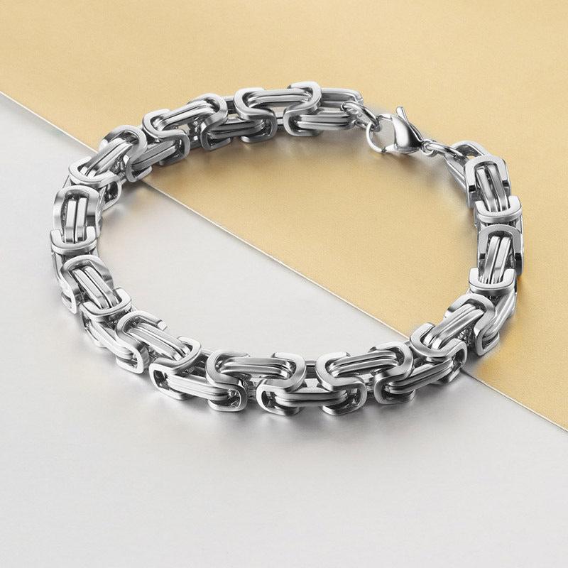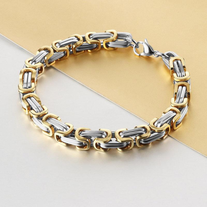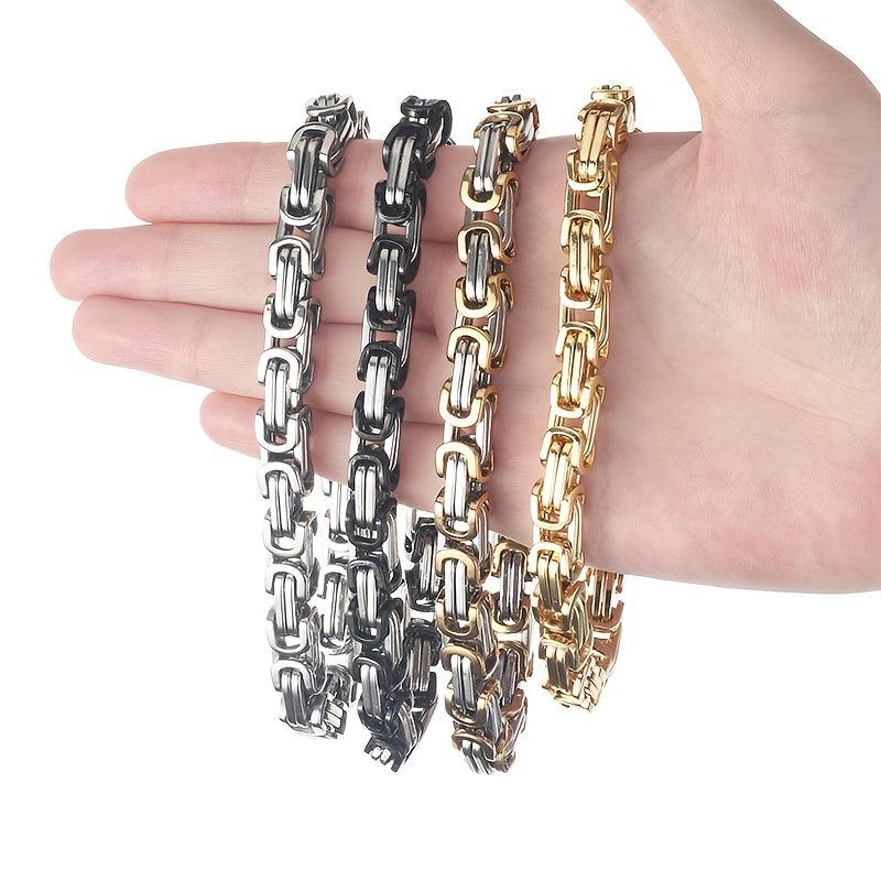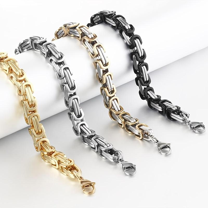 Elevate your style with this sturdy stainless steel bracelet featuring a Byzantine box chain design in golden and silver tones. Perfect for a hip hop look.