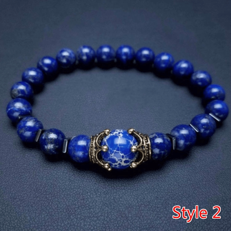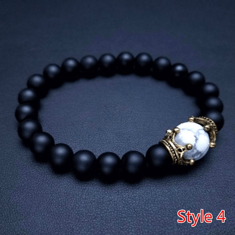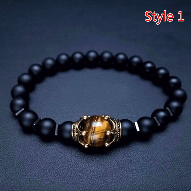 Add a touch of regal charm to your style with this men's bead bracelet featuring antique crown design and tiger eye stone beads. A stylish and unique accessory for any outfit.