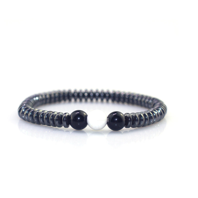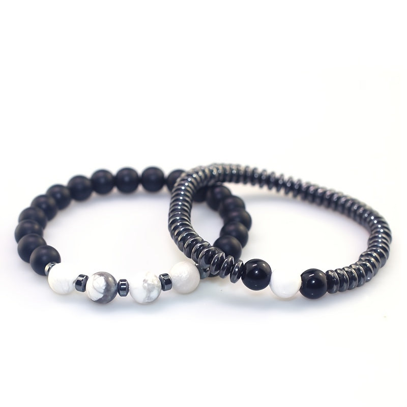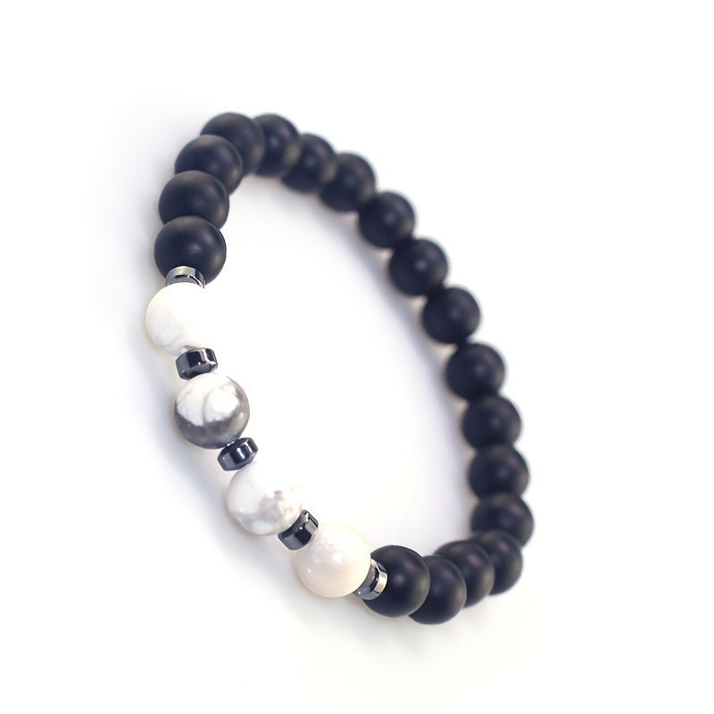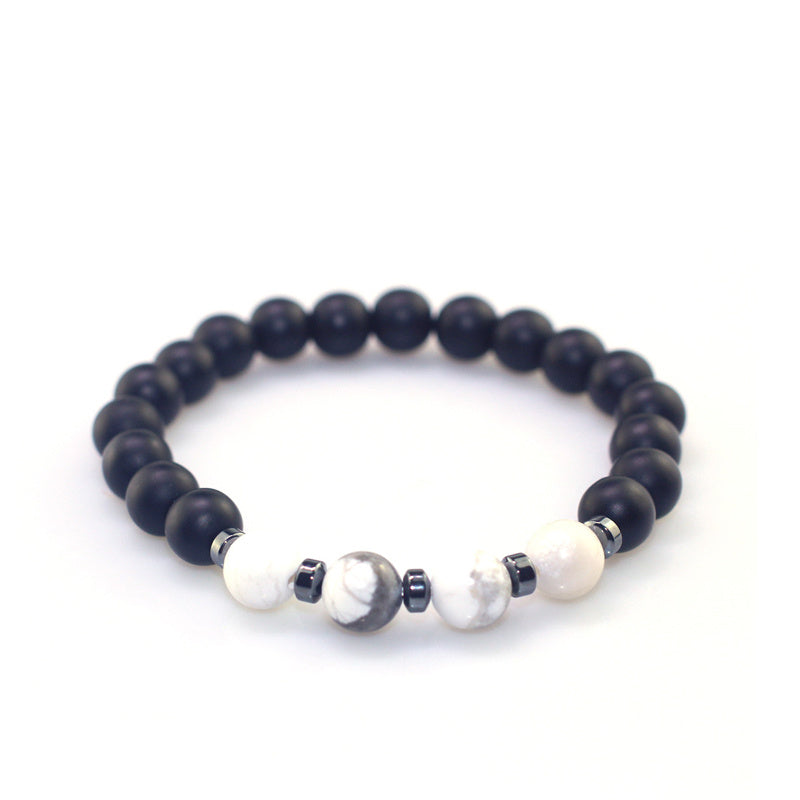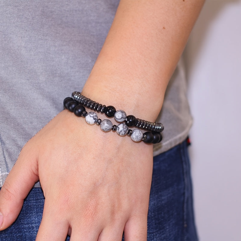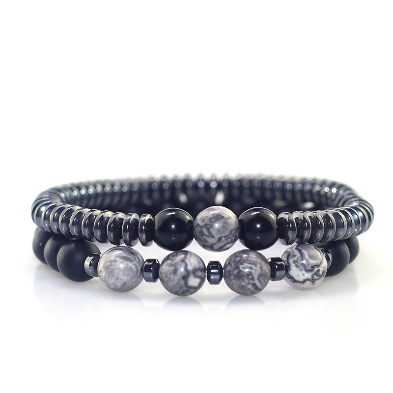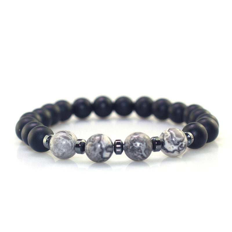 This men's bracelet features a combination of map stone, frosted stone, and beads for a unique and stylish look.