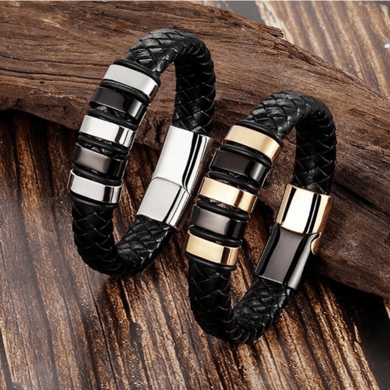 This stylish leather bracelet features a braided design with a magnetic clasp for easy wear. Made with stainless steel in silver and golden colors, this bracelet is a great gift option for men.