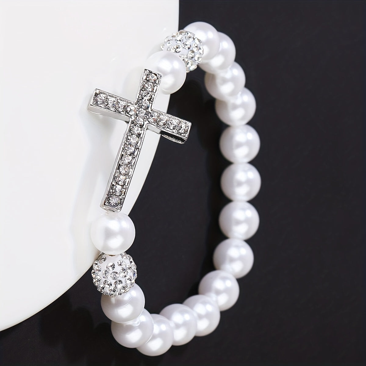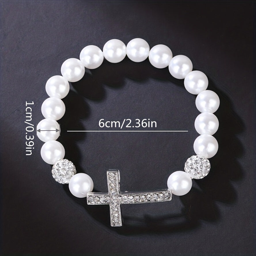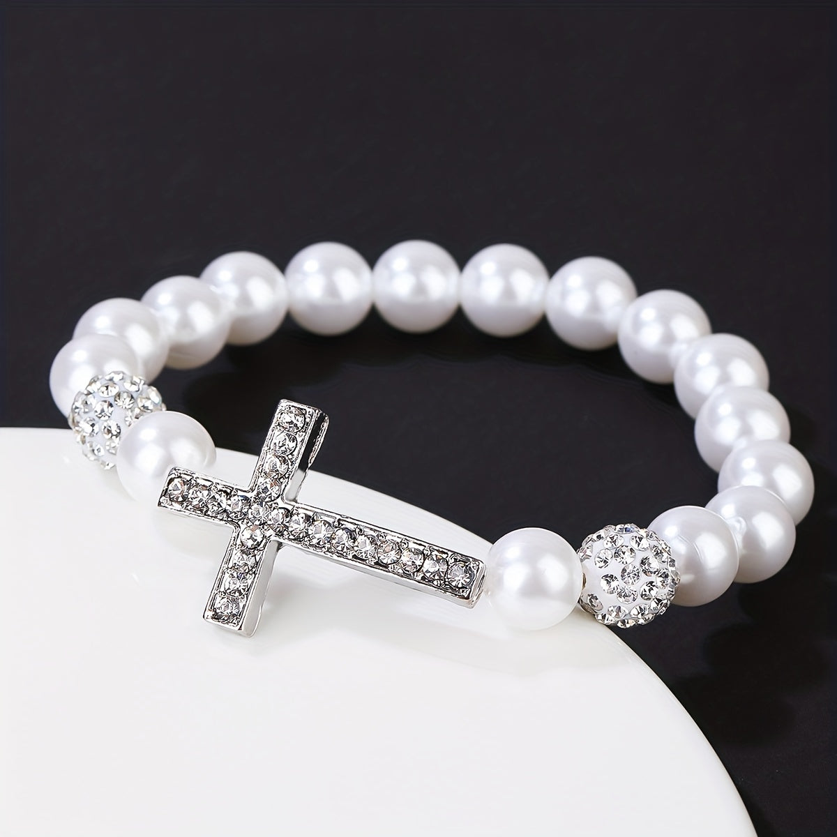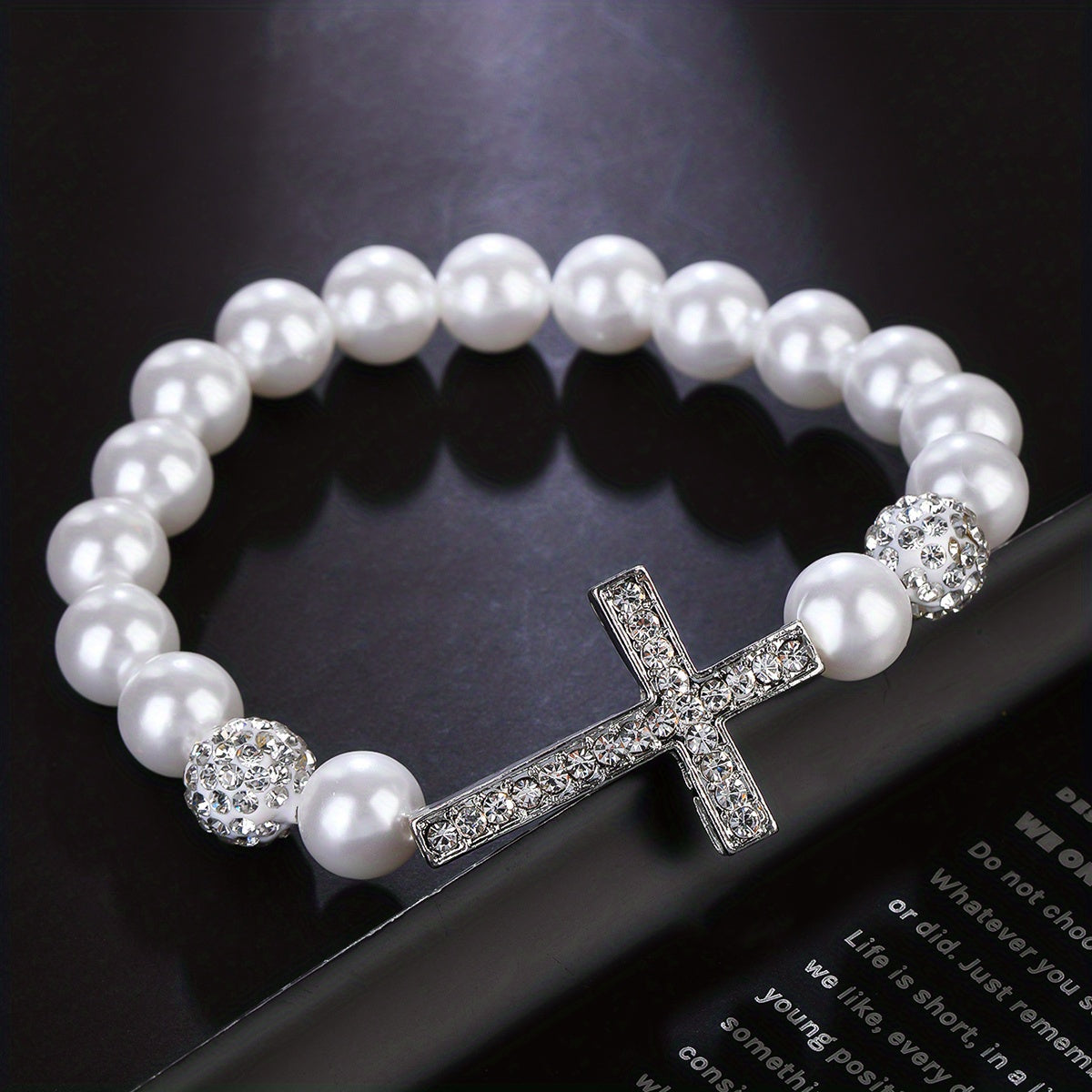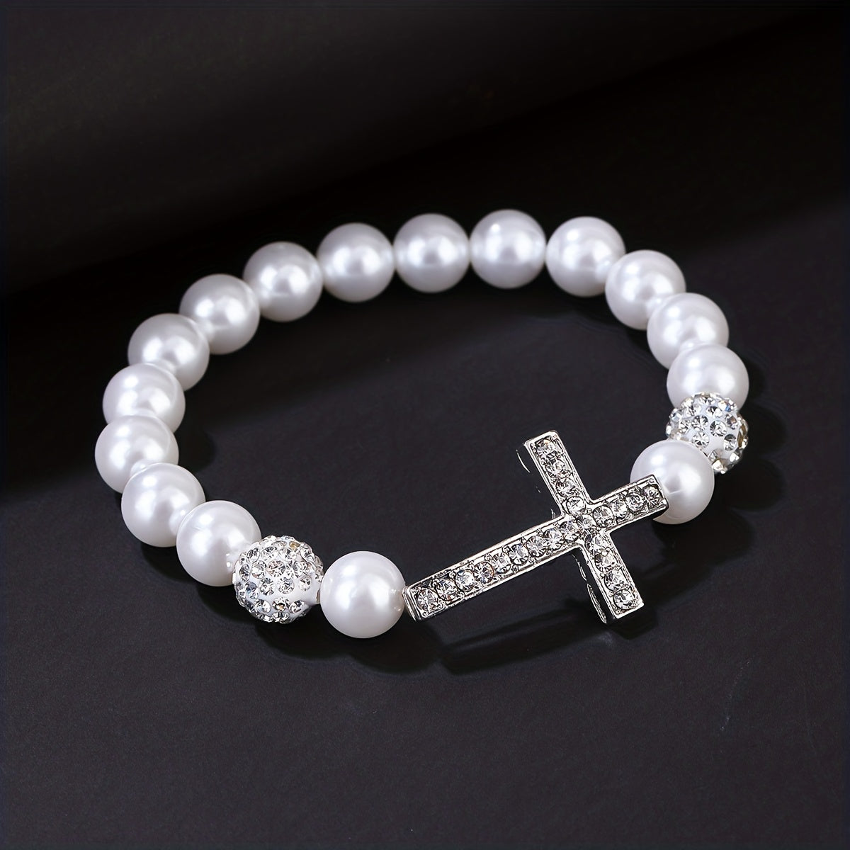 Enhance your look with this stylish men's bracelet featuring a metal diamond cross, round beads and faux pearl accents. The elastic design ensures a comfortable fit.