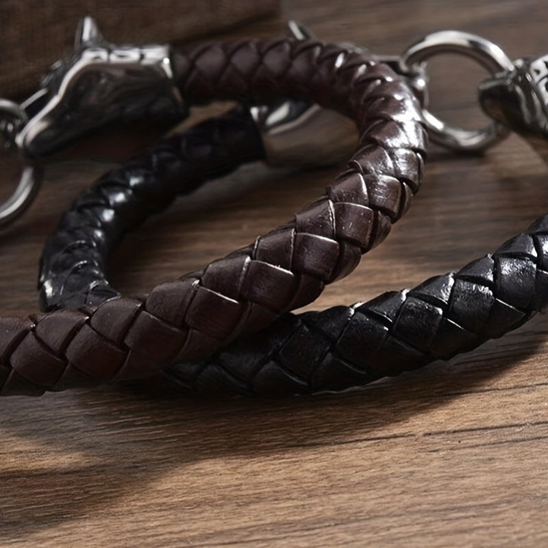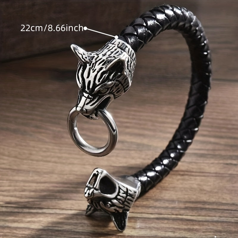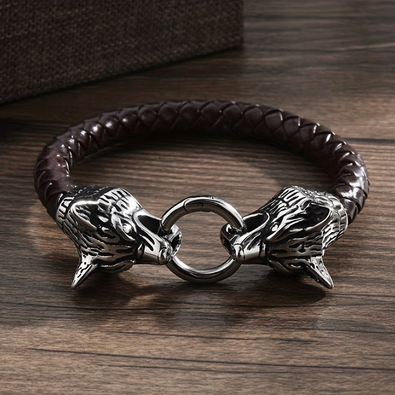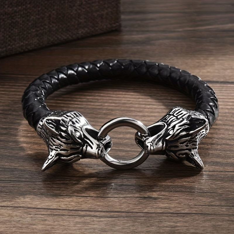 This bracelet combines a vintage feel with a modern edge, featuring double wolf head design. It is made of PU leather and woven leather rope, perfect for motorcycle enthusiasts.