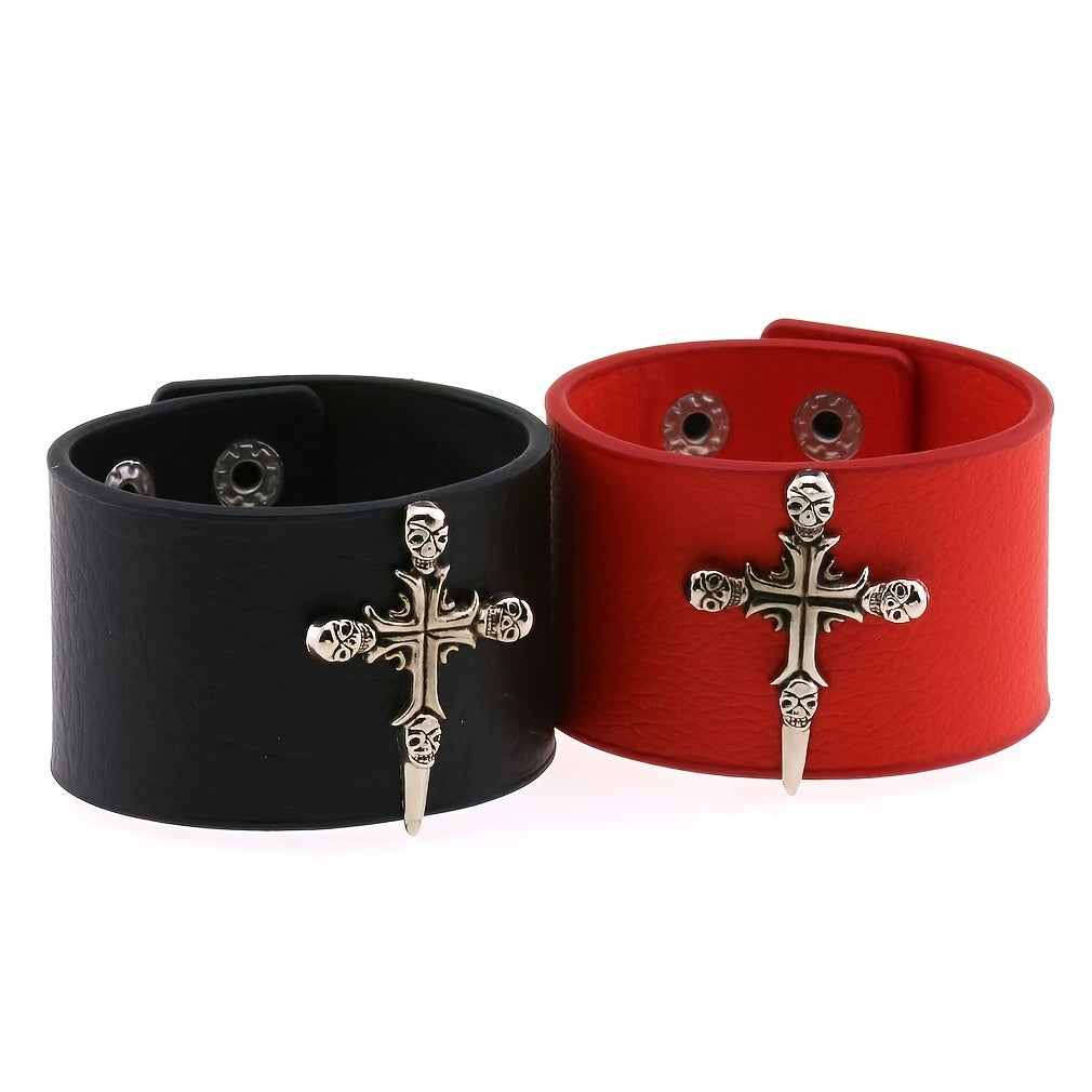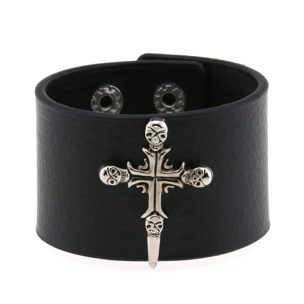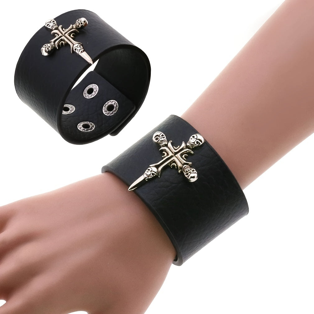 Men's Skull Head Wide Bracelet Punk Gothic PU Leather Cross Bracelet