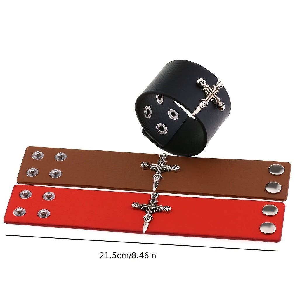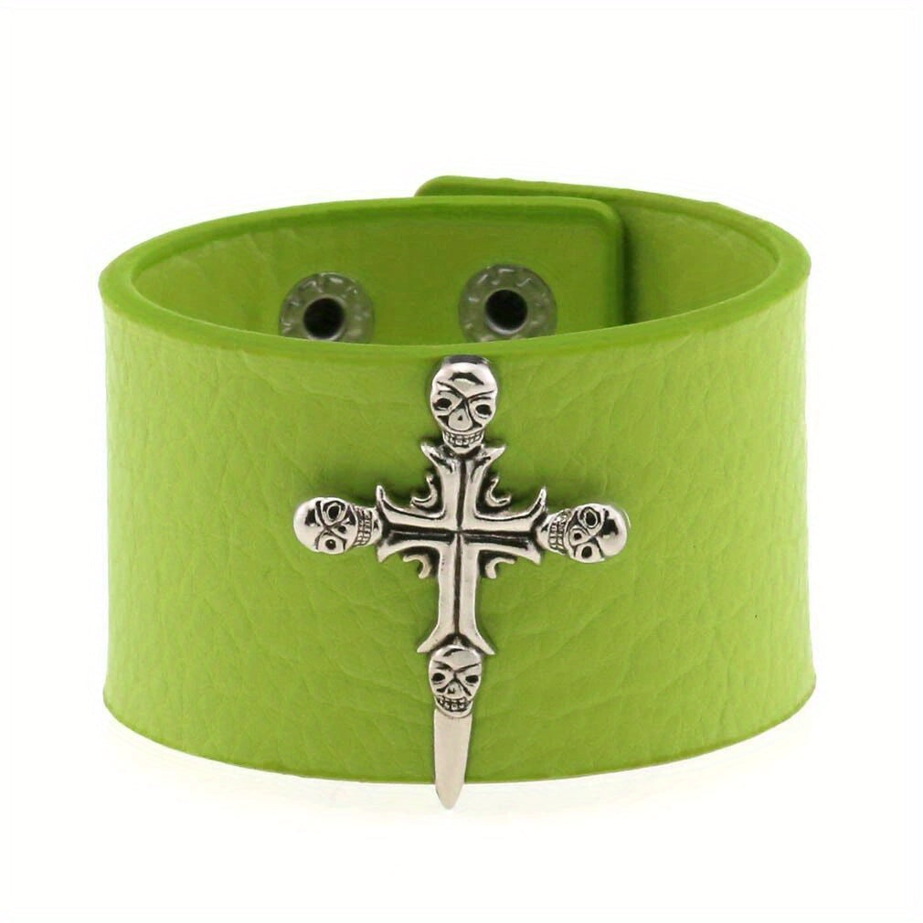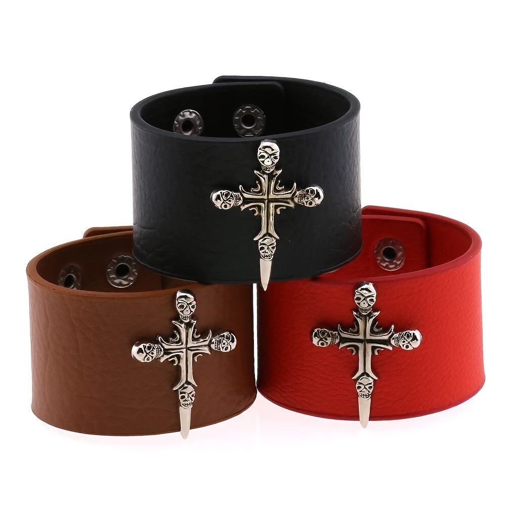 Men's Skull Head Wide Bracelet Punk Gothic PU Leather Cross Bracelet