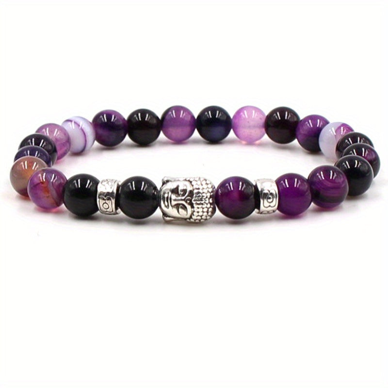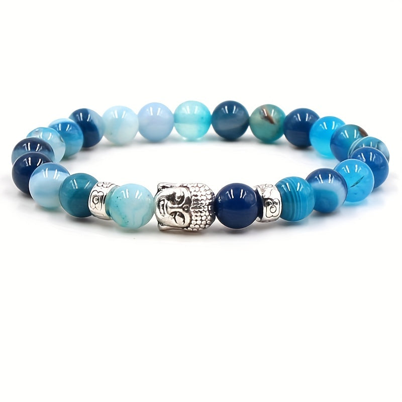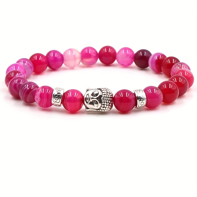 This stylish bracelet features natural agate beads with a Buddha head accent. Perfect for yoga practice or casual wear.