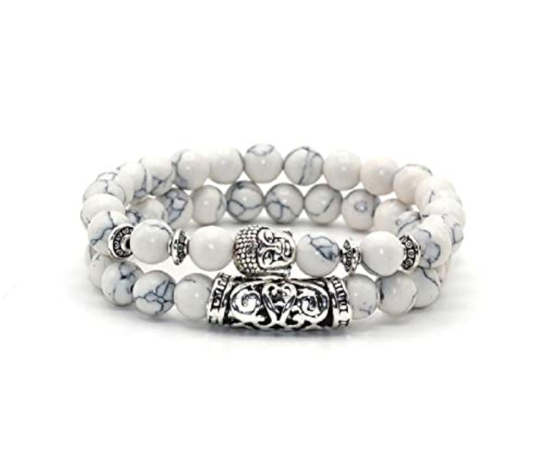 Embrace tranquility with these Howlite multilayer Buddha bead bracelets. Handcrafted from natural stone, these bracelets bring a touch of serenity and style to your look.