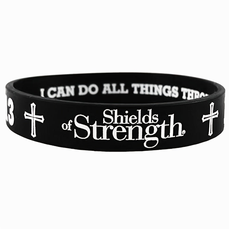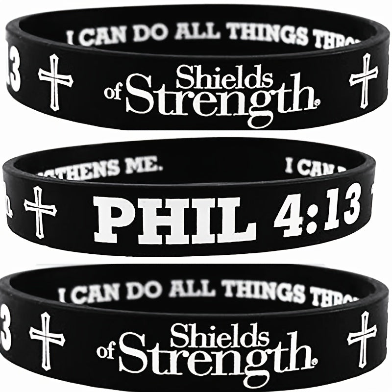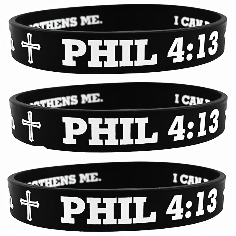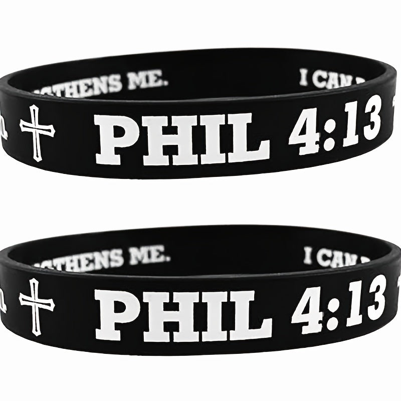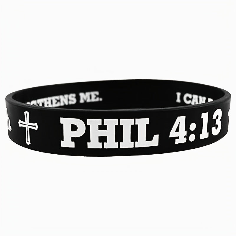 Wear your faith proudly with this silicone rubber bracelet featuring scripture from Philippians. This inspirational bracelet is a perfect reminder of God's strength.