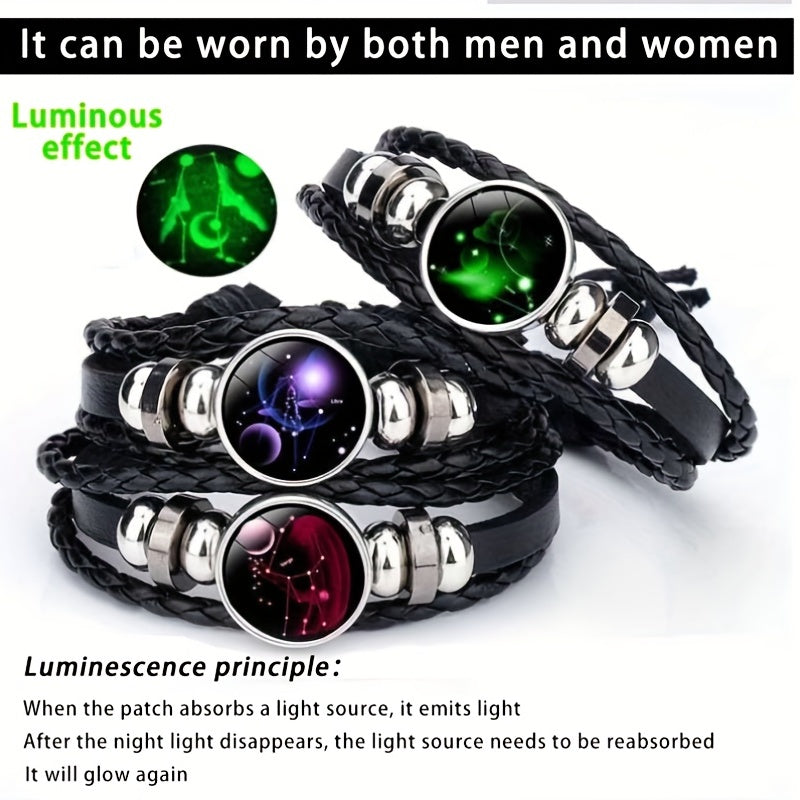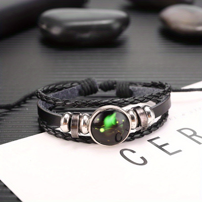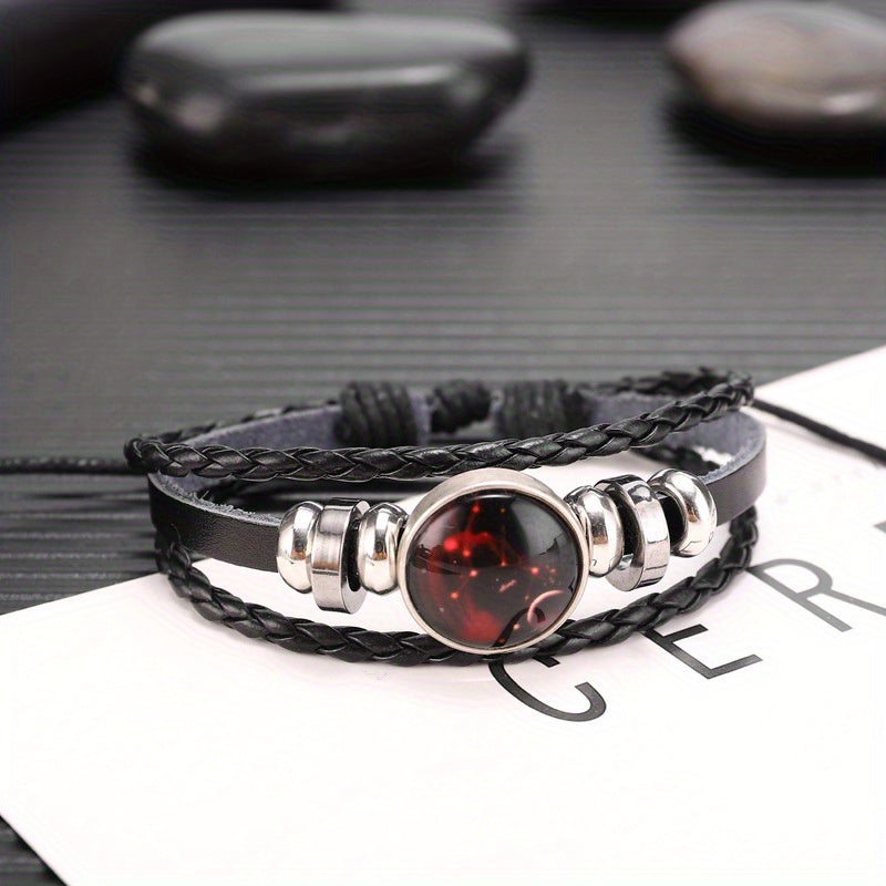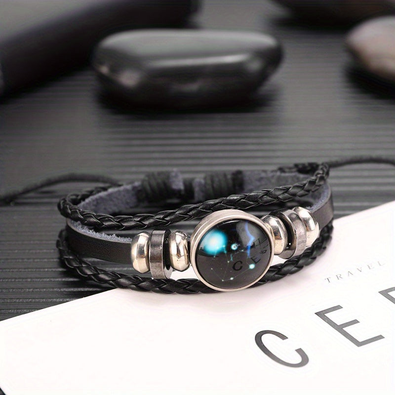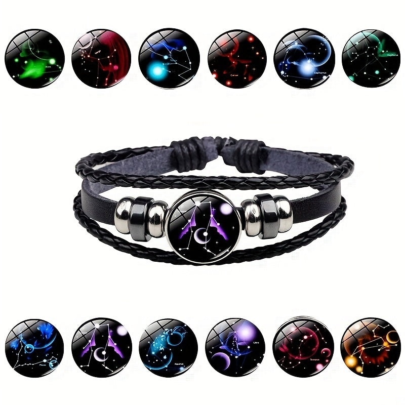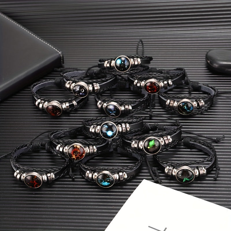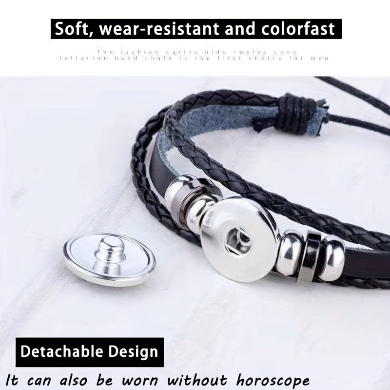 Cool Euro-American punk style leather bracelet with twelve zodiac constellations. Perfect for men and women.