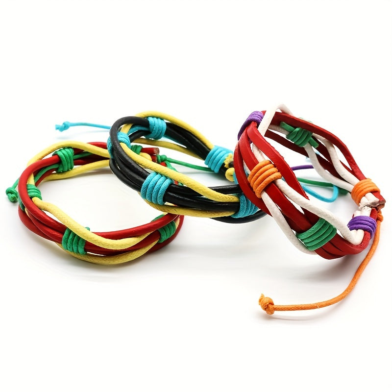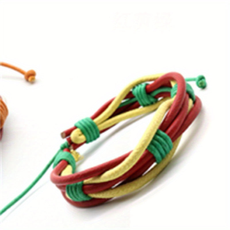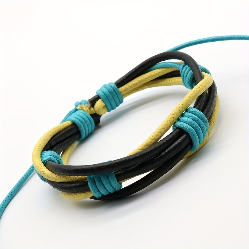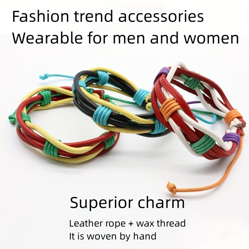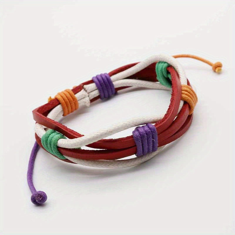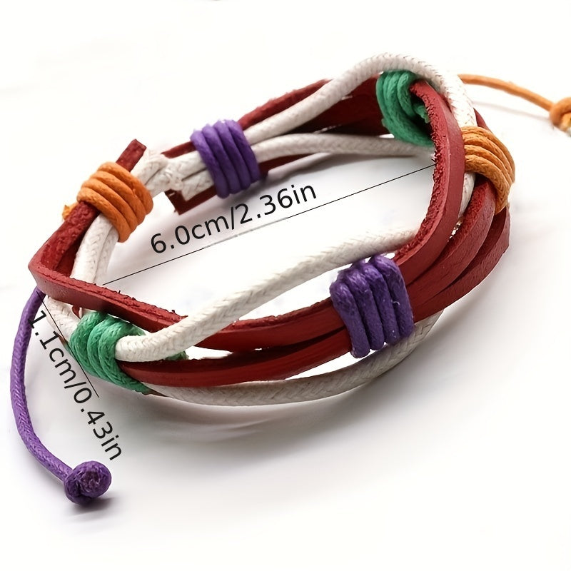 This multilayer bracelet features a colorful rainbow braided design with faux cowhide accents, perfect for adding an ethnic touch to your outfit. The wishing hand rope adds a unique and stylish element to the bracelet.