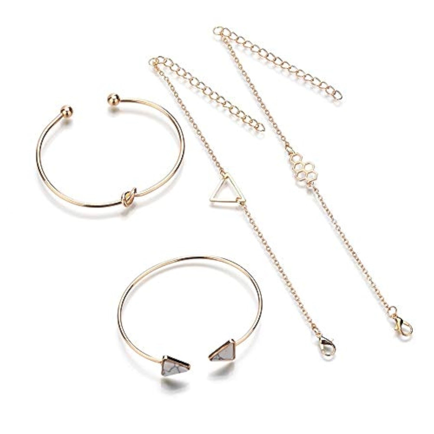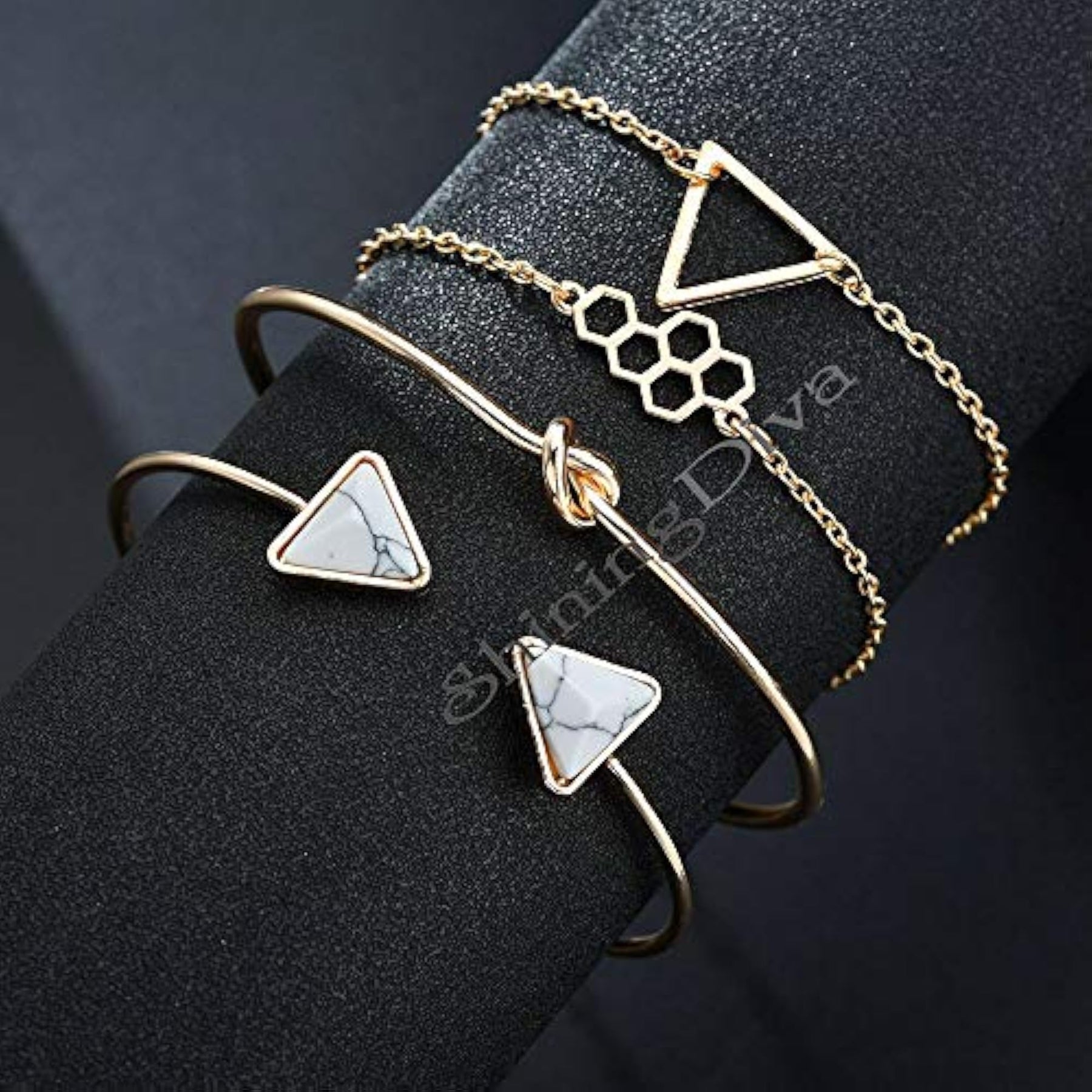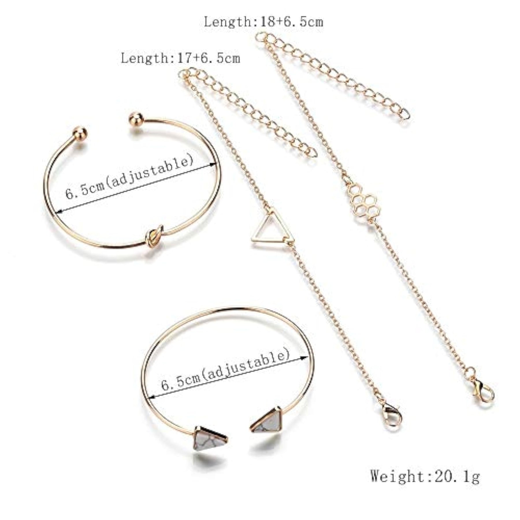 Beautiful set of 4 multilayer charm bangle plated bracelets for women. Elegant and trendy design that will complement any outfit.