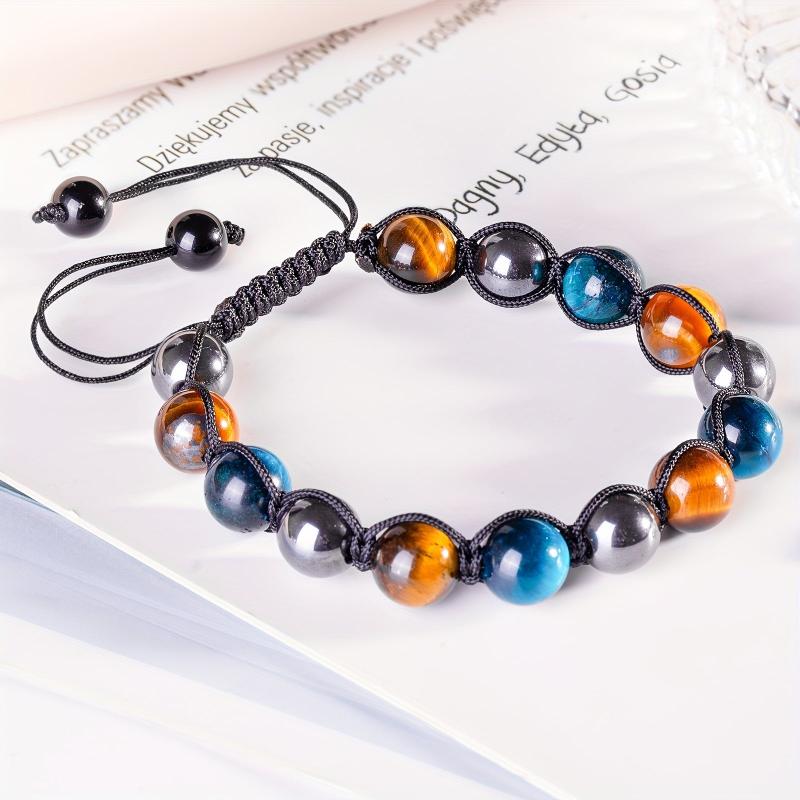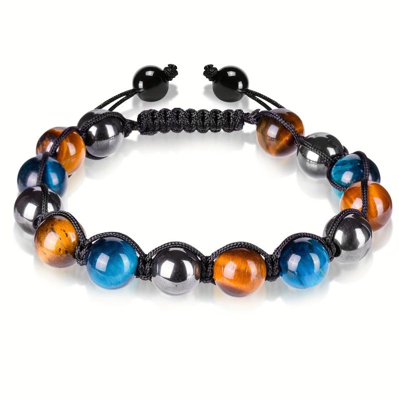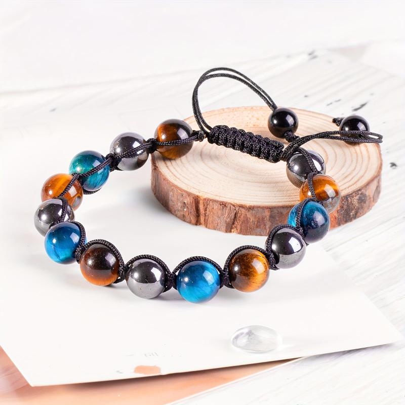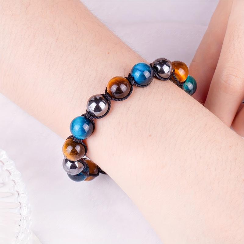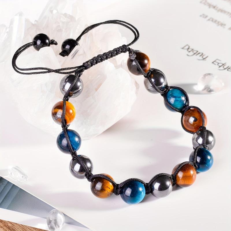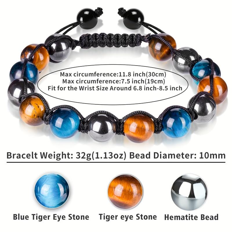 This bracelet features 8-10MM Hematite, Agate, and Tigers Eye stones that bring luck, prosperity, and harmony. It provides triple protection and healing energy.