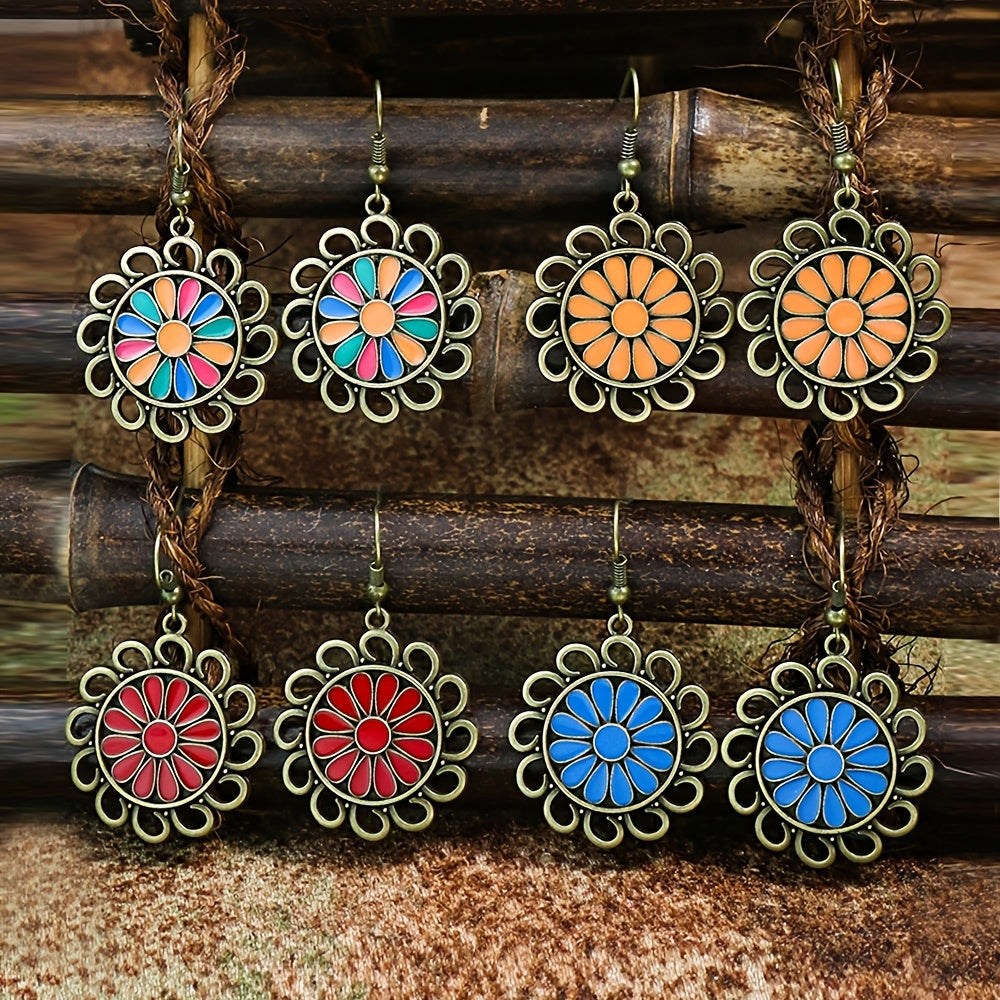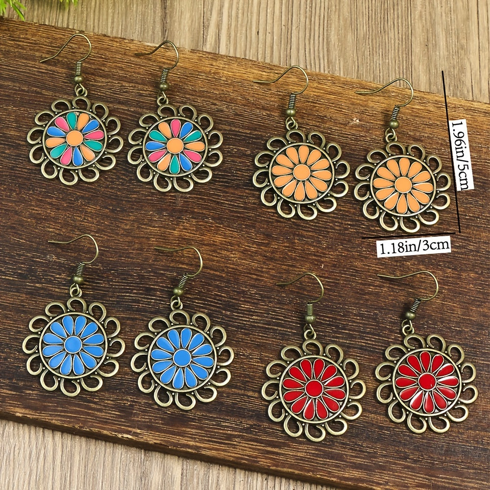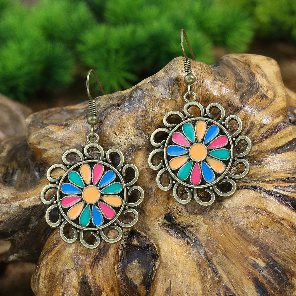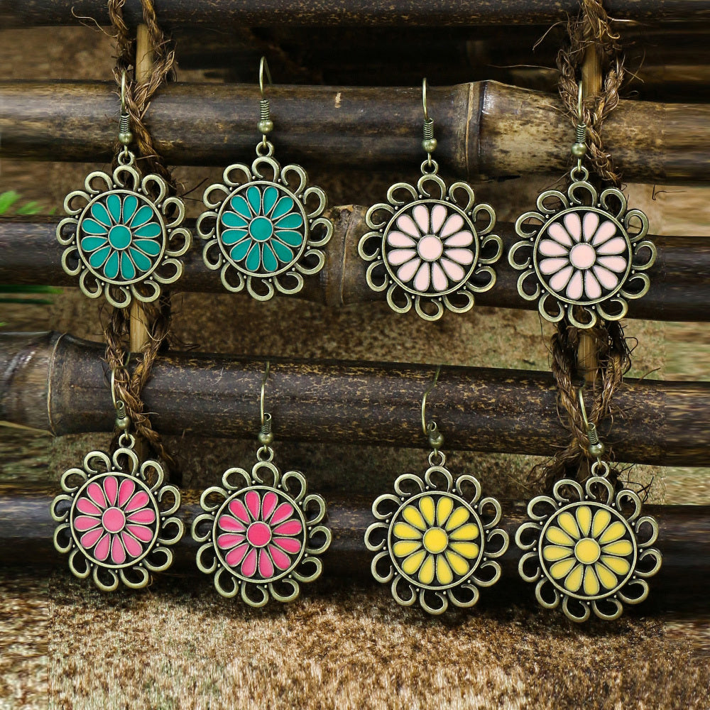 Complete your summer beach look with these vintage boho style drop earrings featuring sunflower shape pendants. Perfect holiday accessory for your beach clothing.