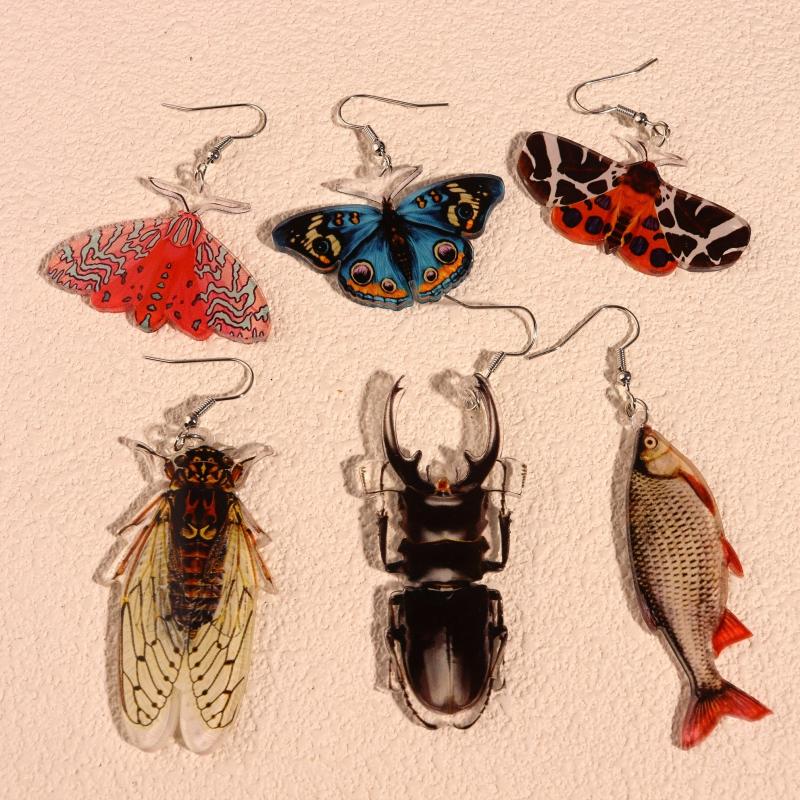These acrylic earrings are a unique and stylish gift for women and girls. The design features butterfly, cicada, beetle, and fish dangles.