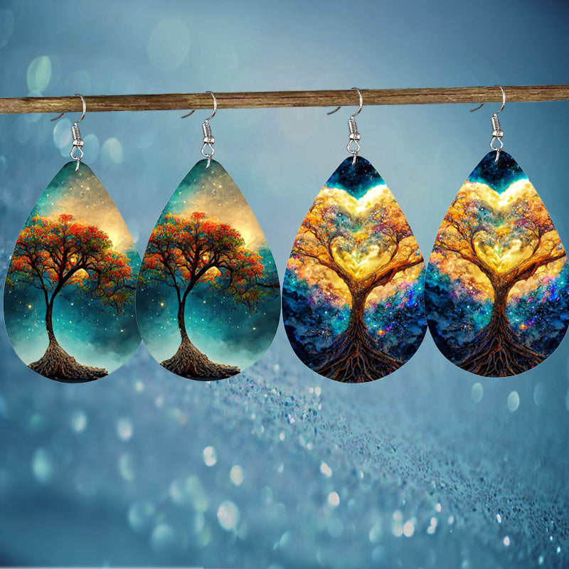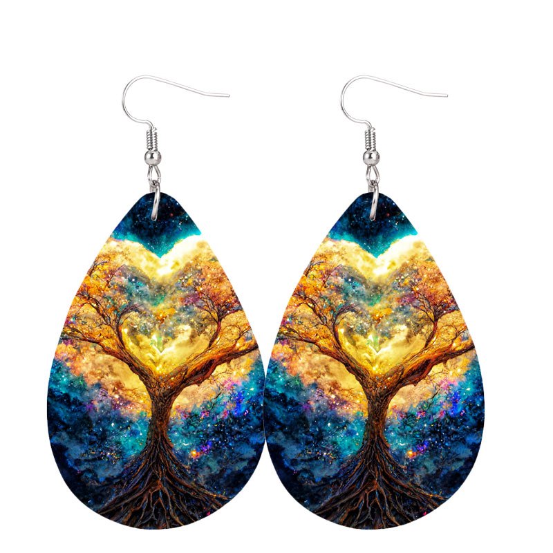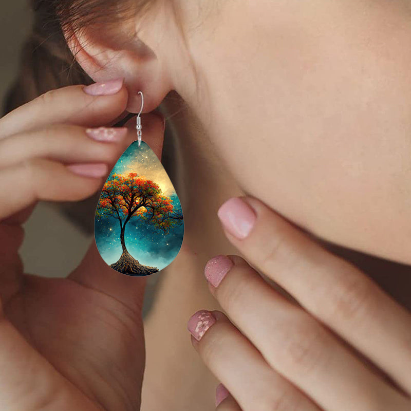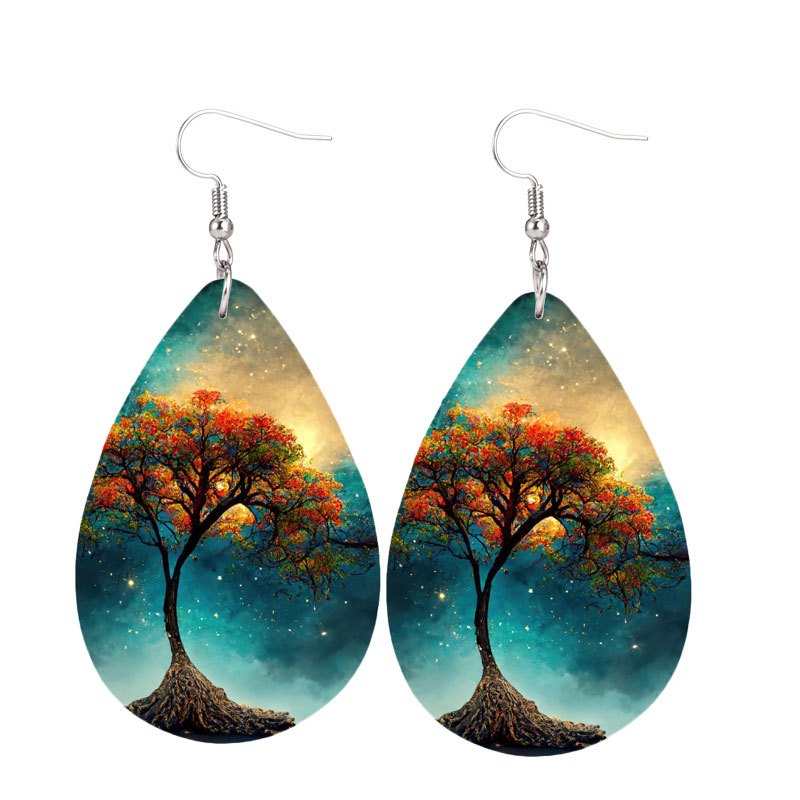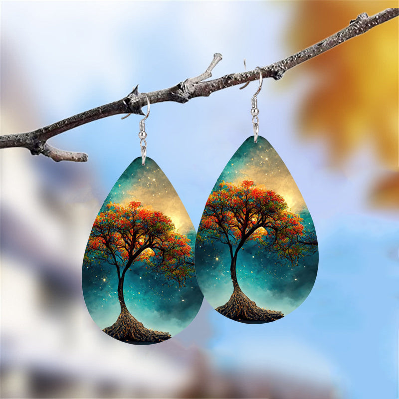 These stylish teardrop dangle earrings feature a colorful tree print design, perfect for adding a bohemian touch to your look. Made of high-quality PU leather, these earrings are a delicate gift for women and girls.
