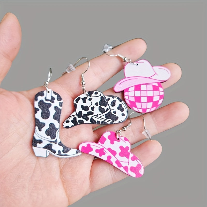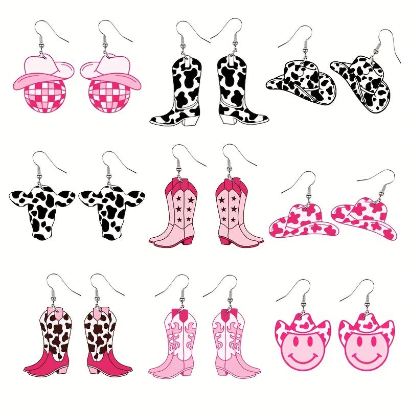 These earrings are a perfect gift for women and girls who love western style. The design features cowboy hat, boots, and bull head with a smiling face.