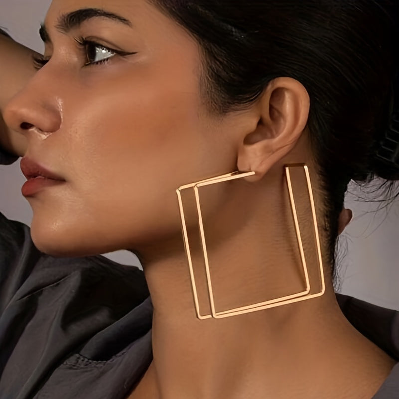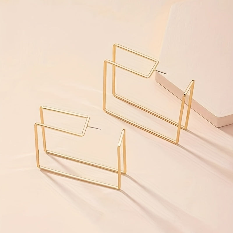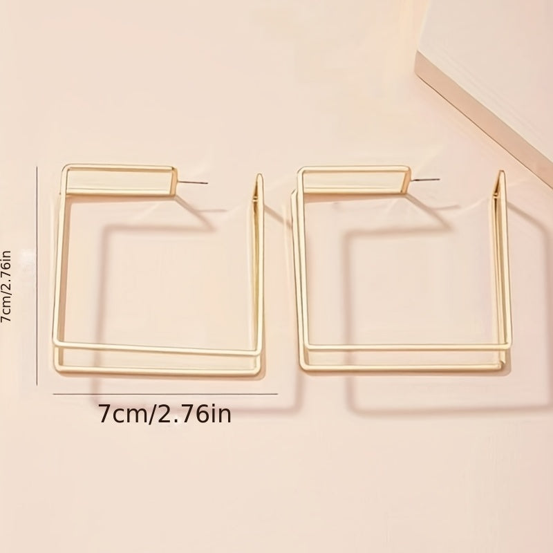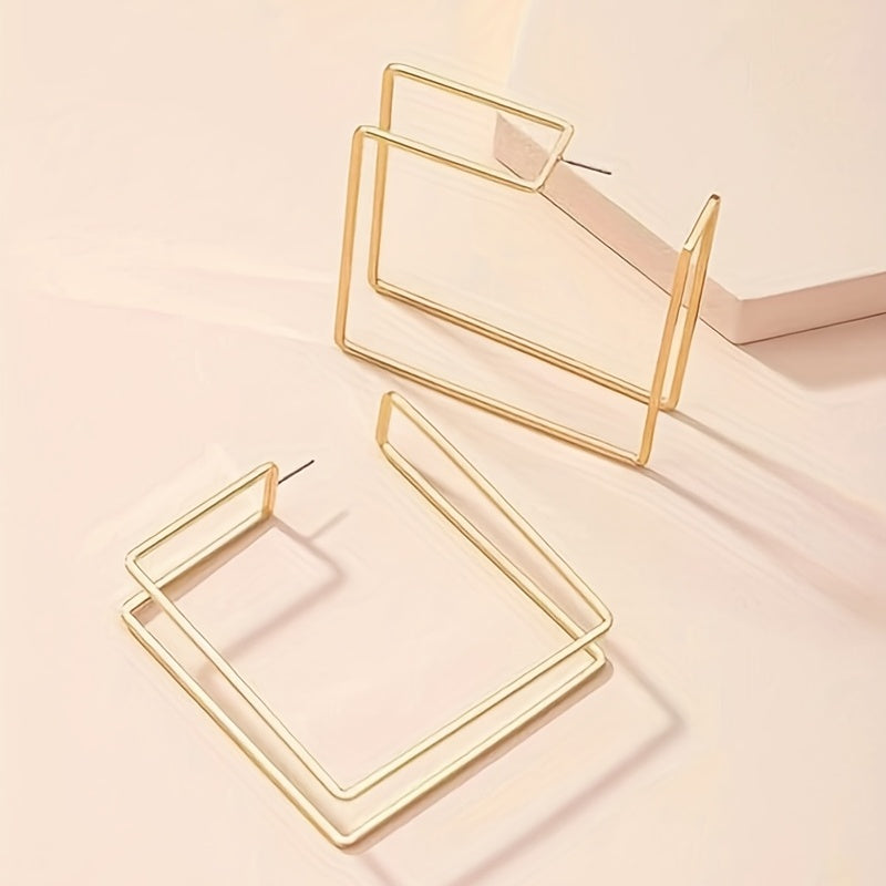 These trendy hoop earrings feature a double layer of golden hollow square shapes. They are perfect for adding a touch of glamour to any outfit, making them a great gift for any fashion-forward female.