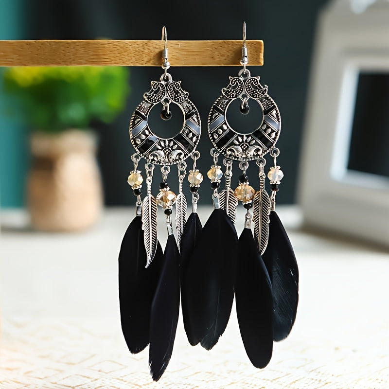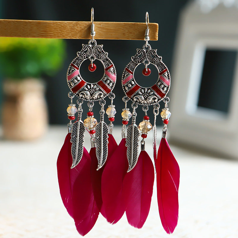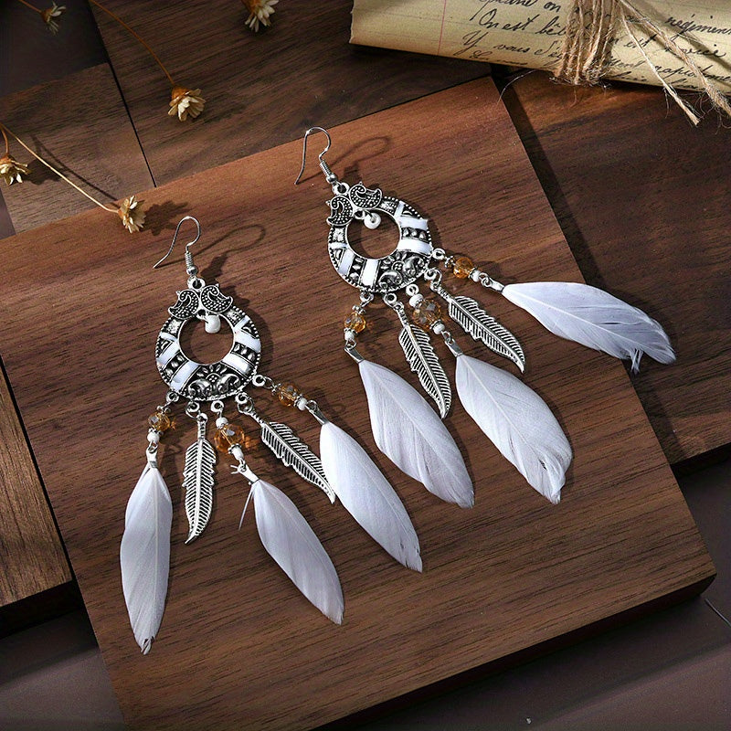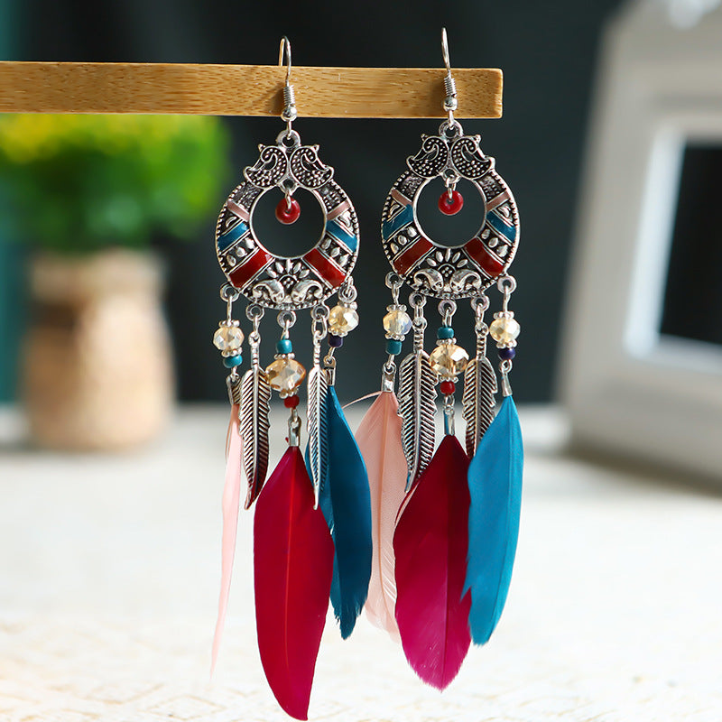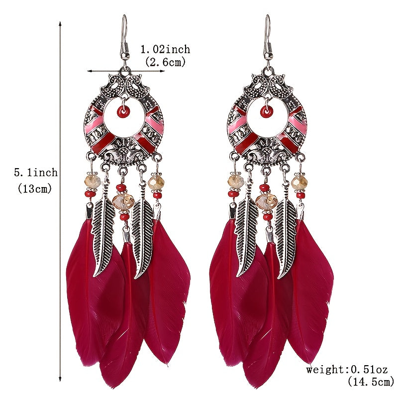 Add a touch of festive charm with these long leg feather earrings featuring colorful embroidery, perfect for holiday gatherings.