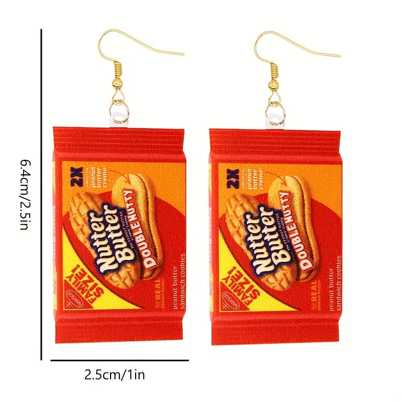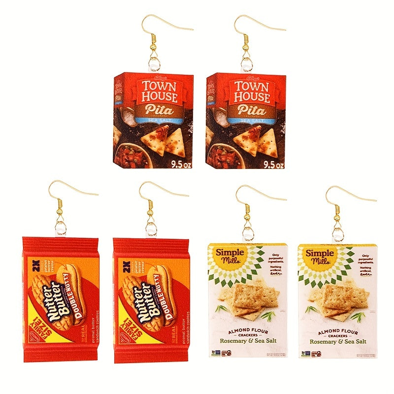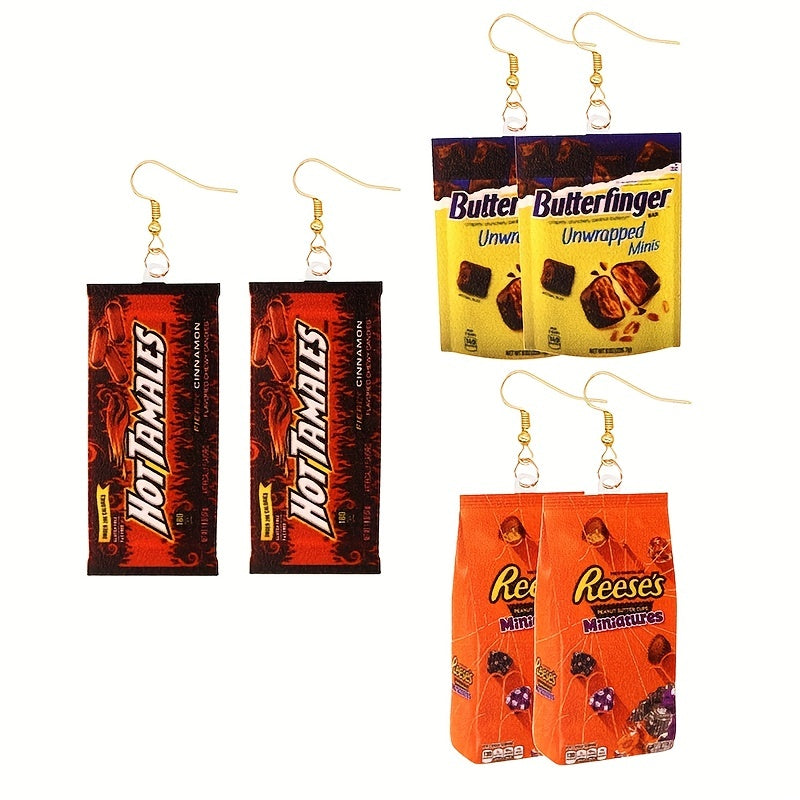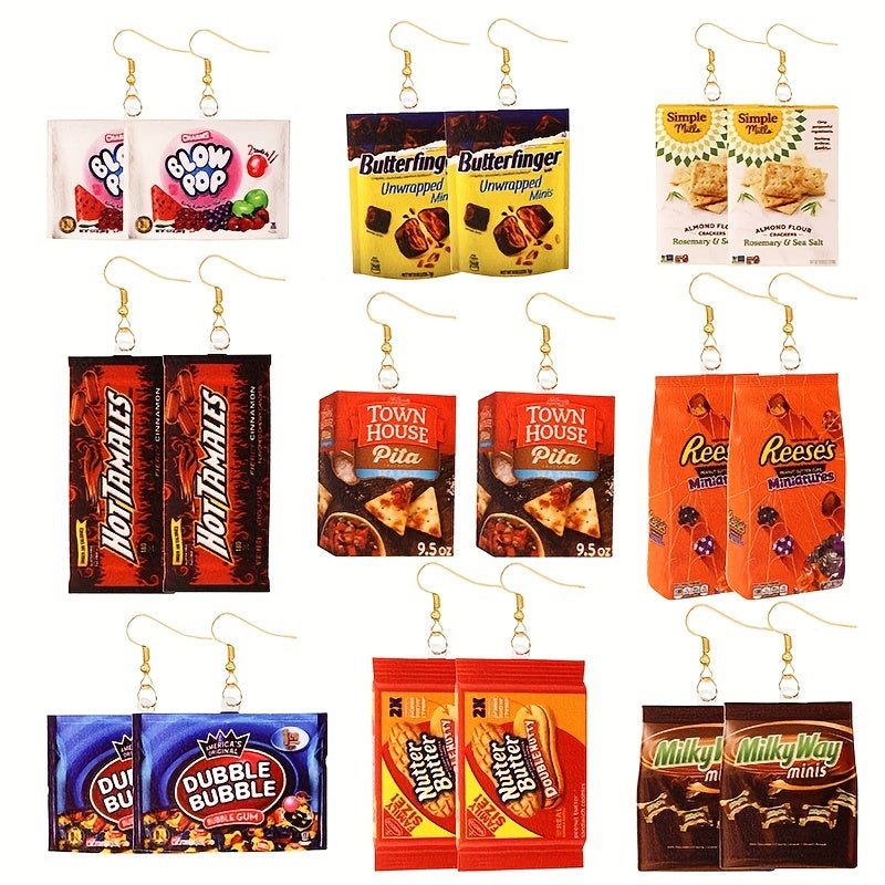 These adorable snack bag dangle earrings are perfect for anyone who loves fun and unique jewelry. Made of acrylic, they feature designs of chips, candy, cookies, and chocolate bags, adding a playful touch to any outfit.