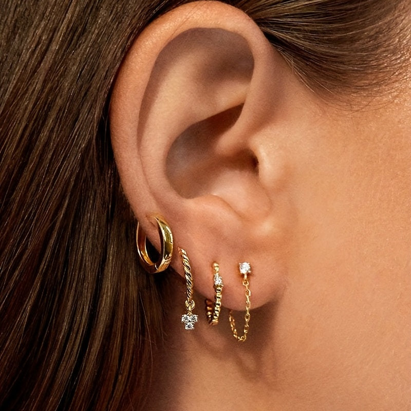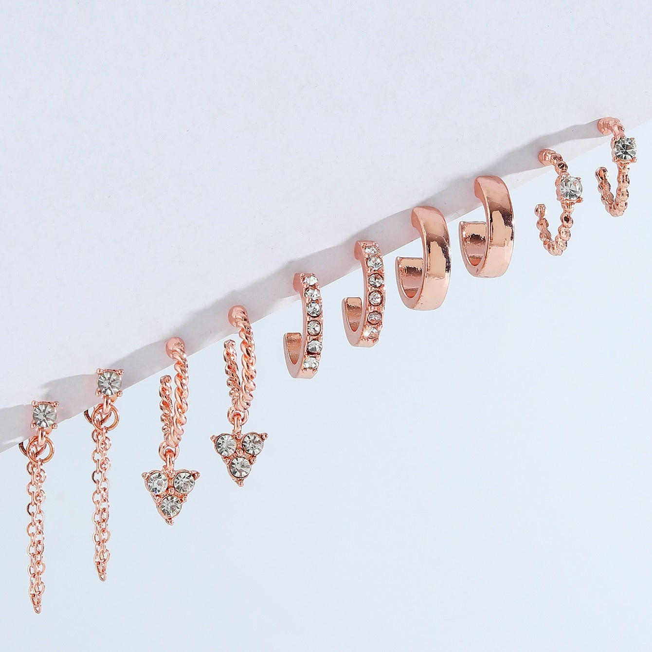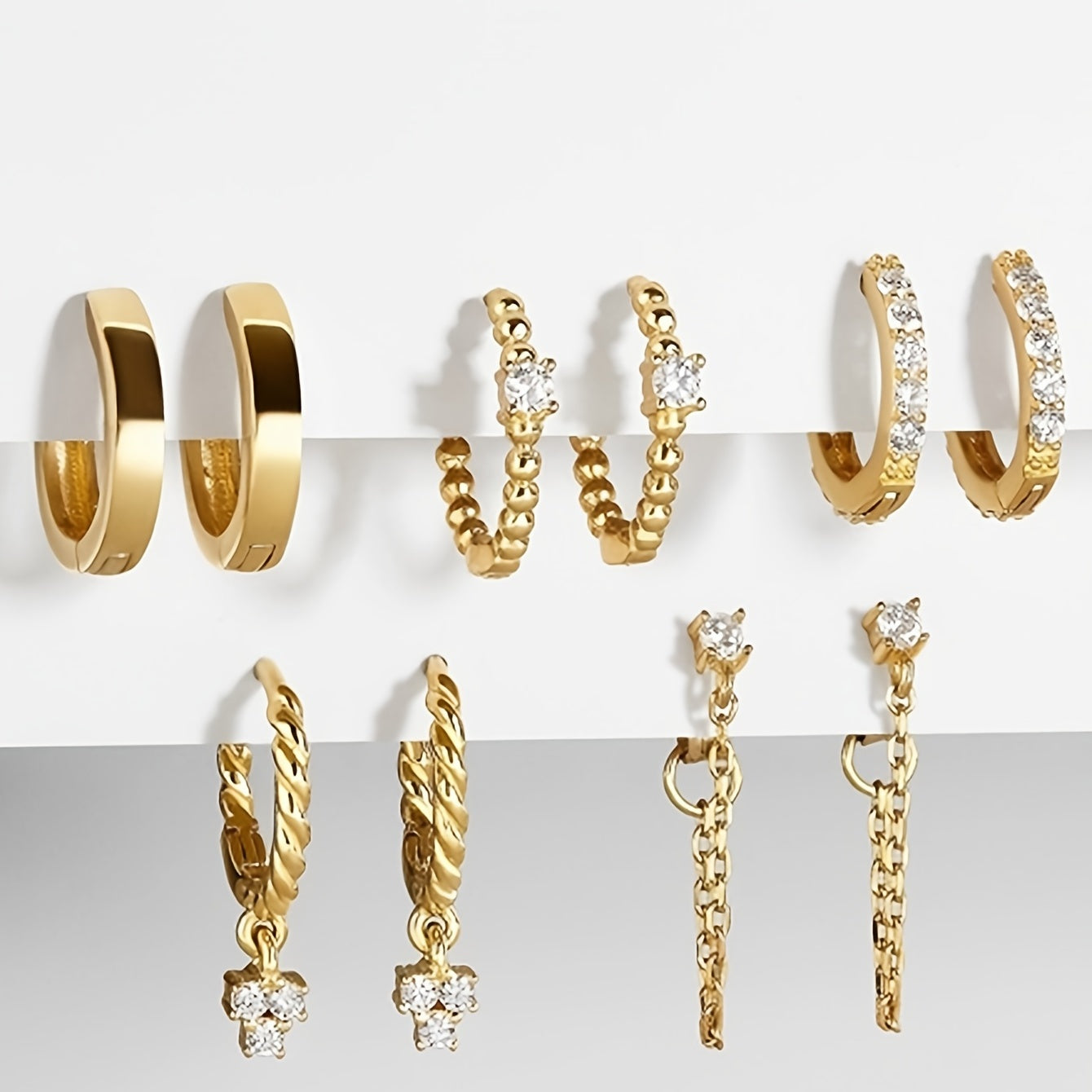 Add a touch of elegance to your outfit with this set of 5 pairs of geometric chain earrings. Made with 14K gold plating, these earrings are perfect for any occasion.